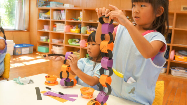 園での様子 ハロウィン sumiredaihp 2021年10月28日 今日は、手作り衣装を着て楽しいハロウィンパーティー! 朝から職員の仮装に驚きながらも気分は高まっていました。「私は魔女だよ」「ぼくは忍者」と自分の衣装を嬉しそうに友だちに見せて話していました。すみれっ子で行ったハロウィンパーティーでは、ダンスをしたりハロウィンの〇×クイズをしたり楽しく過ごしました。「トリック・オア・トリート」の合言葉を言えた子どもたちには素敵なプレゼントも!今年のハロウィンは日曜日。作った衣装を着ておうちでも素敵な日を過ごしてくださいね。