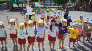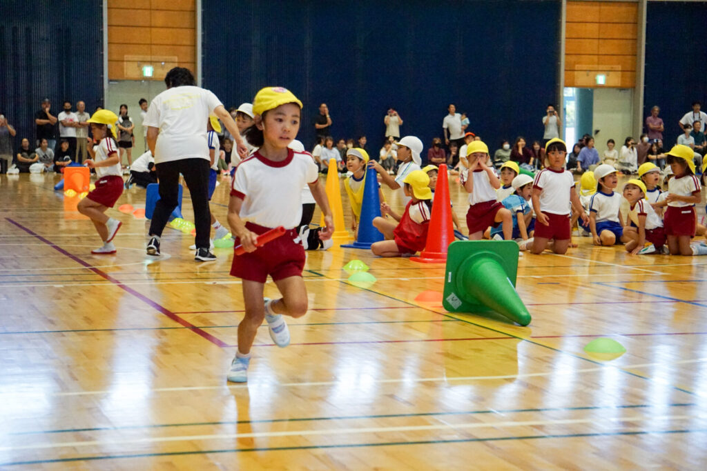 年長つき組さんにとって、幼稚園の最後の運動会でした。「台風の目(嵐に耐えろ!)」は、誰がコーンの近くで回るのか話し合い、繰り返し遊んだことで、勢いもついてきました。おうちの方との競技もとても楽しみにしていて、「キリン」を落とさずに運ぼうとする姿がとてもかっこよかったです!