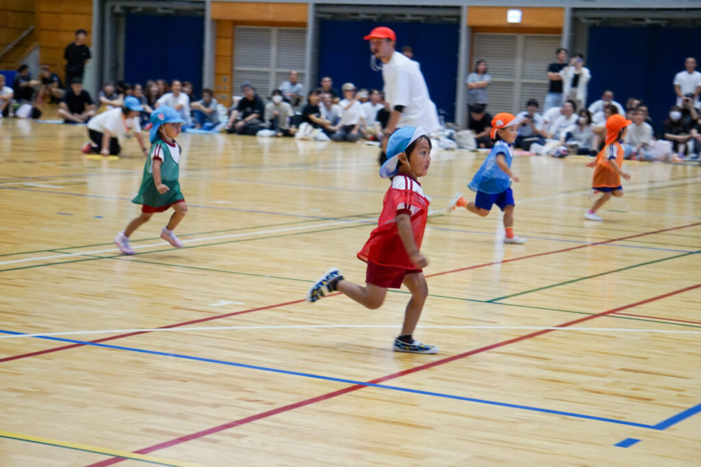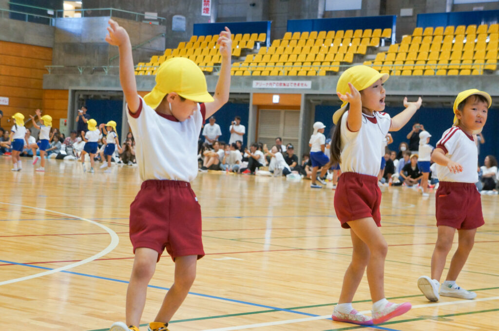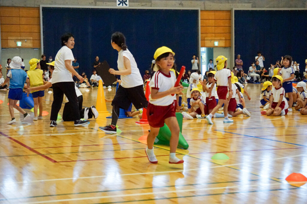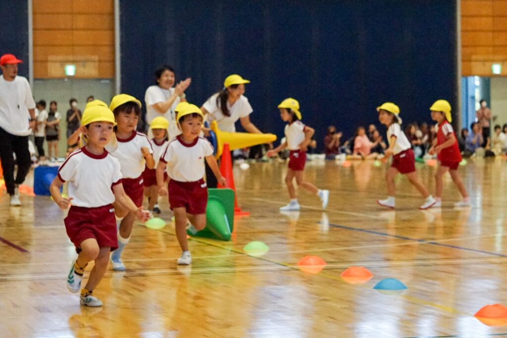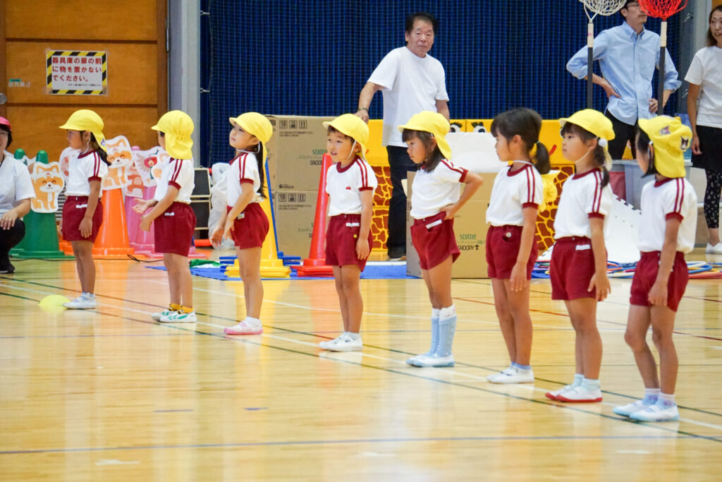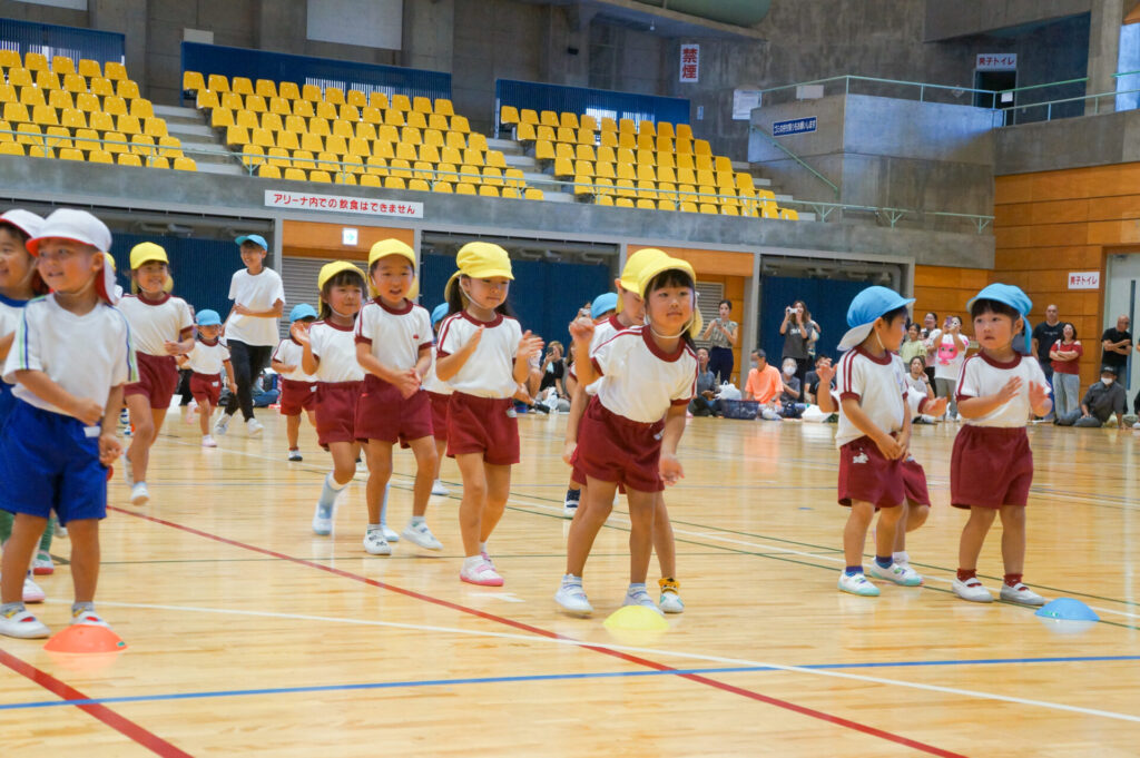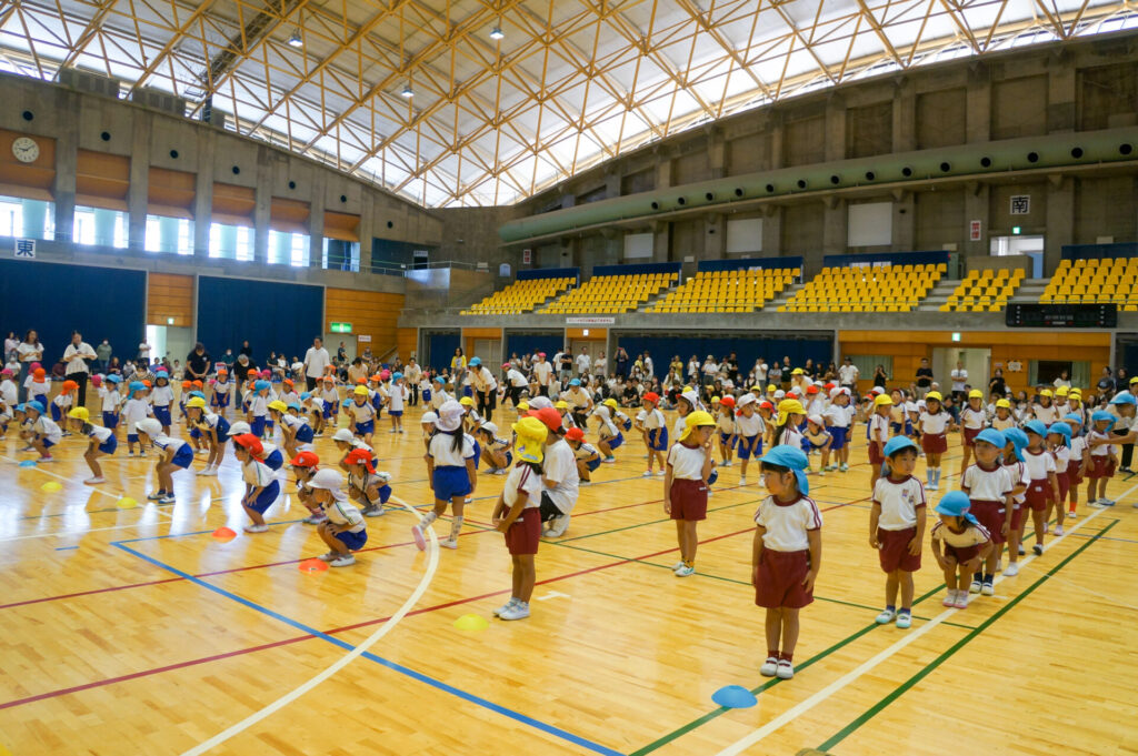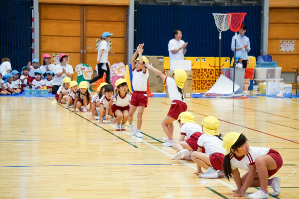 今年もまどか幼稚園・すみれ台幼稚園合同でシーガルドーム:メインアリーナにて運動会を行いました。「動物」をテーマに、年長つき組は「サメチーム」、年少ゆり組は「いぬチーム」でのまどか幼稚園と対戦しました。