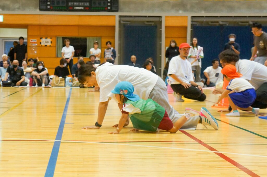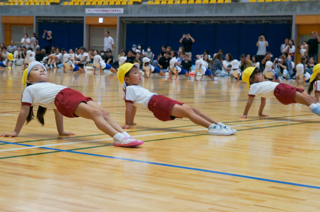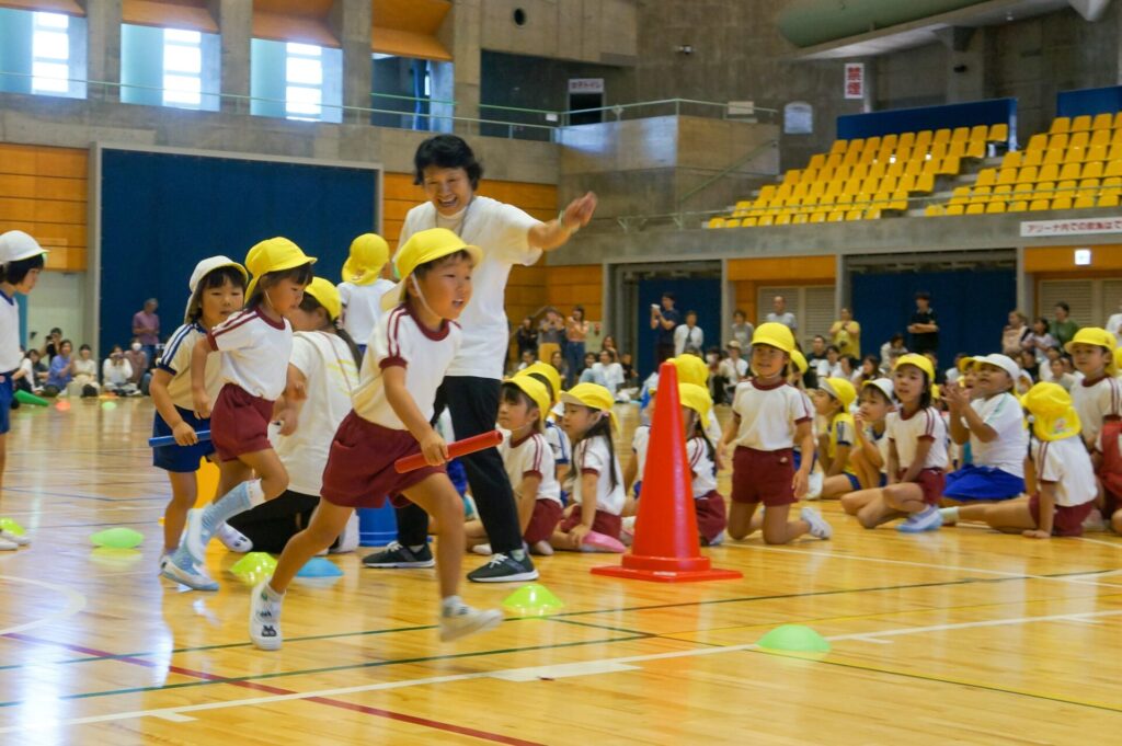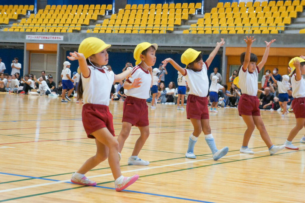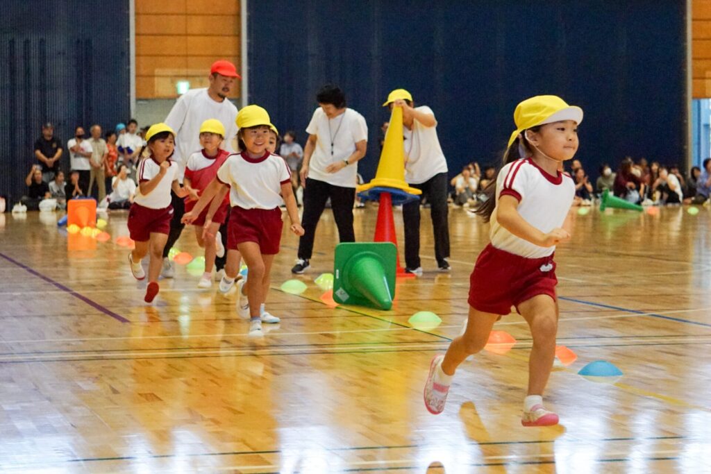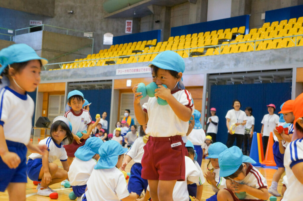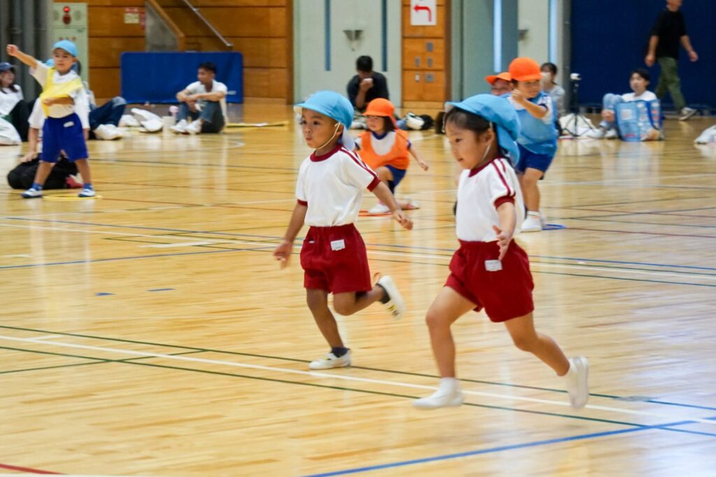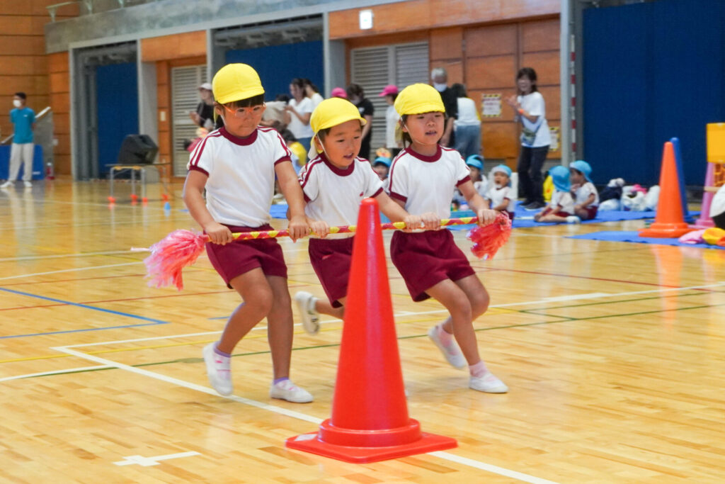 今年もまどか幼稚園・すみれ台幼稚園合同でシーガルドーム:メインアリーナにて運動会を行いました。「動物」をテーマに、年長つき組は「サメチーム」、年少ゆり組は「いぬチーム」でのまどか幼稚園と対戦しました。