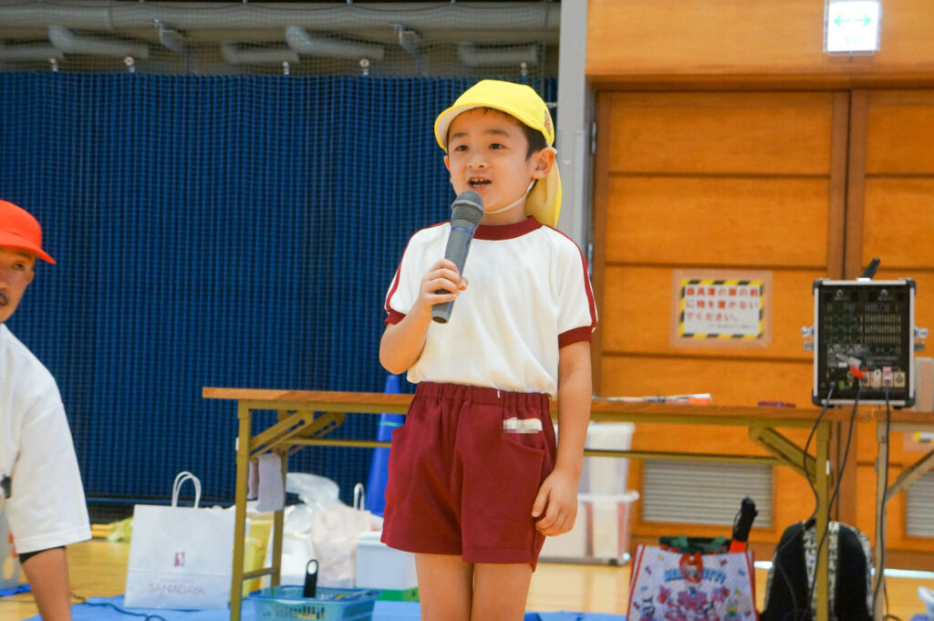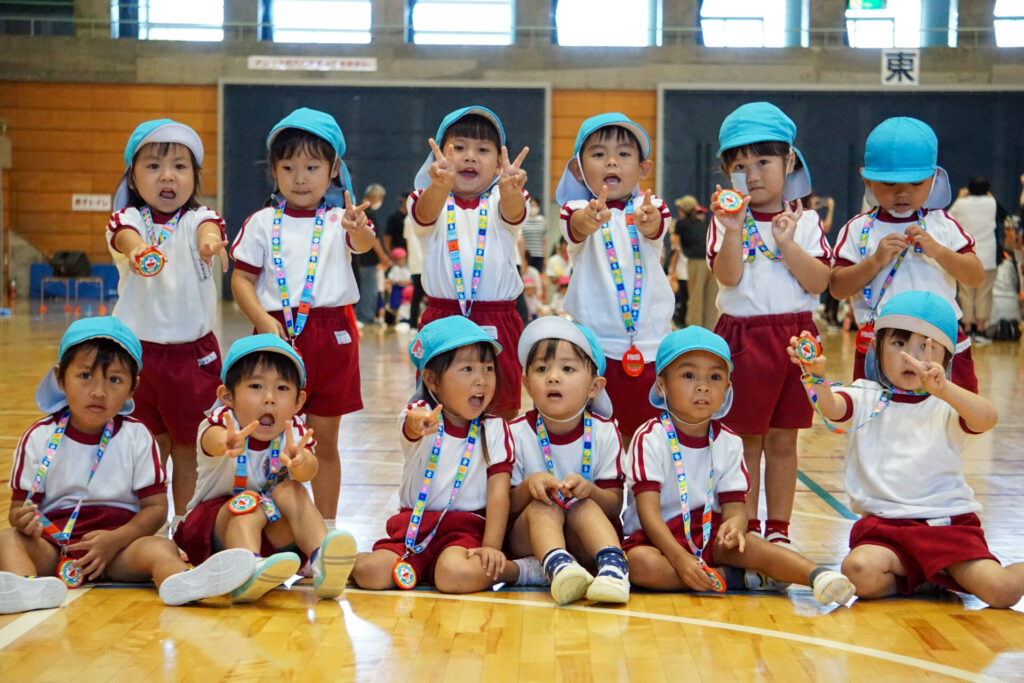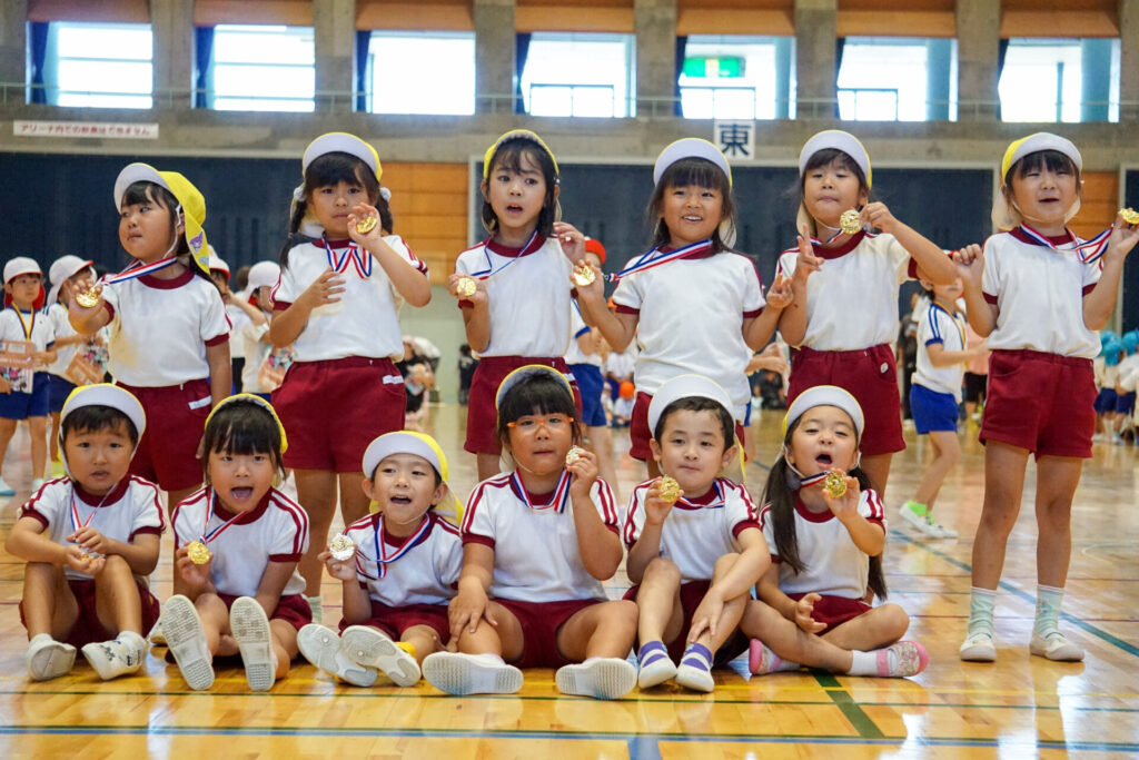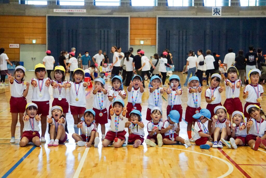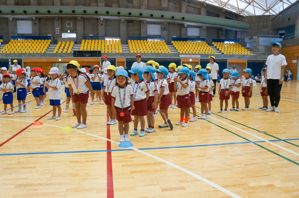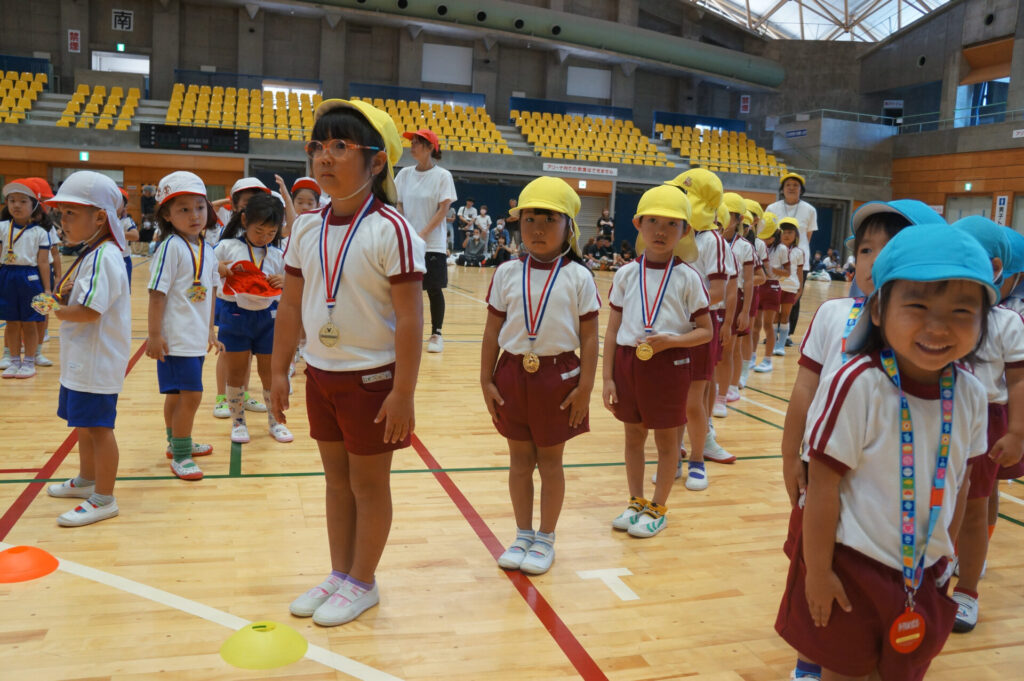 ドキドキわくわくの得点結果発表です。すみれ台幼稚園の「サメチーム」「いぬチーム」は堂々の2位!!あと少しのところで優勝はできなかったですが、みんなの頑張りがとても伝わってきました。そして、最後の最後まで頑張ったすみれっこ全員にはメダルの授与です。
