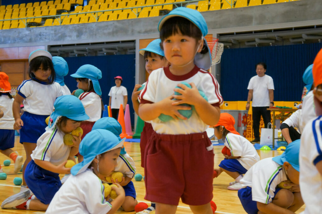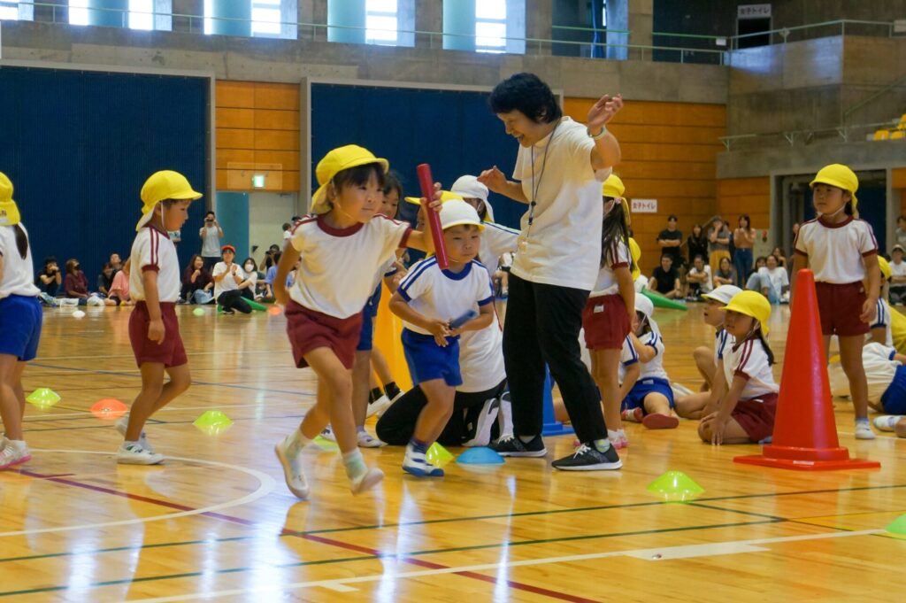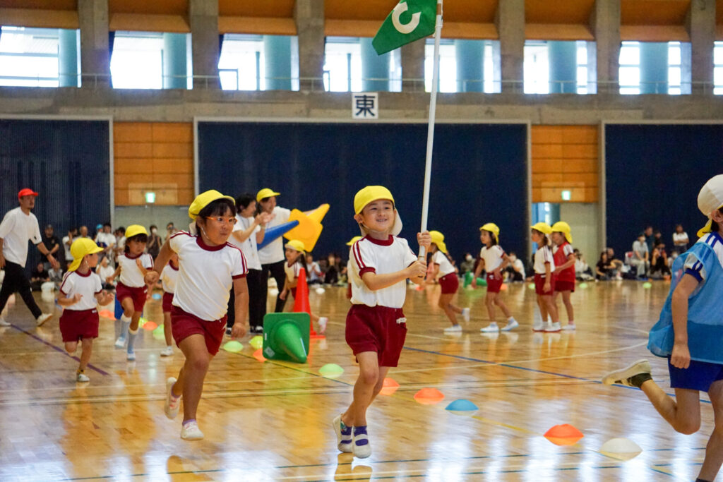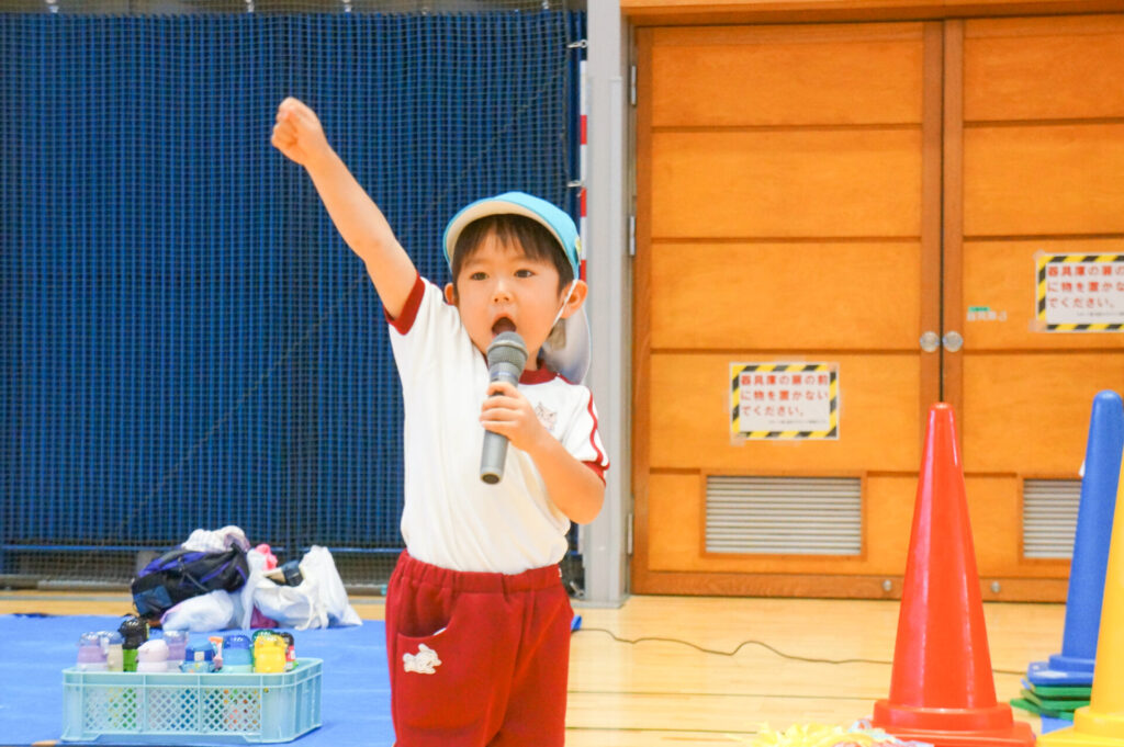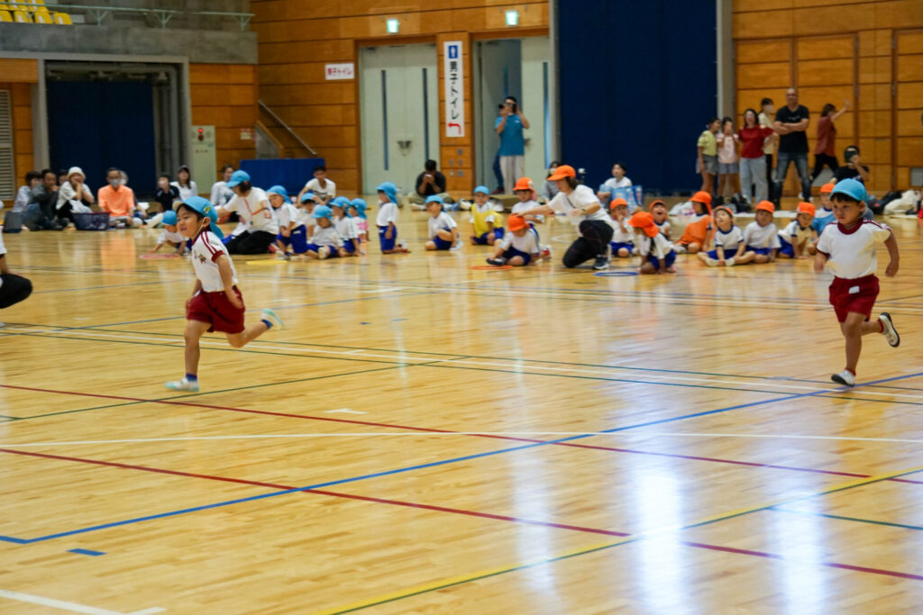 音楽がかかり、まどかっこ・すみれっこが走って堂々の入場です。年長つき組の代表園児による力強い「選手宣誓」、チームごとの応援では「エイエイオー!がんばるぞ!」の元気なかけ声がメインアリーナ内に響き、いざ、決戦の始まりです。