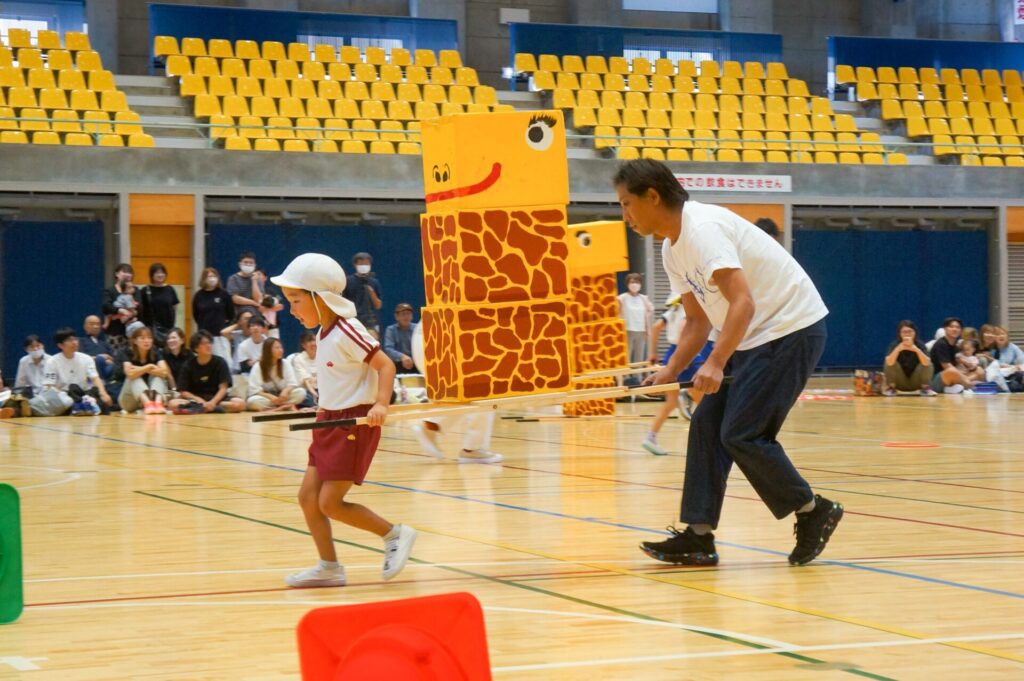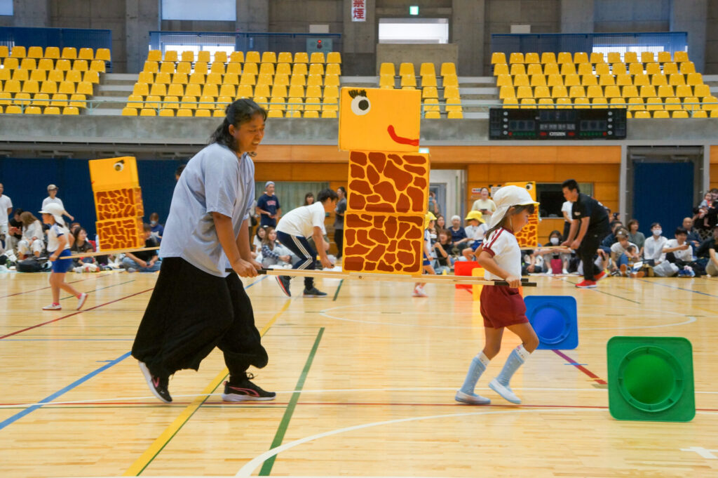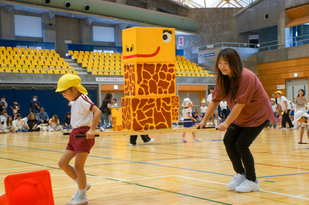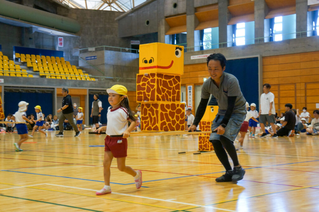 おうちの方との競技をとても楽しみにしていたつき組さん。段ボールの「キリン」が落ちないように、でも速く走って次の親子へ…ハラハラドキドキの「キリンレスキュー」でした。つき組さんの笑顔がとても素敵でした!