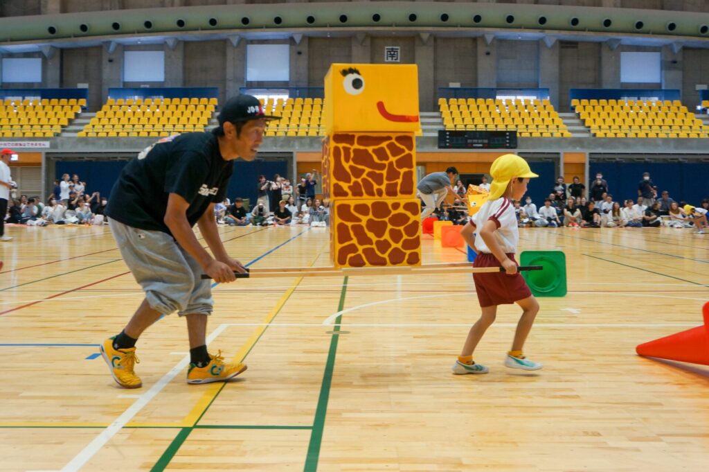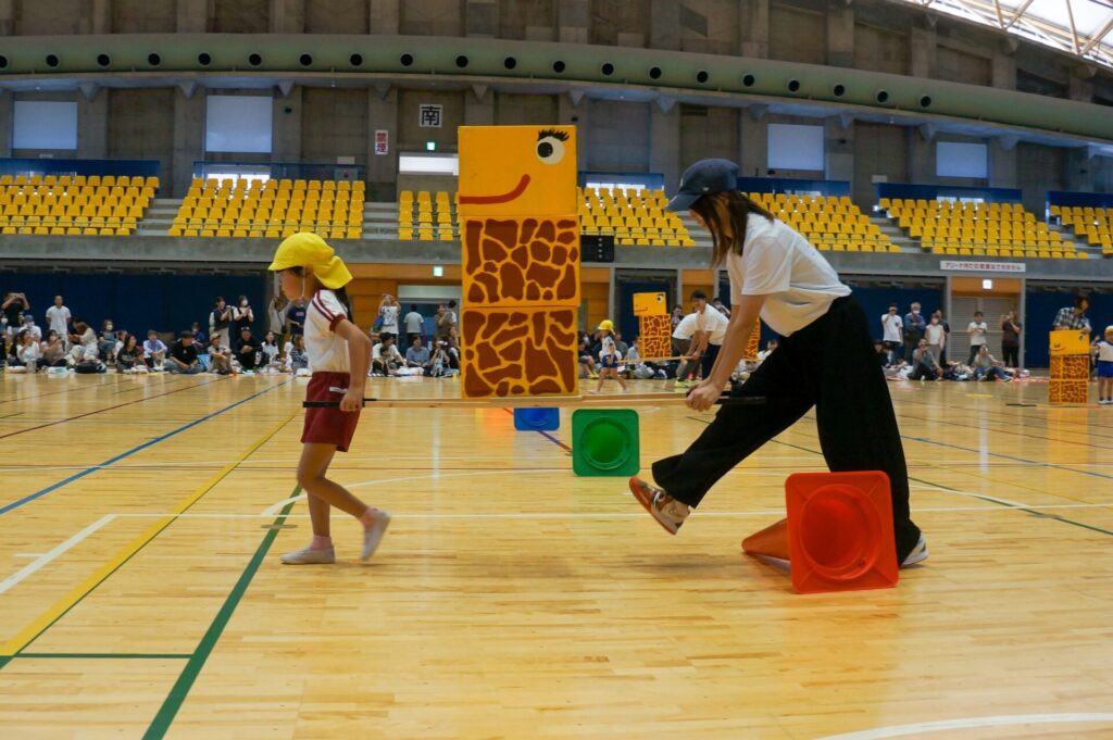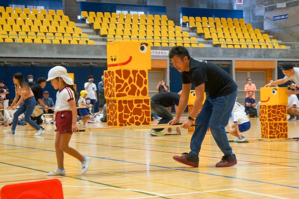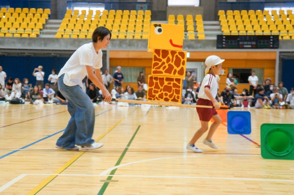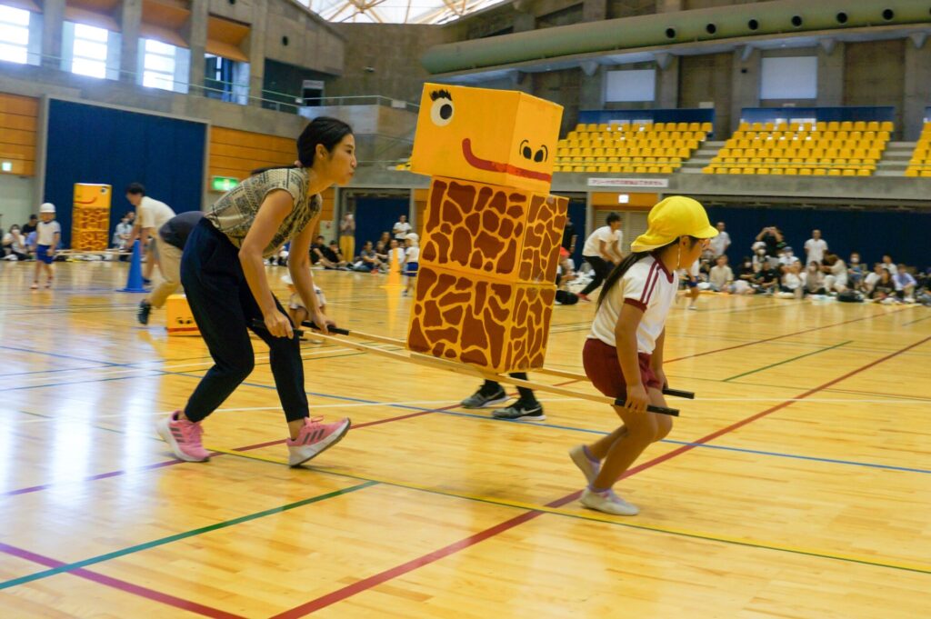 おうちの方との競技をとても楽しみにしていたつき組さん。段ボールの「キリン」が落ちないように、でも速く走って次の親子へ…ハラハラドキドキの「キリンレスキュー」でした。つき組さんの笑顔がとても素敵でした!