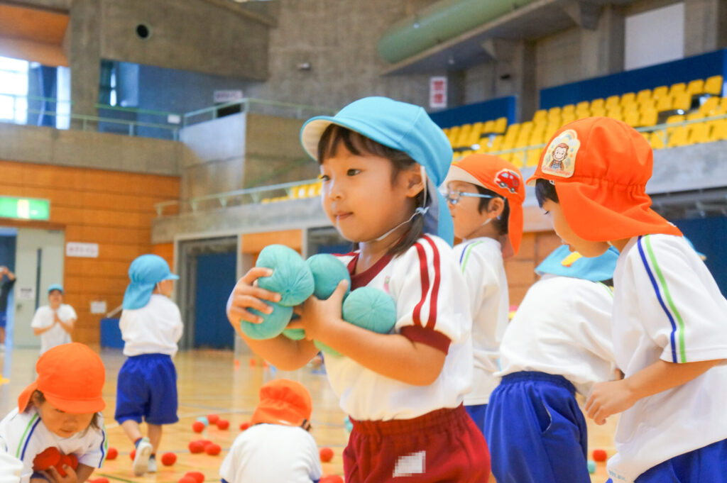 鬼ヶ島への必須アイテム「きびだんご」集め競争です。中央に散らばっている自分のチームの玉を早く片付けたチームの勝ちです!1~2個を確実に拾ってかごに入れに行く子、たくさんたくさん抱えて一度に大量の片付けをねらう子…一人一人がよく考えていることもよく伝わってきました。くり返しの経験でルールが分かるようになり、同じチームの友だちと楽しく競技に参加することができました。