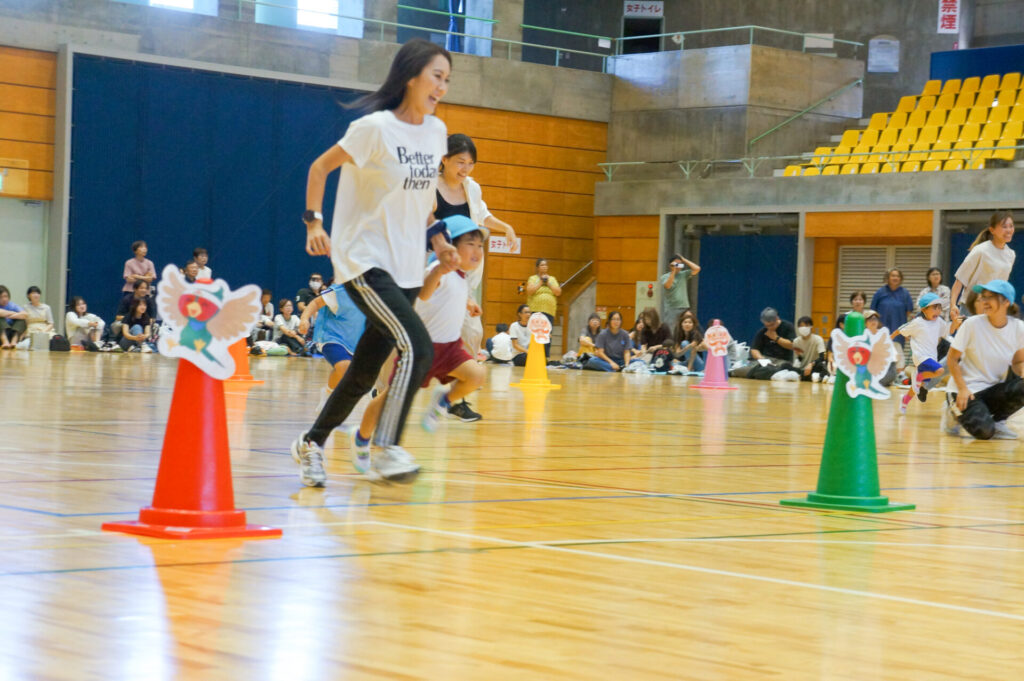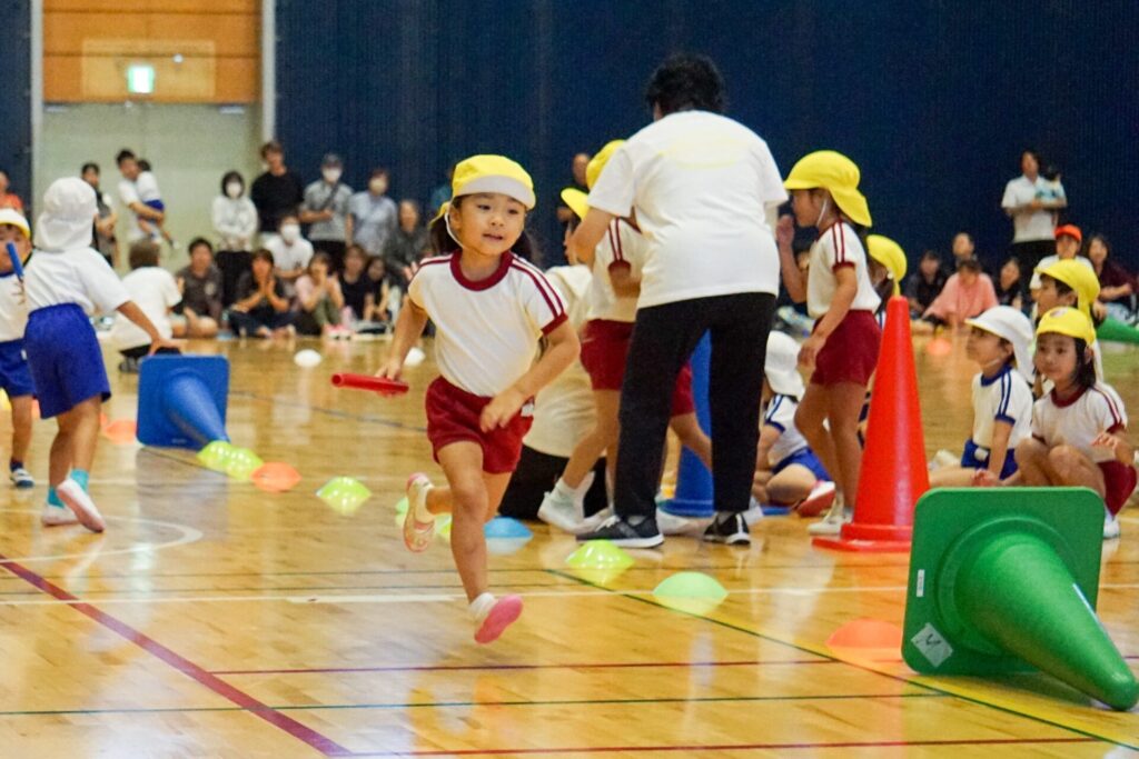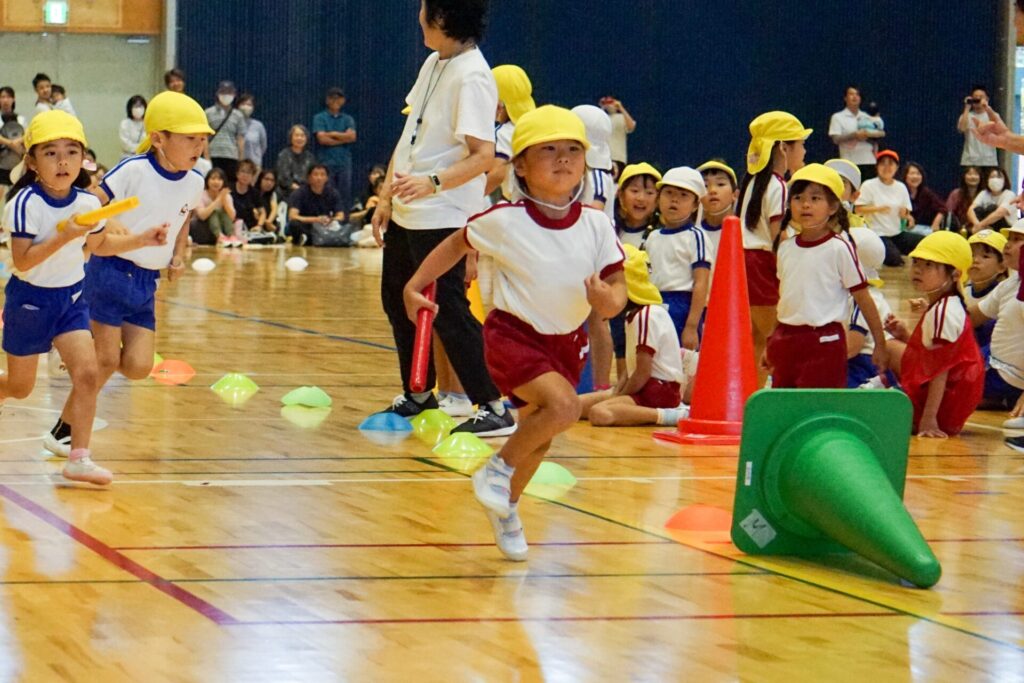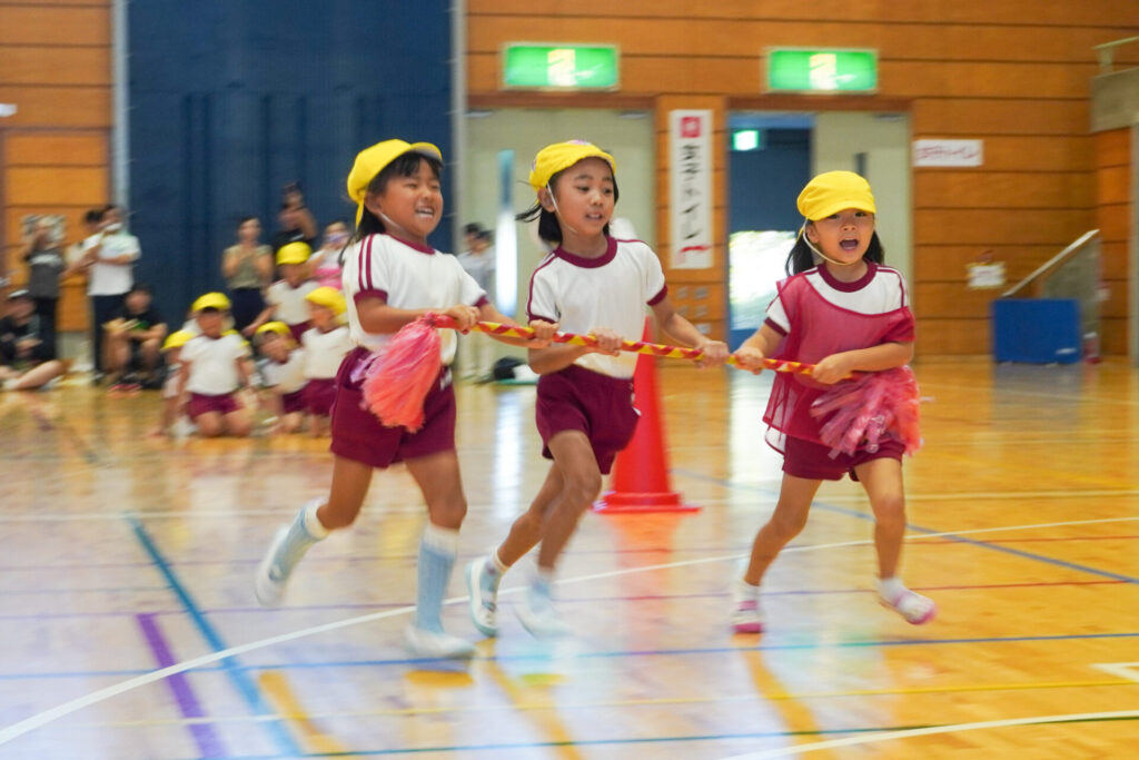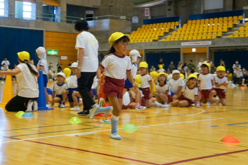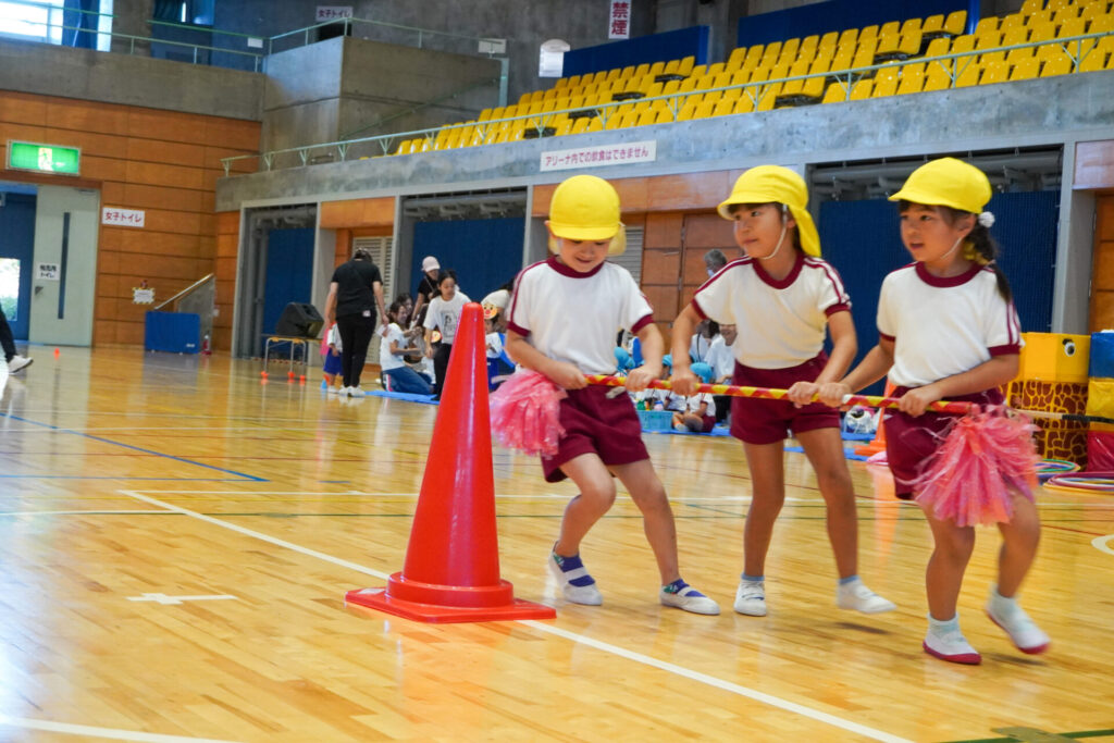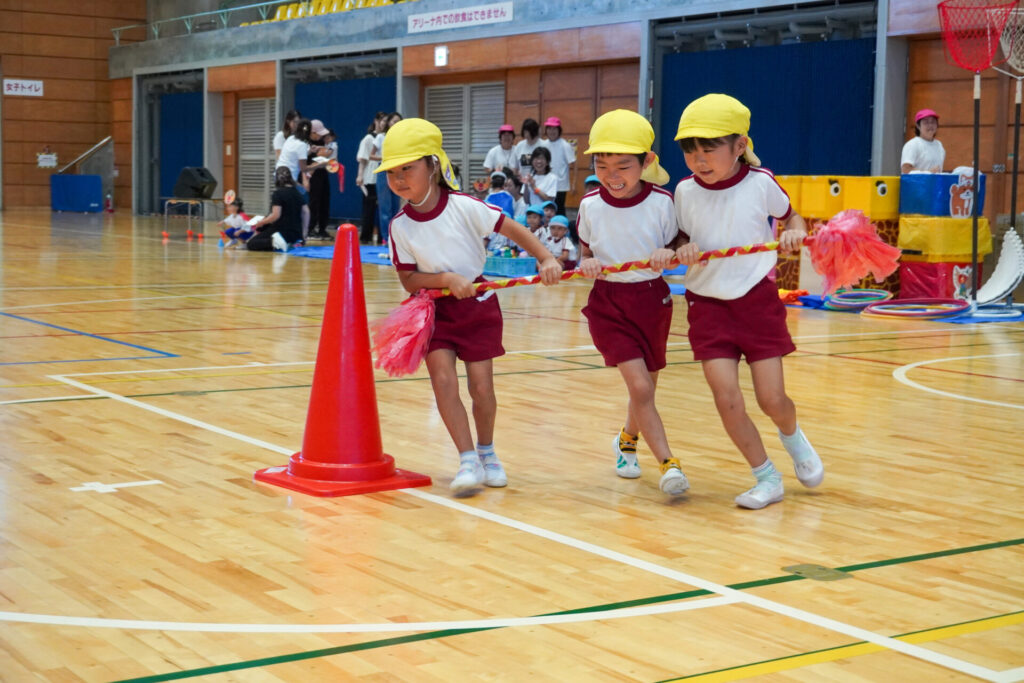 3人1組になり、コーンを回って駆け抜けました。気持ちをひとつにゴール一直線です。優勝はすみれ台幼稚園の「サメチーム」でした。頑張りましたね!