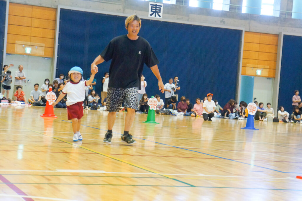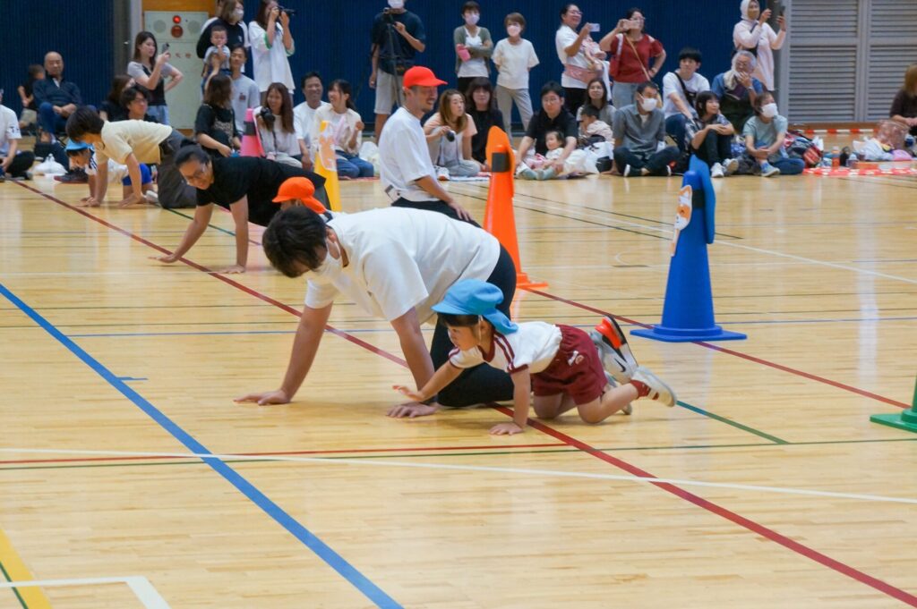 おうちの方との競技をとても楽しみにしていたゆり組さん。おうちの方とハイハイ、おんぶをしてもらった後は手をつないで次の親子へ…ゆり組さんの笑顔がとても素敵でした!