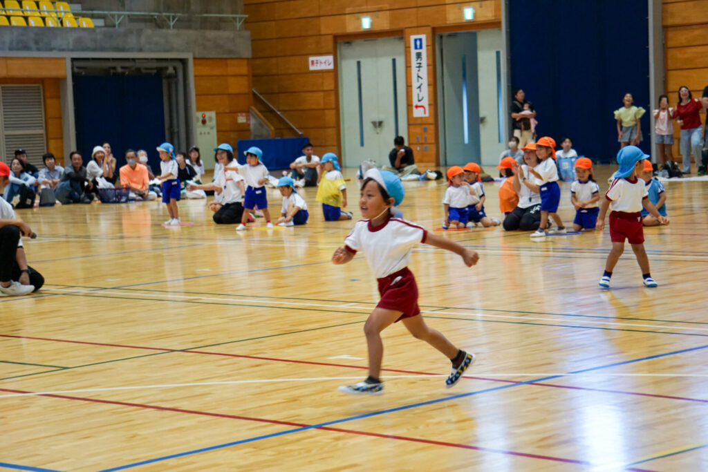 今年の年少のテーマは「桃太郎」です!かけっこが大好きなゆり組がゴール目指して、一直線!スタートポーズは誰にも負けません。広いアリーナを1人2回走りました。