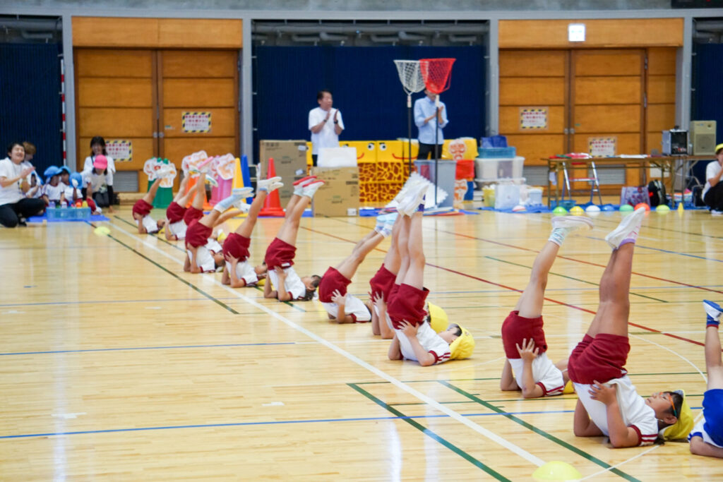 つき組全員の気持ちをひとつに…そして演技は機敏に優雅にしなやかに…1学期から遊んできた「組体操」の集大成です。一人の体操、三人の体操、全員の体操…笛の合図が鳴る度に顔が引き締まり、これまでの成果を発揮することができました。