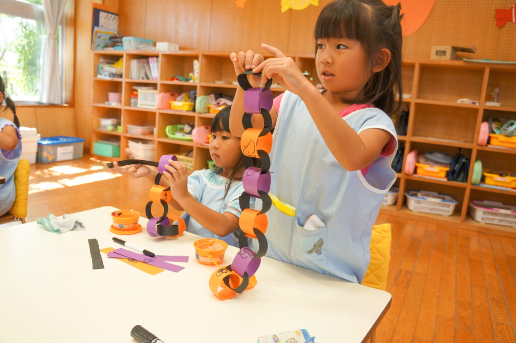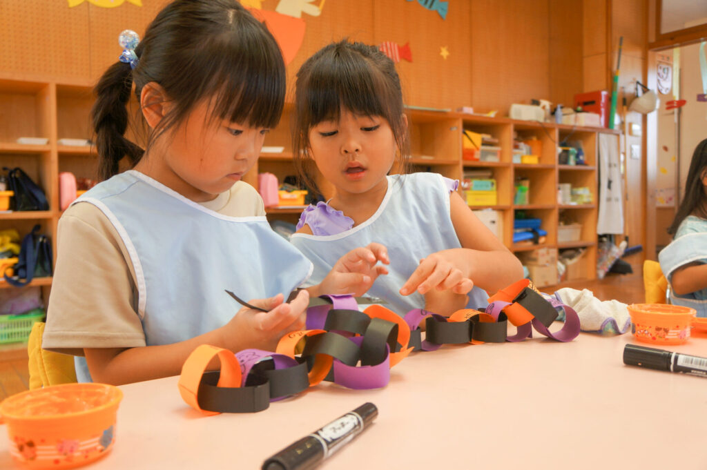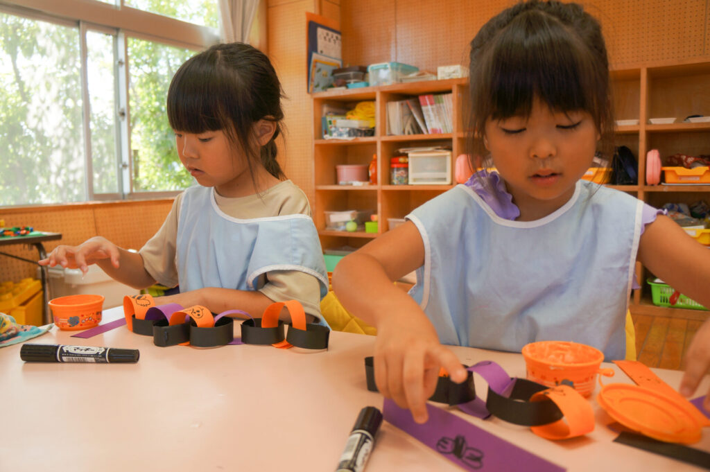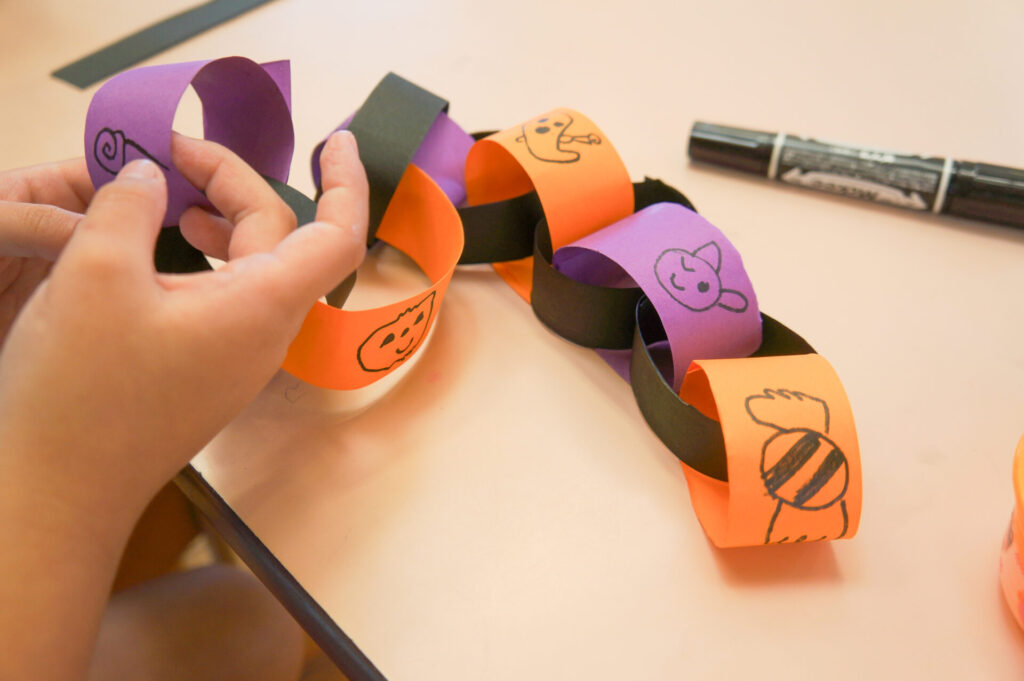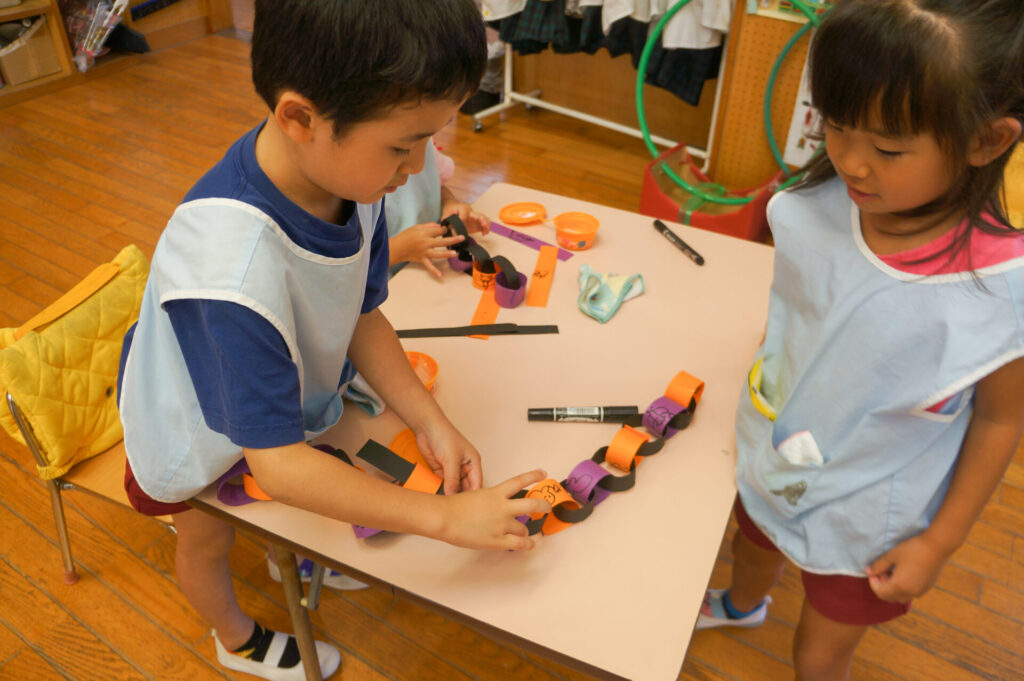 今日は、年長つき組がハロウィンの装飾作りをしました。細長い画用紙に、「こうもり」や「おばけ」、「ジャックオランタン」「キャンディー」などを描き輪飾りにしました。みんなが描いた絵が見えてとてもかわいらしい輪飾りです!自分の分を作ったら友だちとくっつけて、長い輪飾りの完成です。