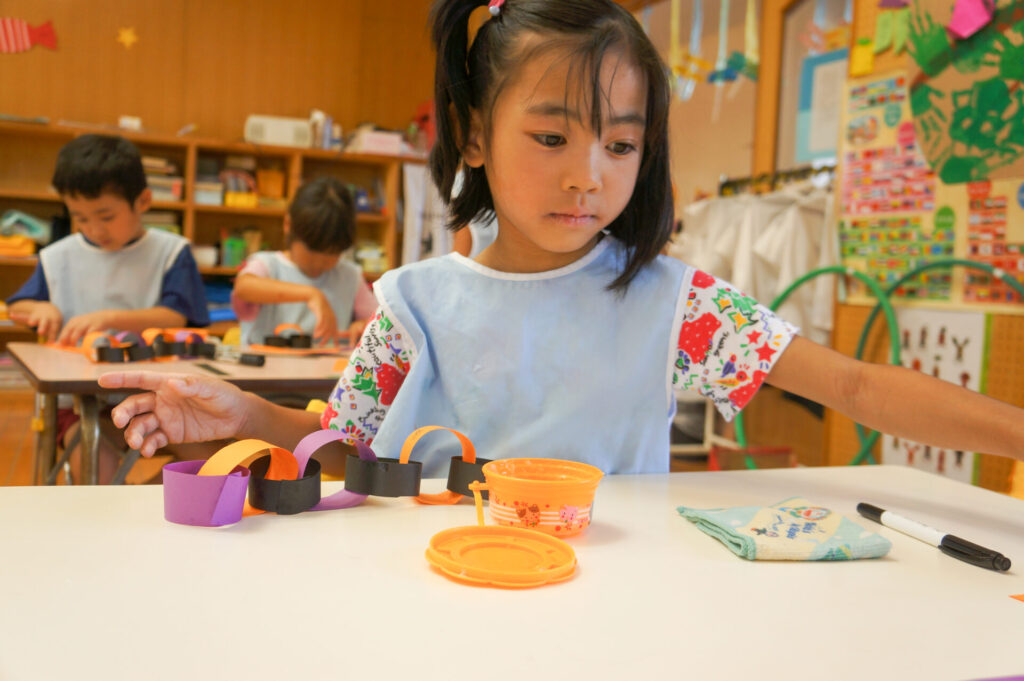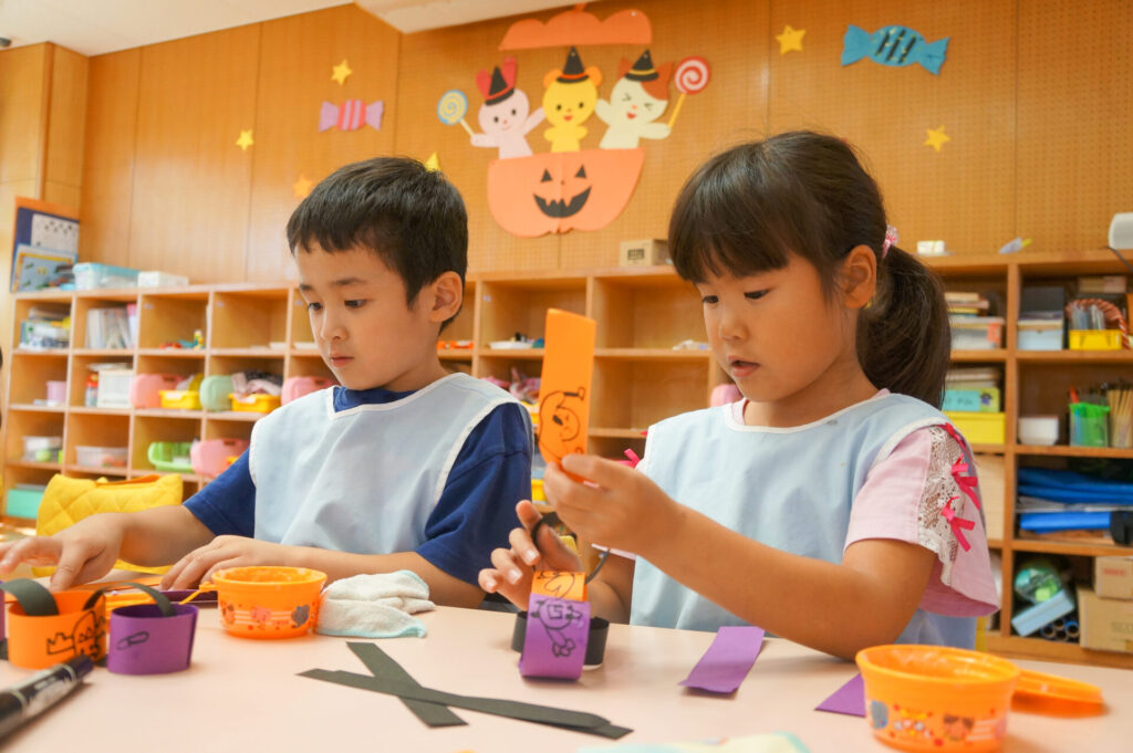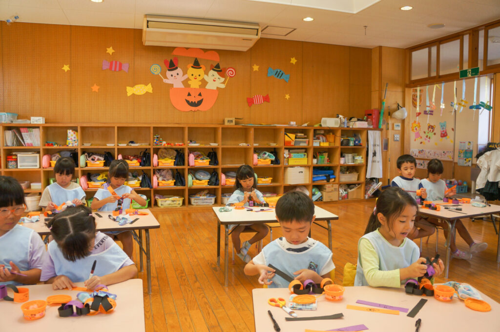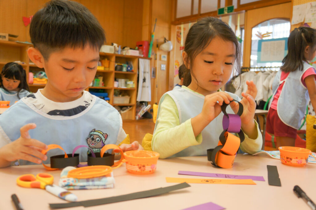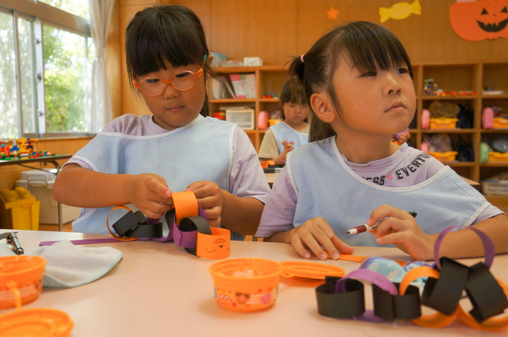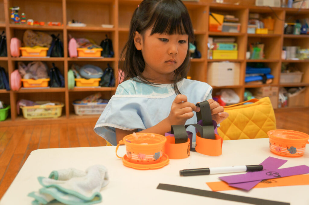 今日は、年長つき組がハロウィンの装飾作りをしました。細長い画用紙に、「こうもり」や「おばけ」、「ジャックオランタン」「キャンディー」などを描き輪飾りにしました。みんなが描いた絵が見えてとてもかわいらしい輪飾りです!自分の分を作ったら友だちとくっつけて、長い輪飾りの完成です。