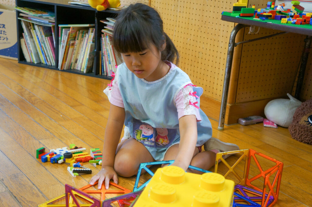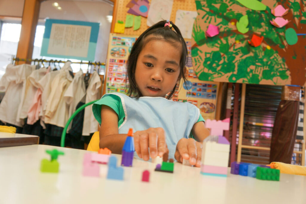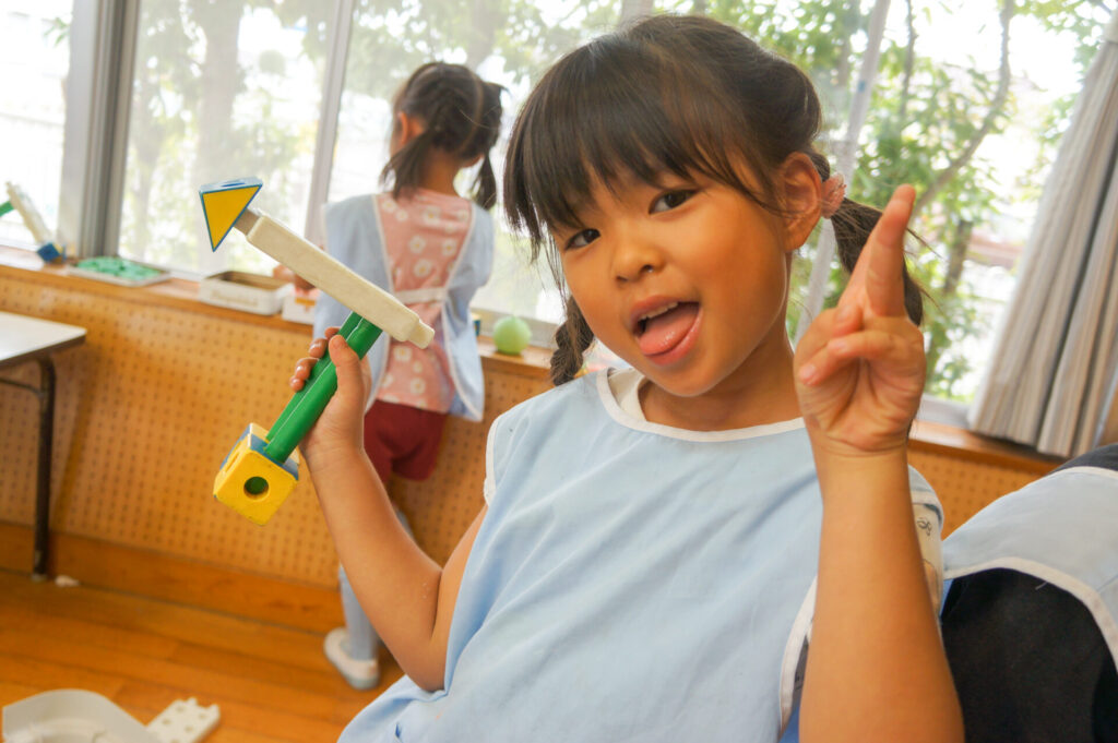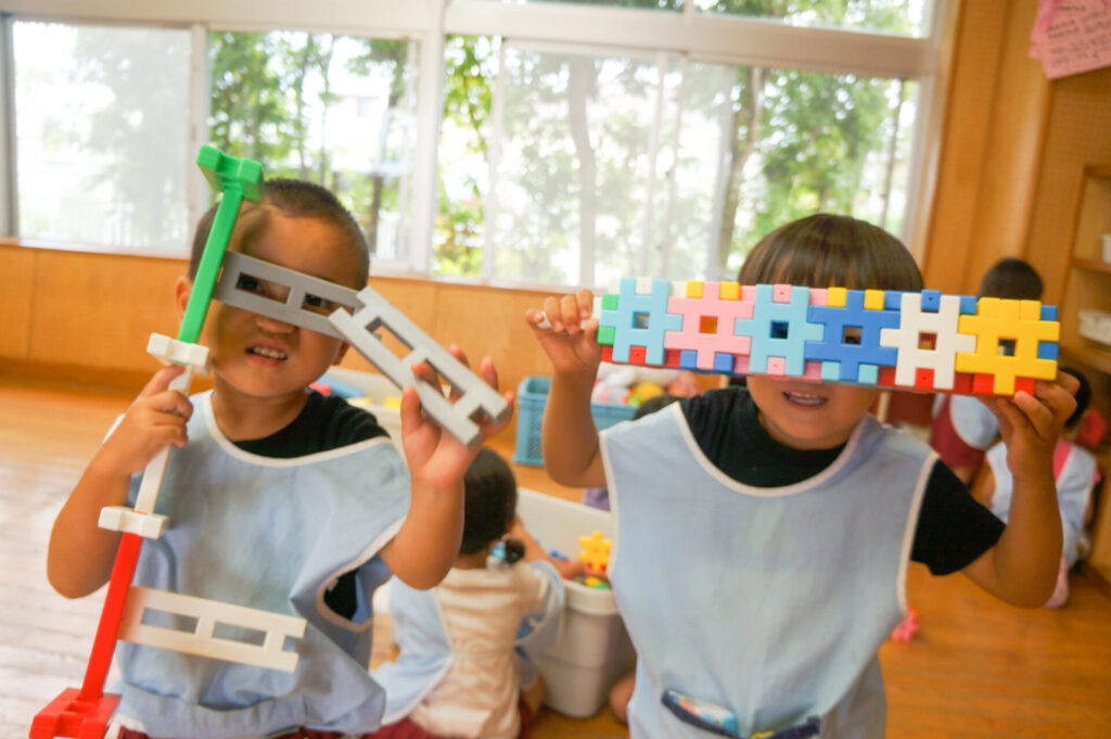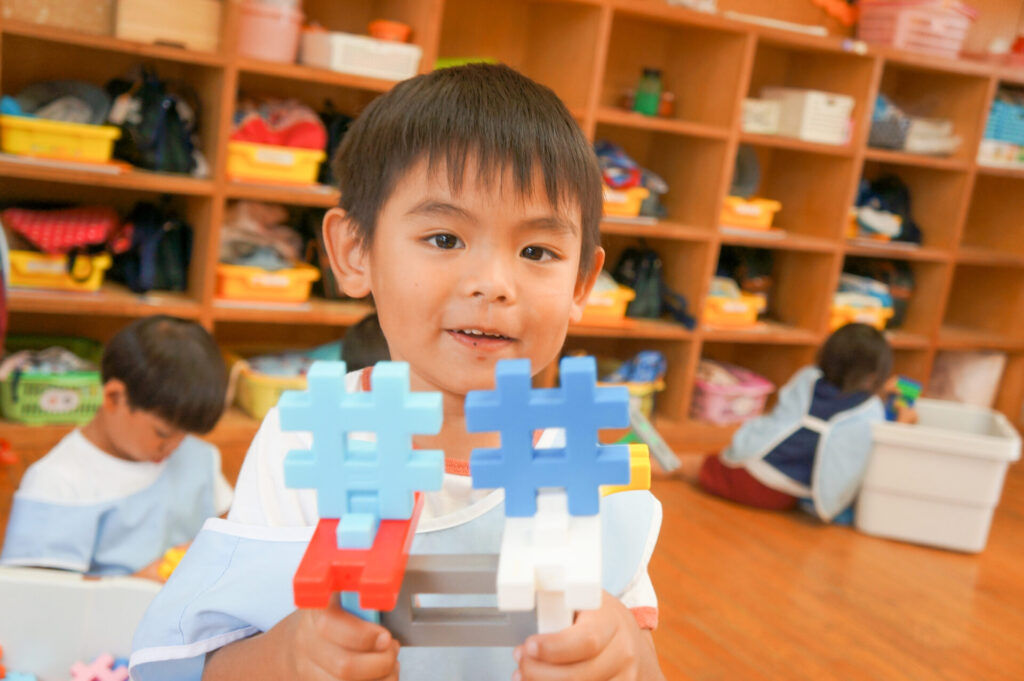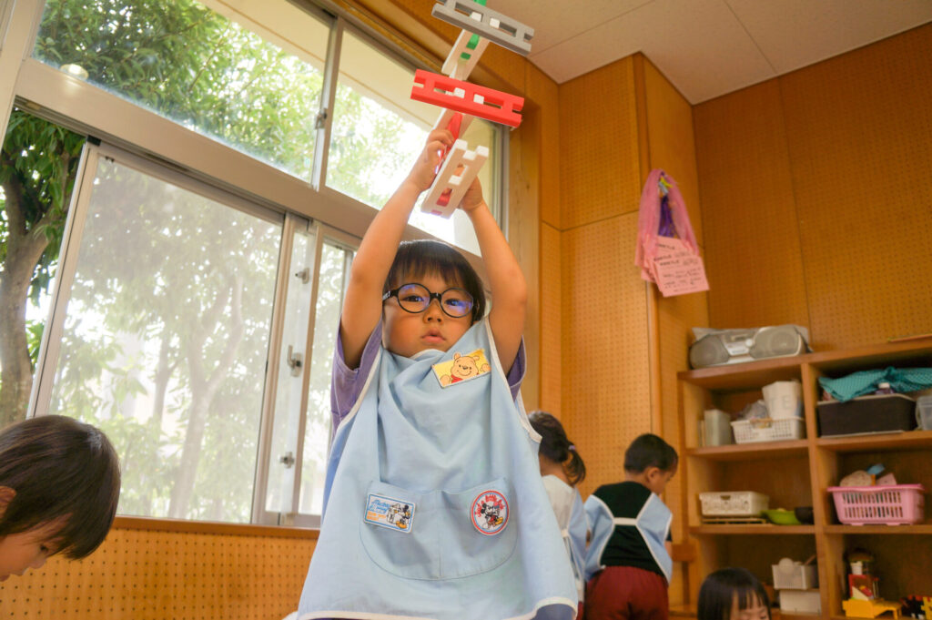 年少ゆり組は、ブロックでブレスレットをや掃除機を作って遊ぶ子が増えてきました。平面でつなげて遊んでいた1学期から成長し、ブロックを組み合わせて立体を作り出し楽しんでいます。
