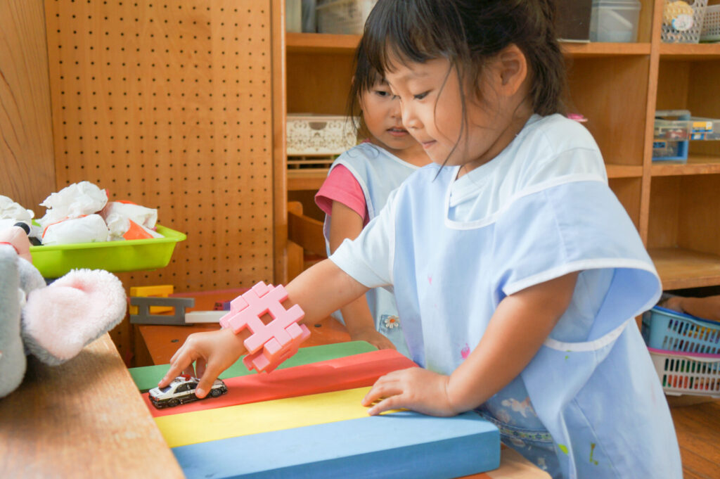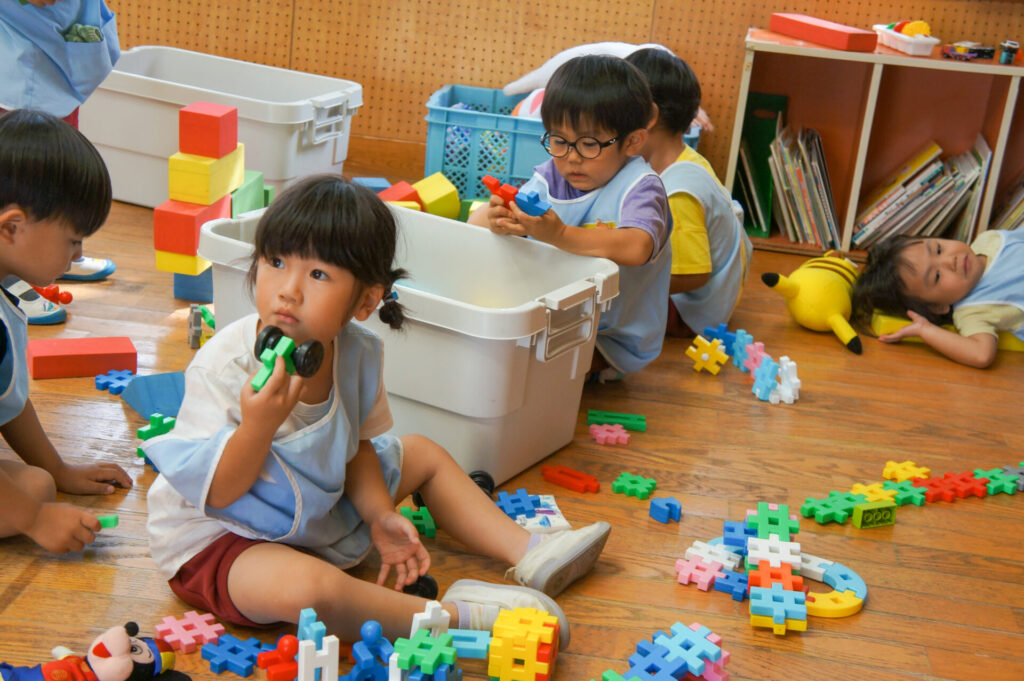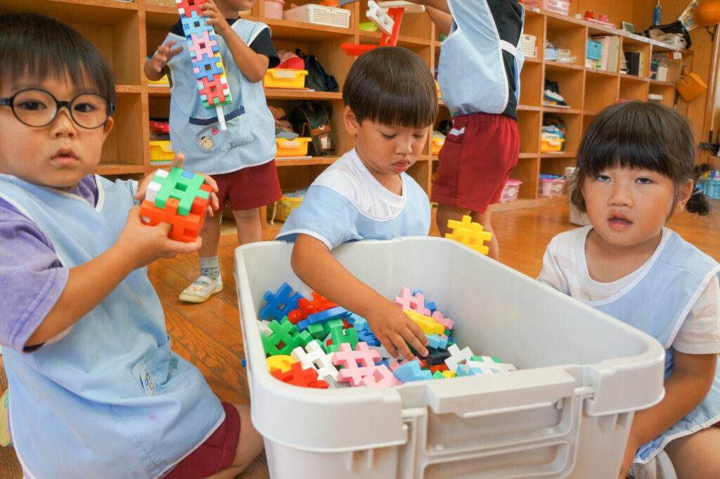 給食後の室内遊びでは、子どもたちが好きな玩具で遊ぶ時間です。友だちと一緒に遊び笑顔いっぱいです。