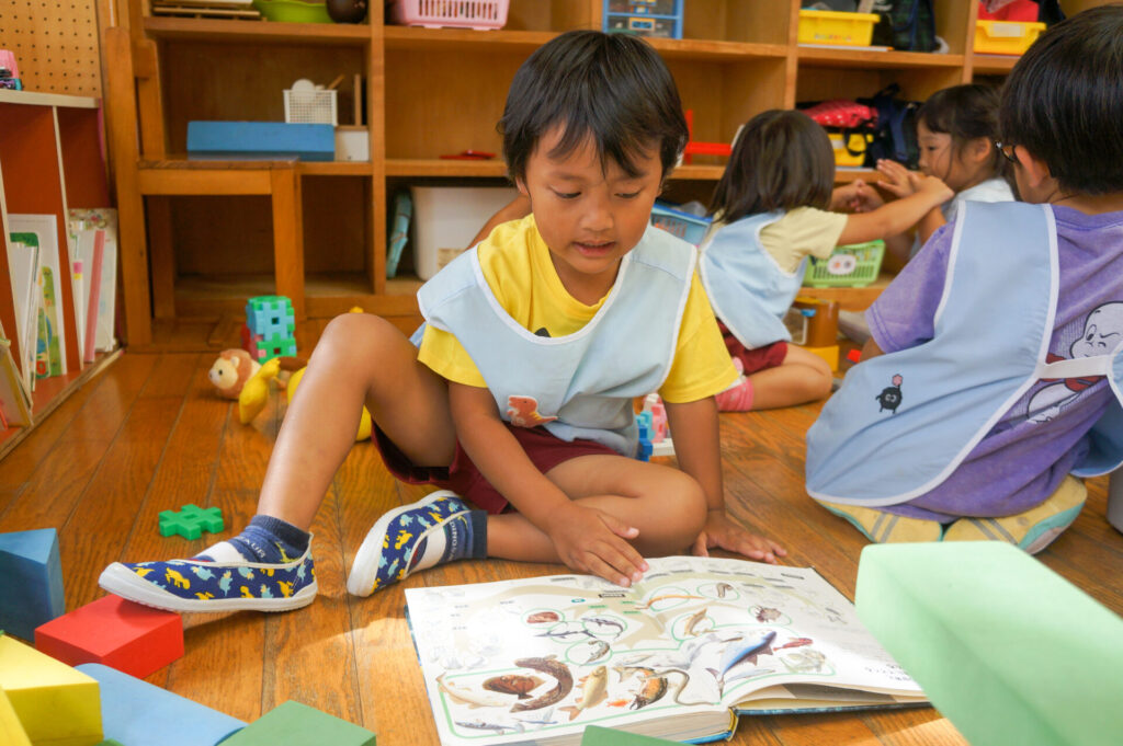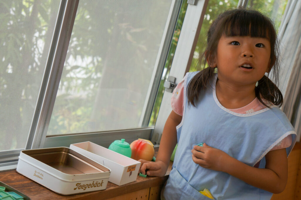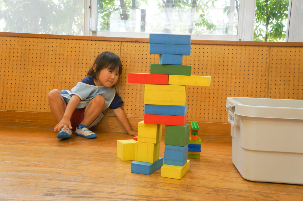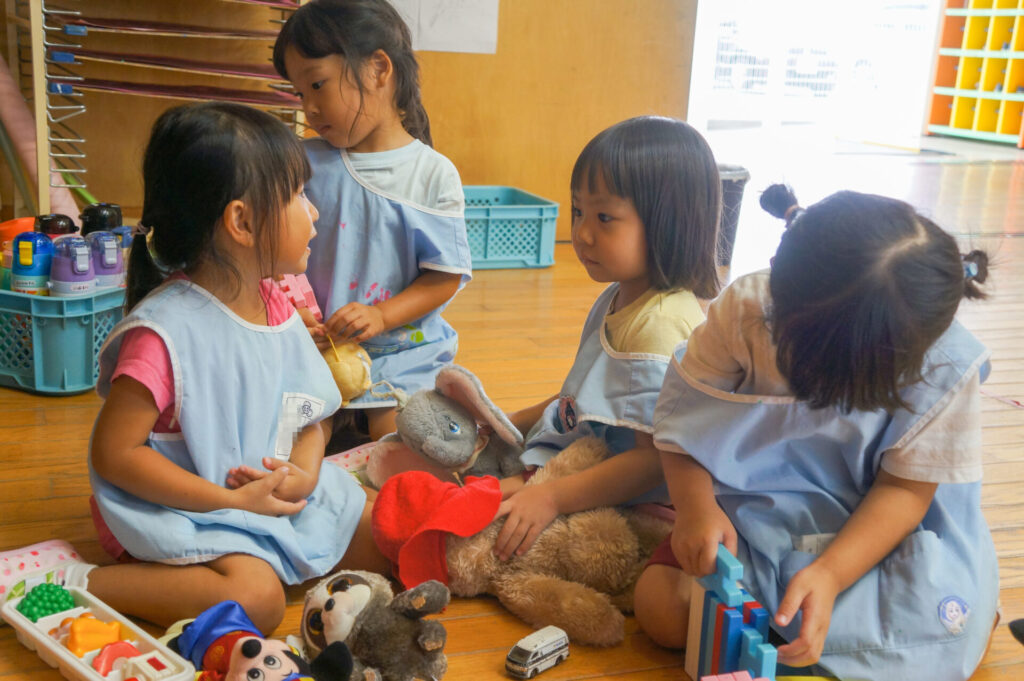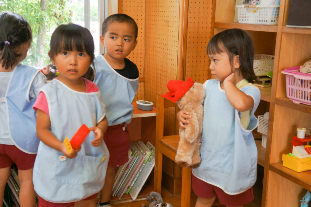 また、ごっこ遊びをする子も出てきました。お母さん役やあかちゃん役は人気なので、誰がどの役をやるのか子どもたちのやりとりを聞いていると面白いですよ。