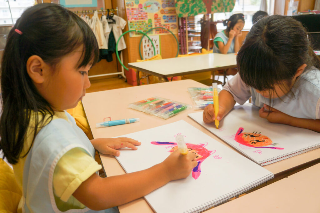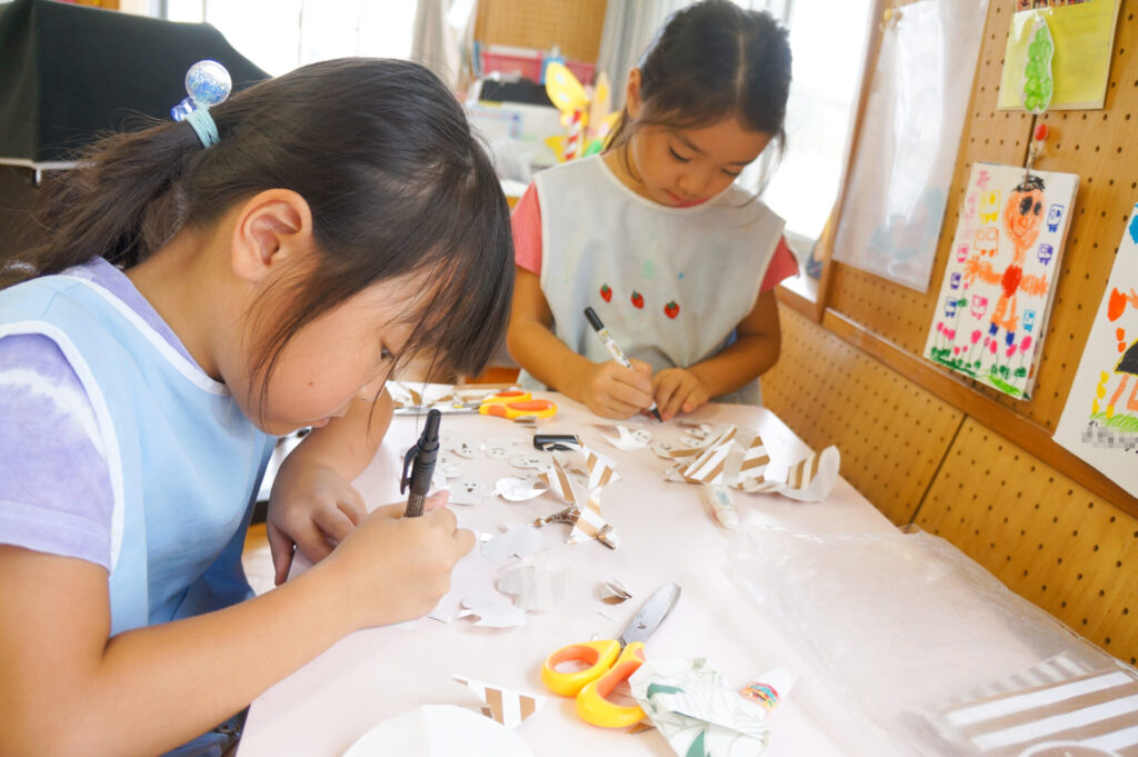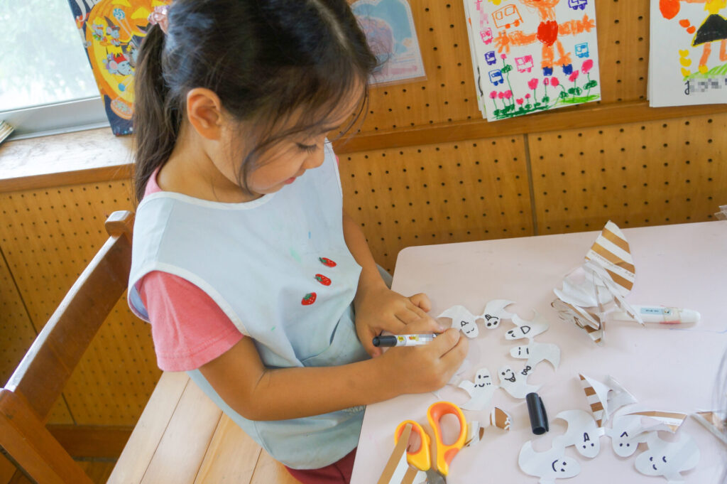 年長つき組は、友だちとの関わり方もとても上手になり、好きな遊びを熱中して遊んでいます。保育室の隅に家を作ったり剣を作る人がいたり、子どもたちの中で設定があるようで、声をかけ合いながら遊びを進めています。戸外遊びも大好きですが、室内でじっくり遊ぶのも大好きなすみれっこです。