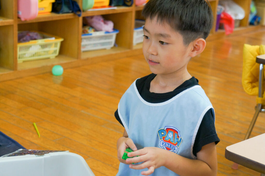 遊びの中で友だちとトラブルになることも増えています。自分の思うようにいかないことは遊びの中でもたくさんあります。「貸して」「今使ってるから待っててね」と言葉のやりとりができるように担任と一緒に日々練習をしています。