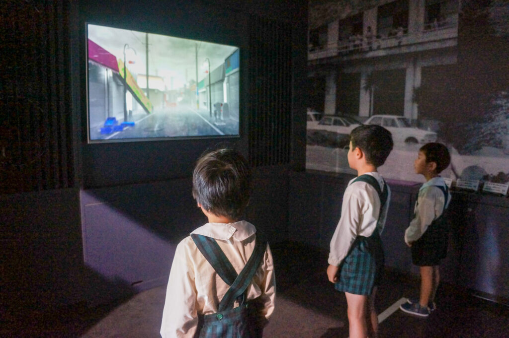 また「風水害体験(映像)」ではバケツや自転車が飛んできたり、建物の看板が強風ではがれたり、道路のあちこちで冠水が起きたり…実際に風を受けながら、リアルな体験をすることができました。