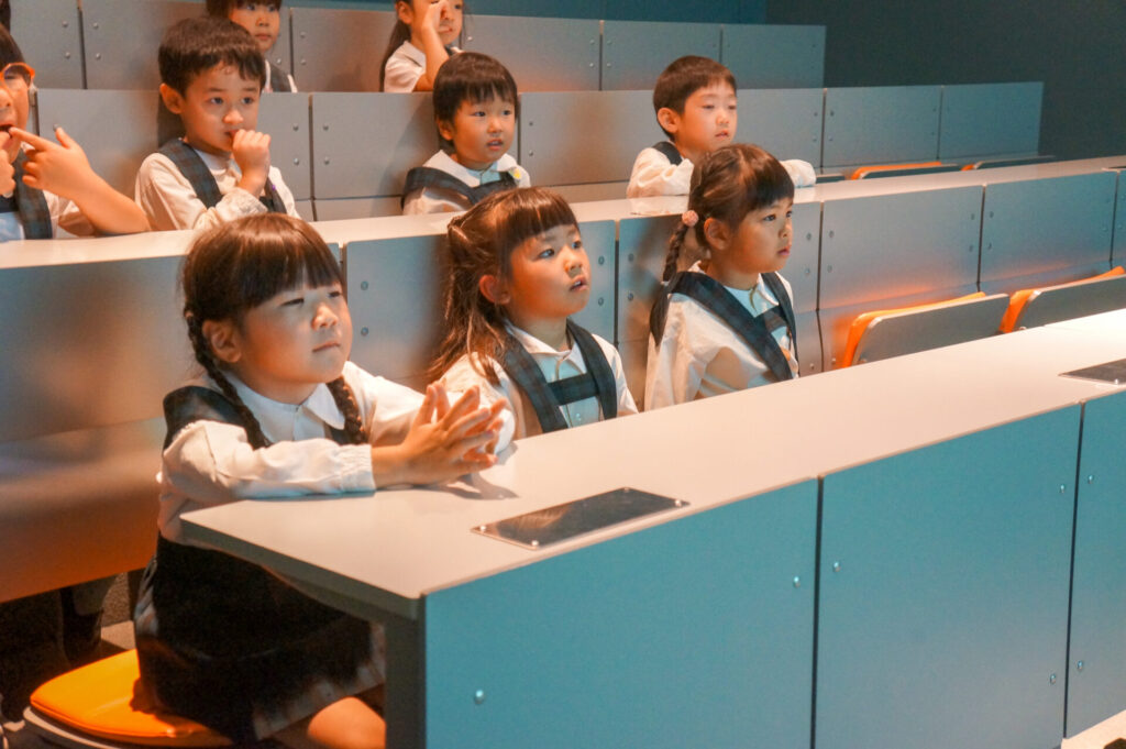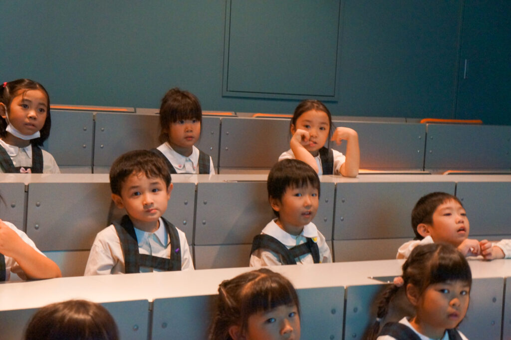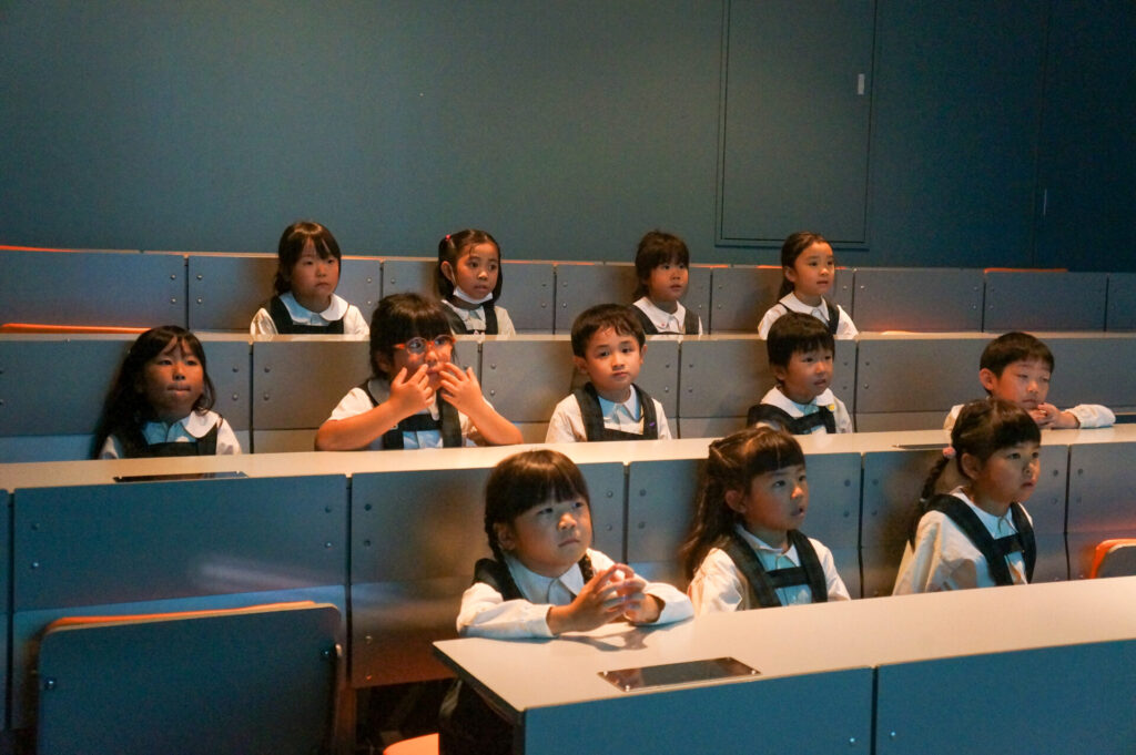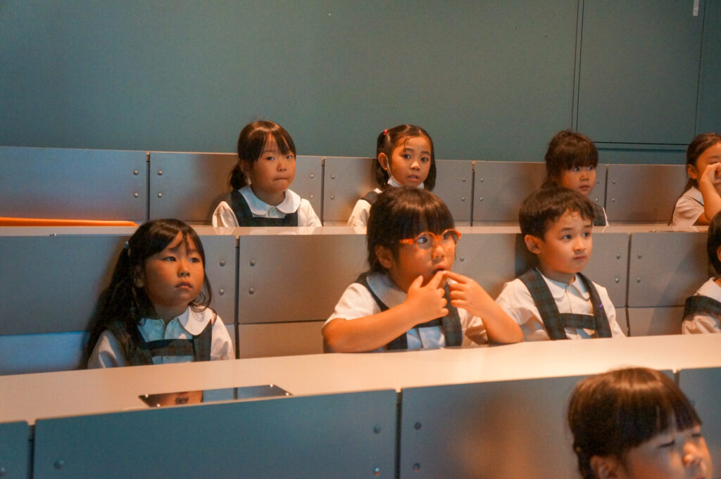 「防災シアター」では防災アニメ映像を鑑賞しました。昆虫が分かりやすく、避難訓練の安全な方法を教えてくれ、真剣に見ていました。見て、聞いて、考えて、またひとつ、大切な知識が増えました。