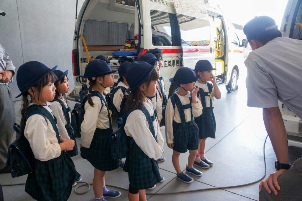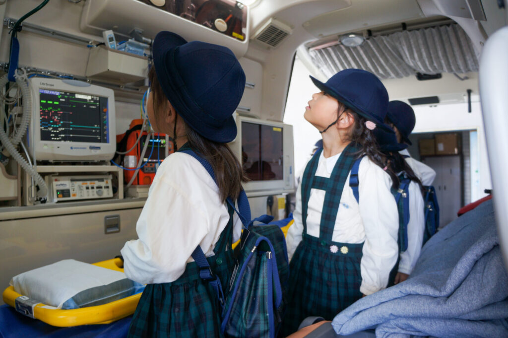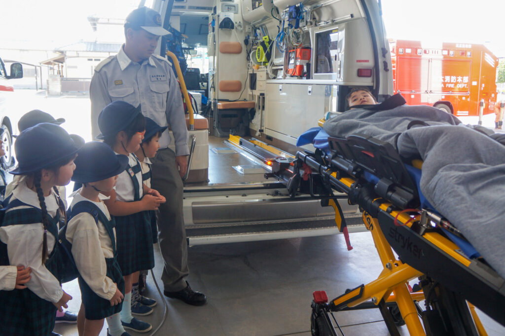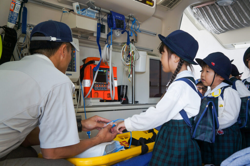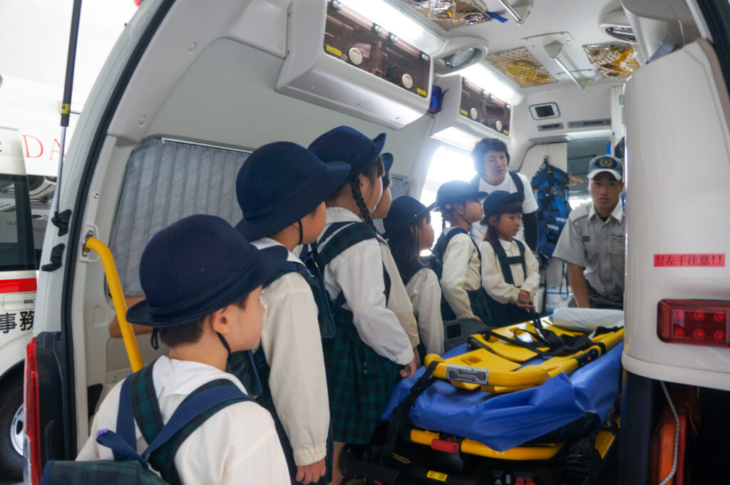 続いて、車両見学です。「救急車」の中に実際に乗せていただき、車内に積載されているたくさんの医療器具・道具を見せていただきました。上にも左右にも、医療器具でいっぱいです。実際にストレッチャーに寝かさせてもらったり、出し入れの様子を見せてもらったり、普段できない体験をたくさんしました。酸素濃度を測定する機械も、指先にみんなつけてもらいました。