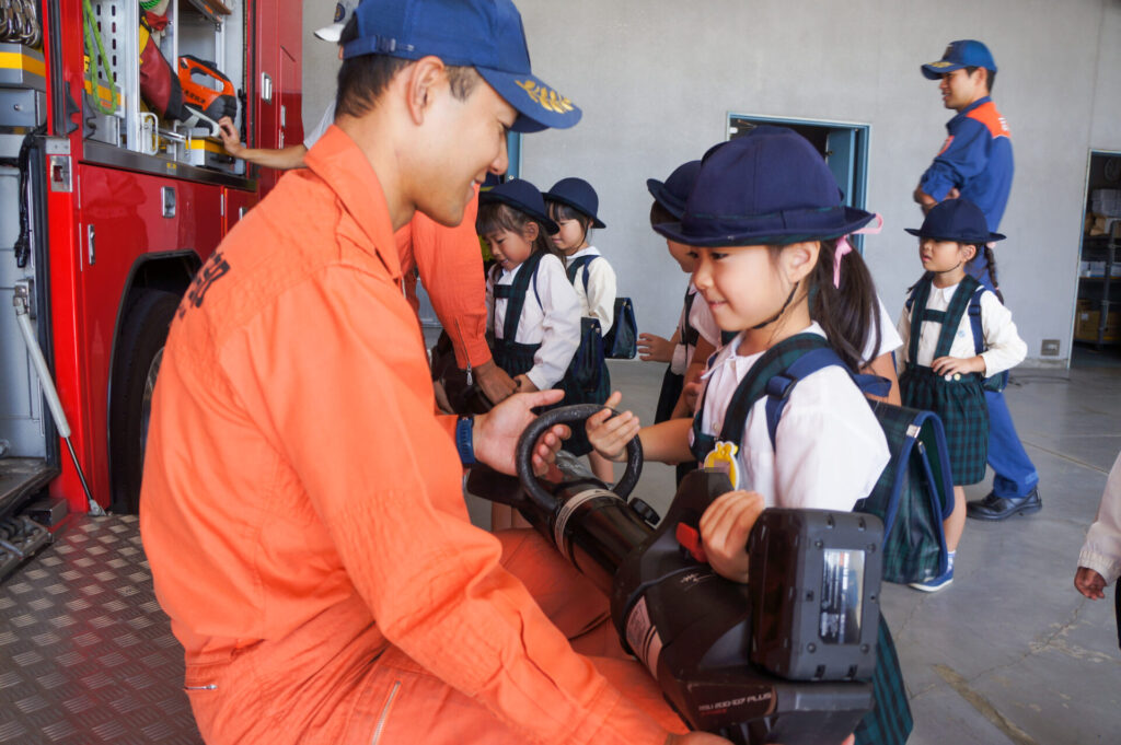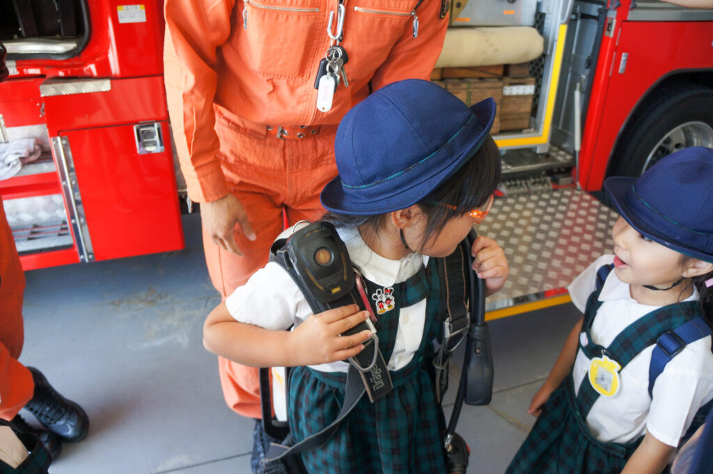 次は「消防車」です。火事発生時、高い建物や消防車が入りにくい場所でも対応できるように、水は約4,500リットルを積載、またホースは約20メートル伸びるそうです。ひとつひとつの器具や道具の説明を丁寧にしていただき、実際に持たせていただきました。
