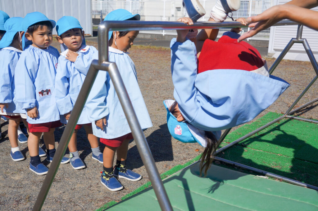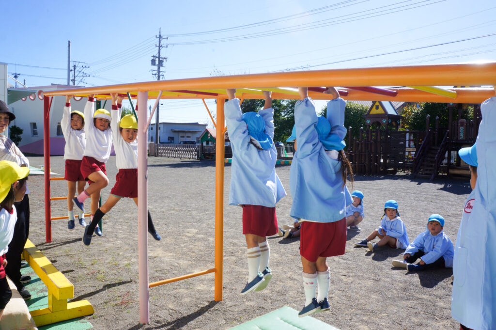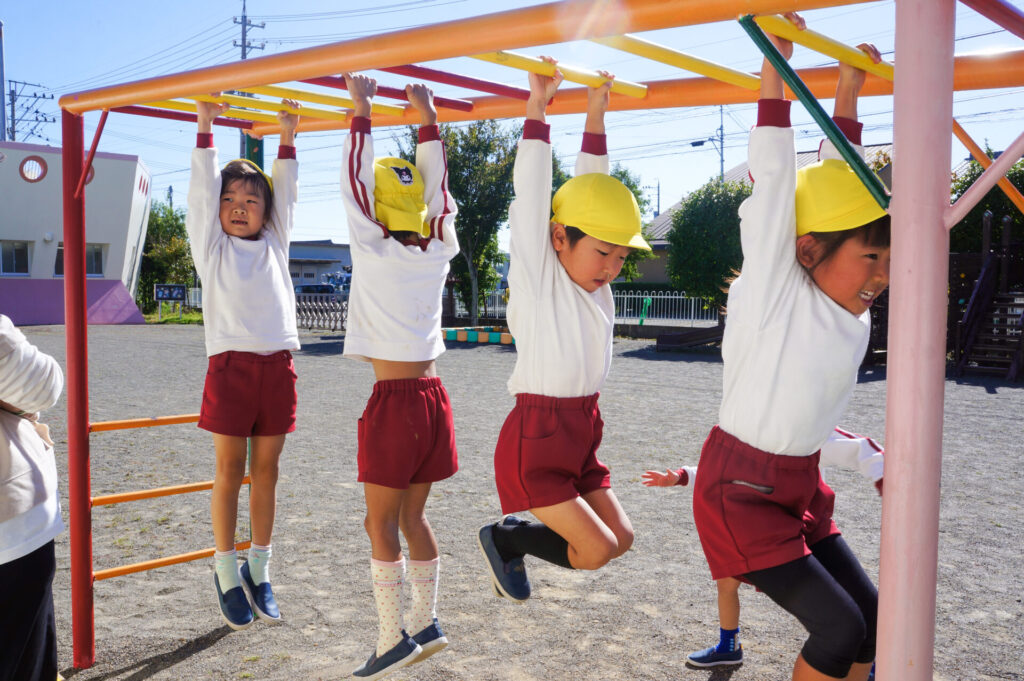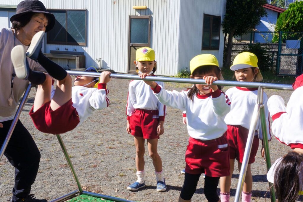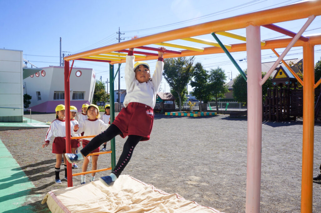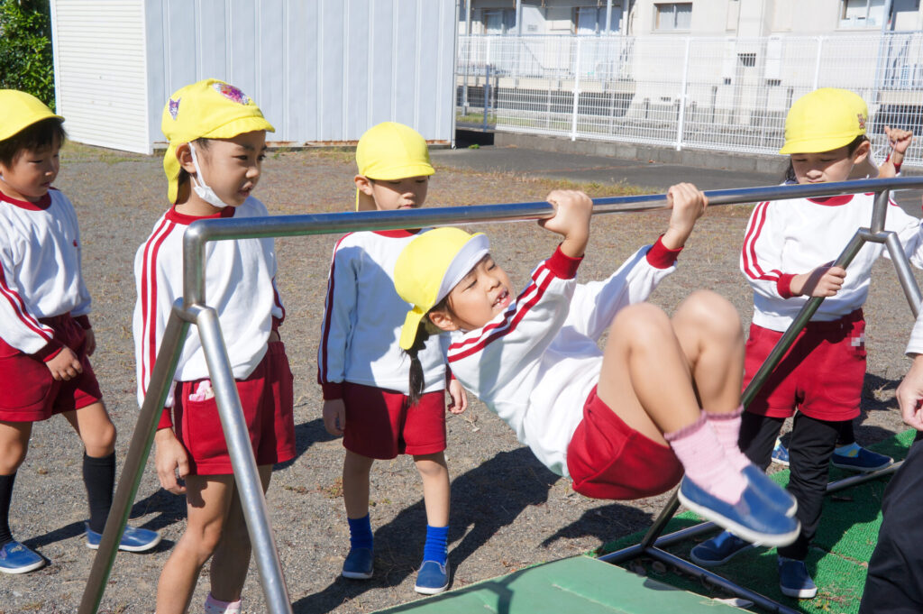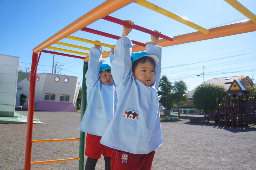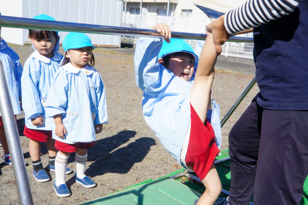ぶら下がり運動をすることで、自分の腕で体重を支えるため筋力UPが期待されたり、体が伸び姿勢がよくなる効果もあります。また、歯を食いしばって頑張るため口の周りが成長し、発語にもいいと聞いたこともあります。そして何より頑張る力にもつながりますね!