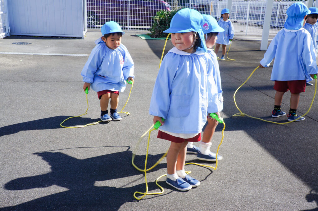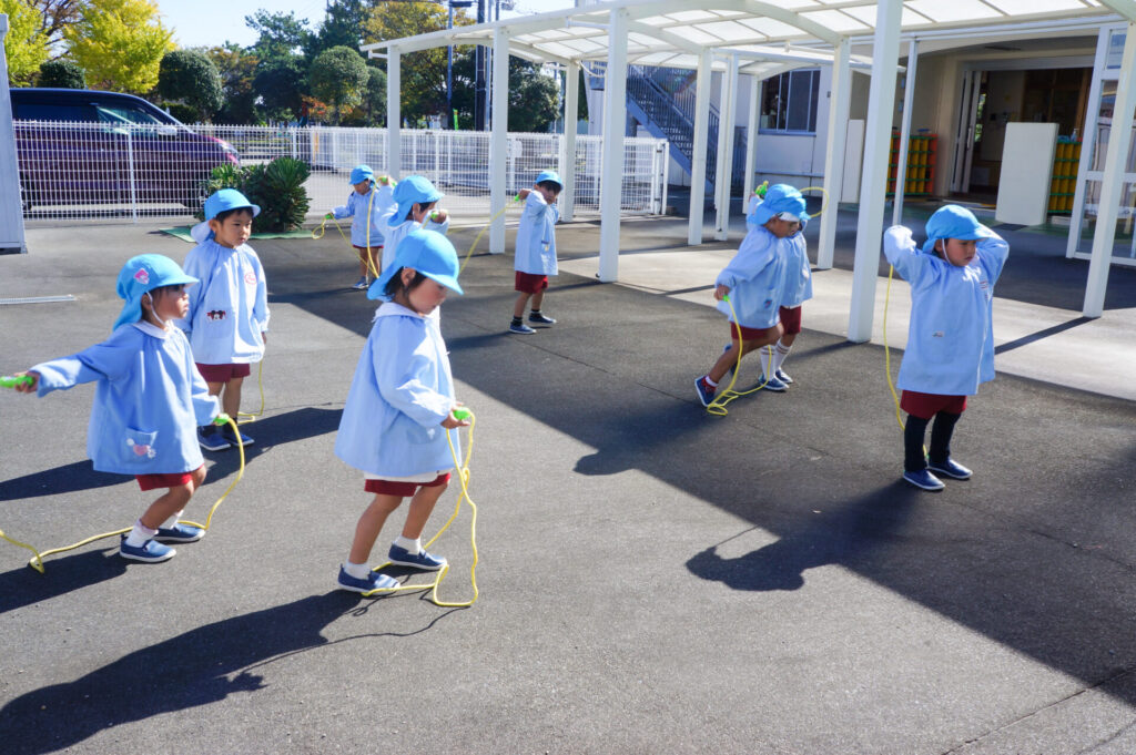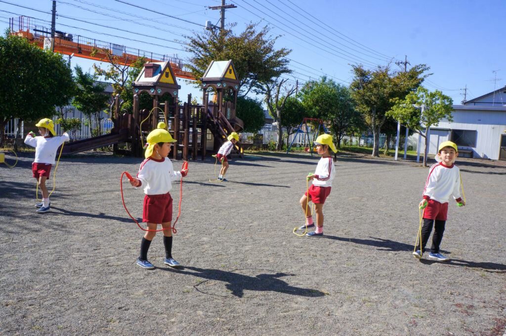 鉄棒では、ゆり組は「足掛け回り」、つき組は「逆上がり」や「連続逆上がり」に挑戦しています。縄跳びでも、ゆり組は「まわしてピョン」、つき組は「前回し跳び」「後ろ回し跳び」「けんけん跳び」いろいろな技に取り組んでいます。