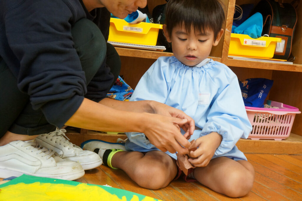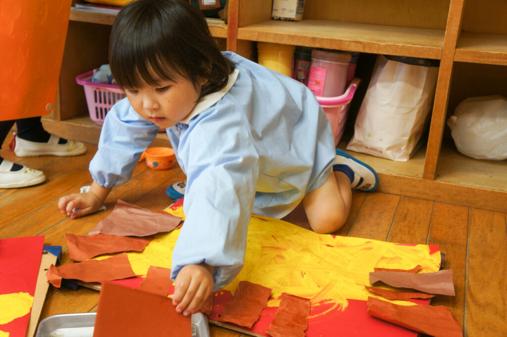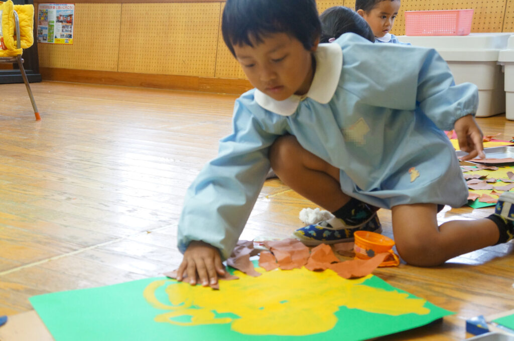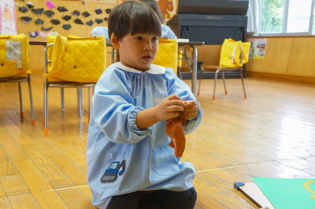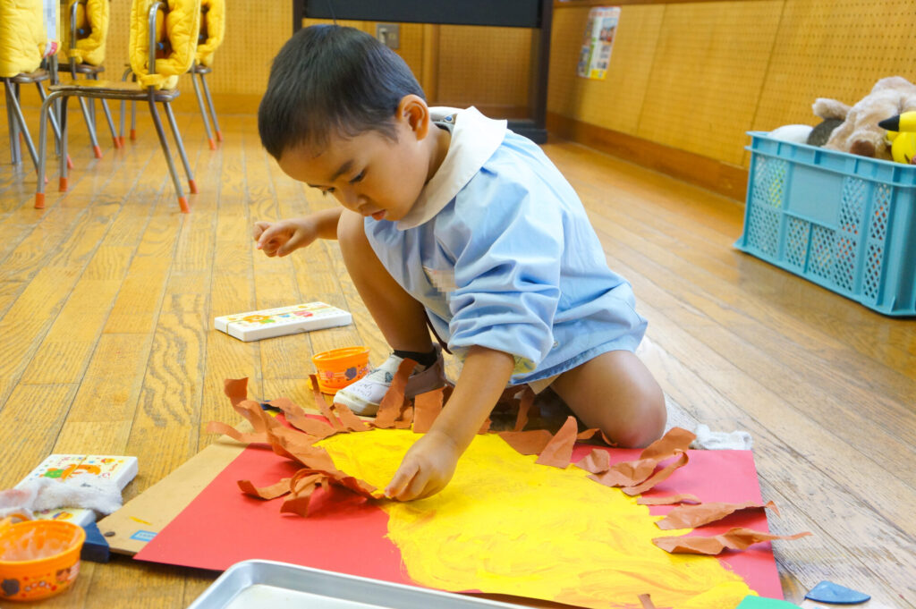 中には、指先に力が入らずちぎることが難しい子もいました。おうちで、新聞紙を破いたりお菓子の袋を自分であける練習などをしてみると、指先に力を入れる感覚が掴めるかもしれませんね。