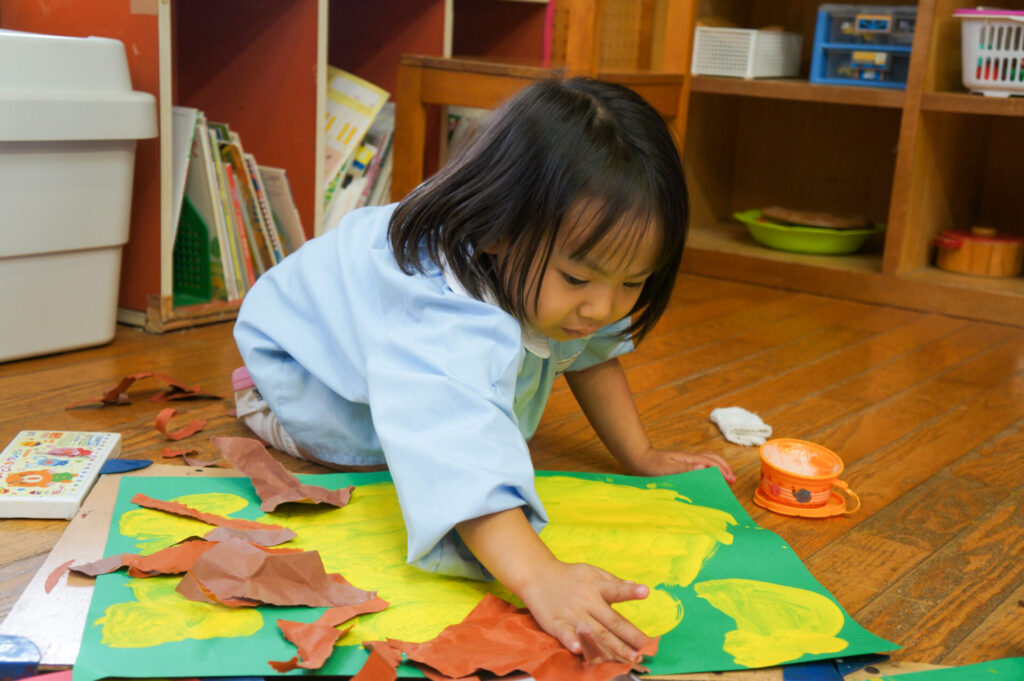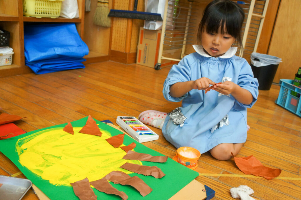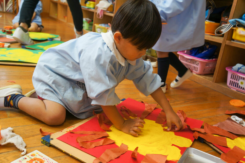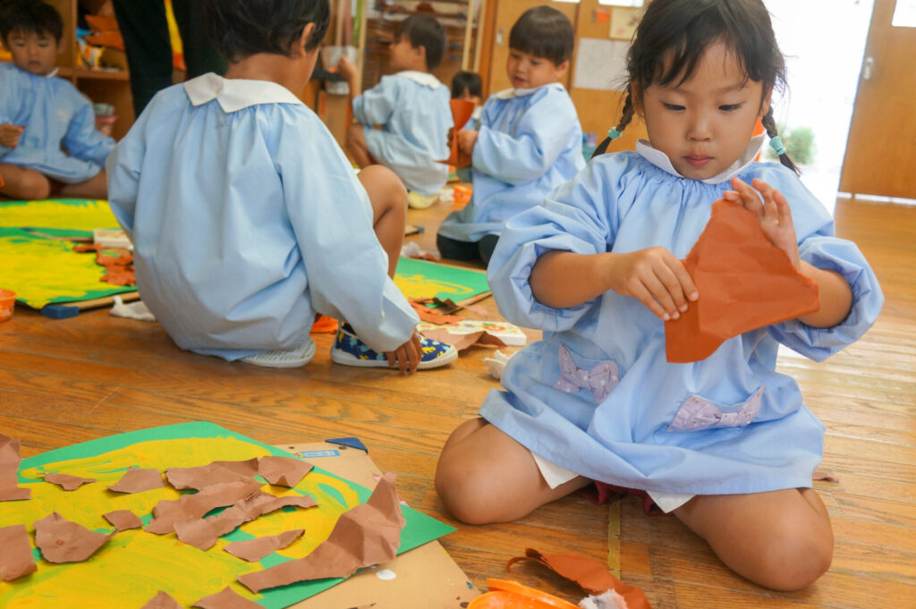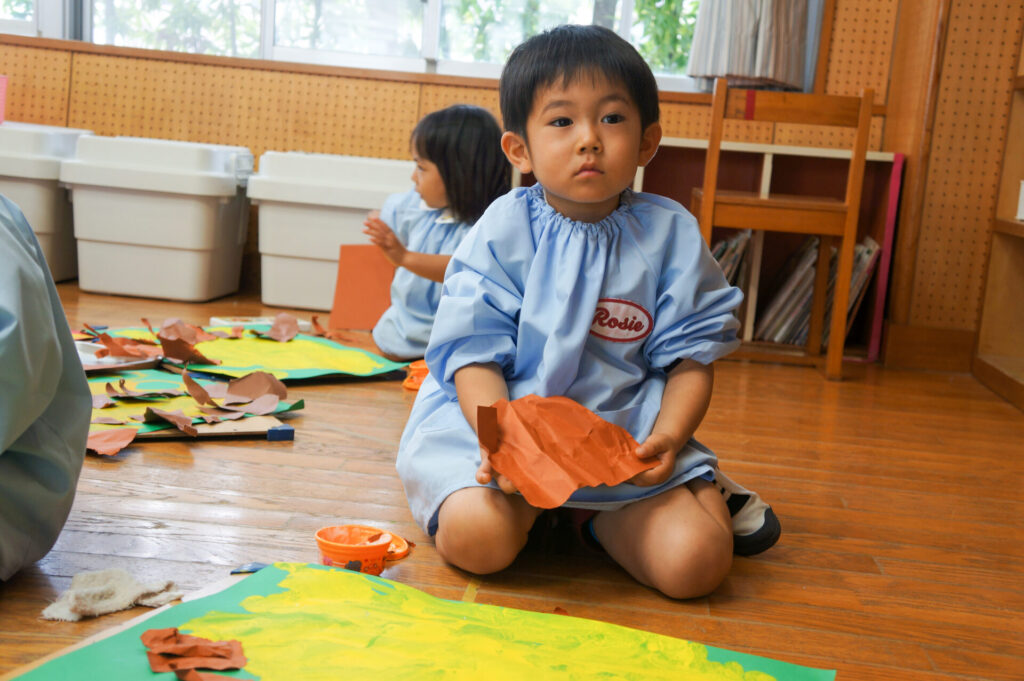 中には、指先に力が入らずちぎることが難しい子もいました。おうちで、新聞紙を破いたりお菓子の袋を自分であける練習などをしてみると、指先に力を入れる感覚が掴めるかもしれませんね。