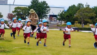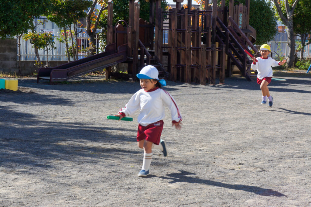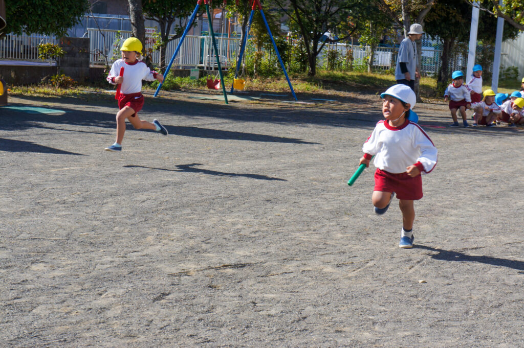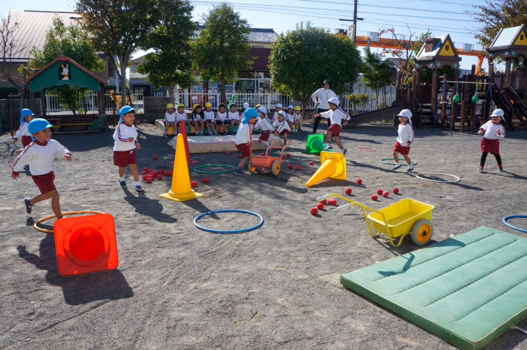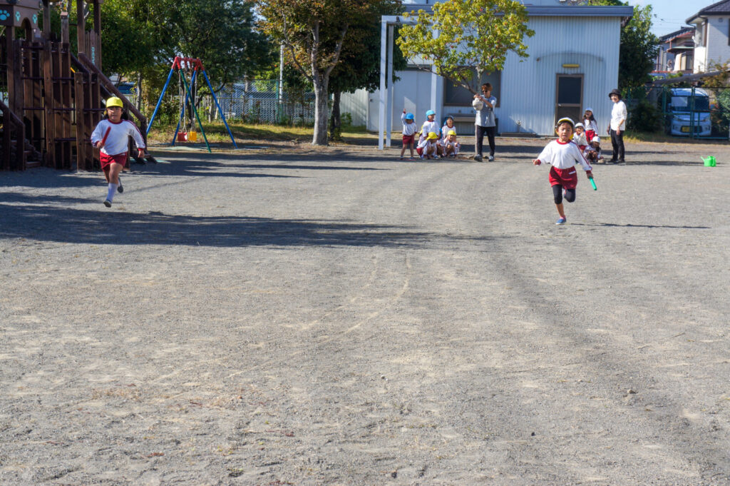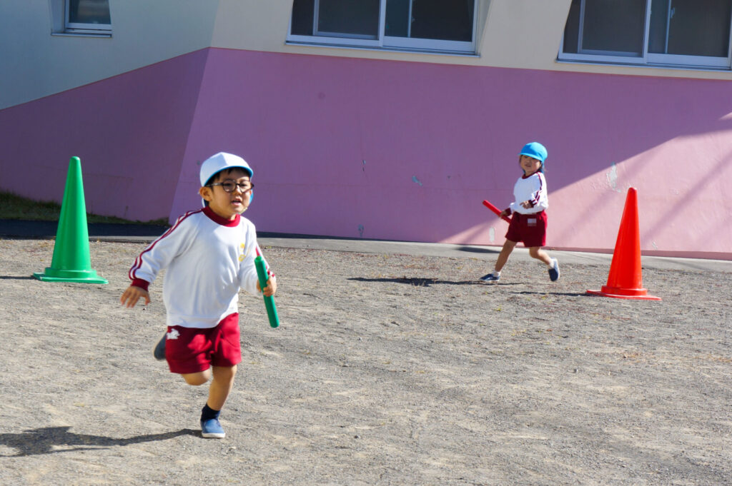 今までもたくさん遊んできたコーンリレーが最後の競技です。並び順を考え、応援の声にも力が入ります。抜かし抜かされ子どもたちも大盛り上がりです!!長い距離も諦めず走ることができました。