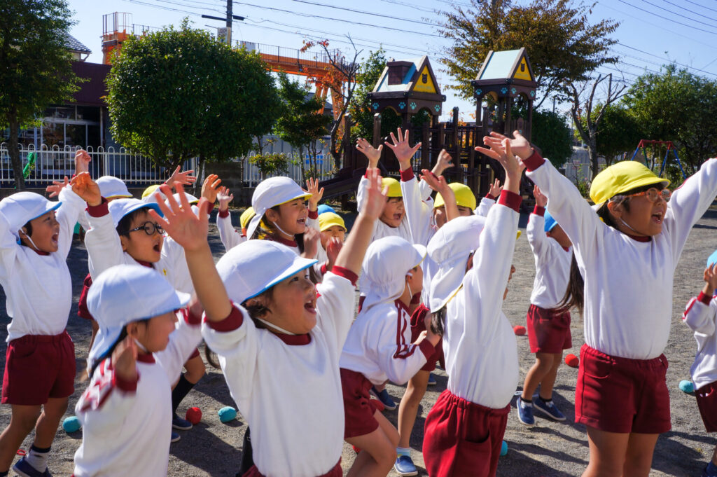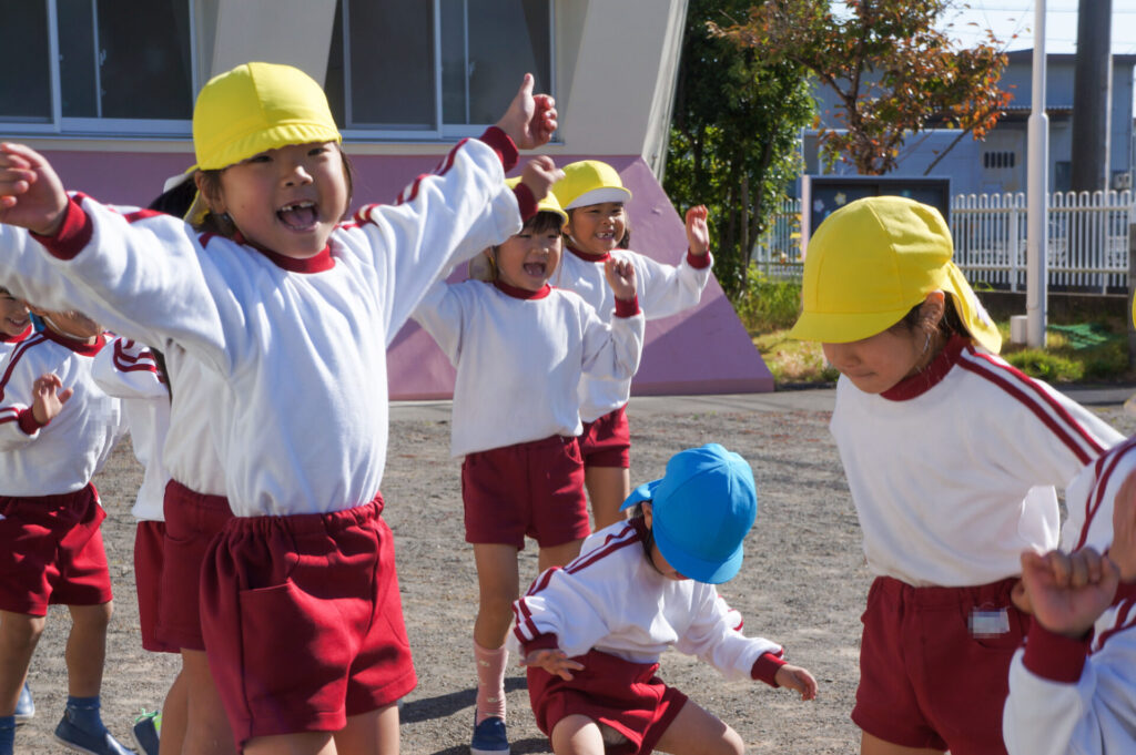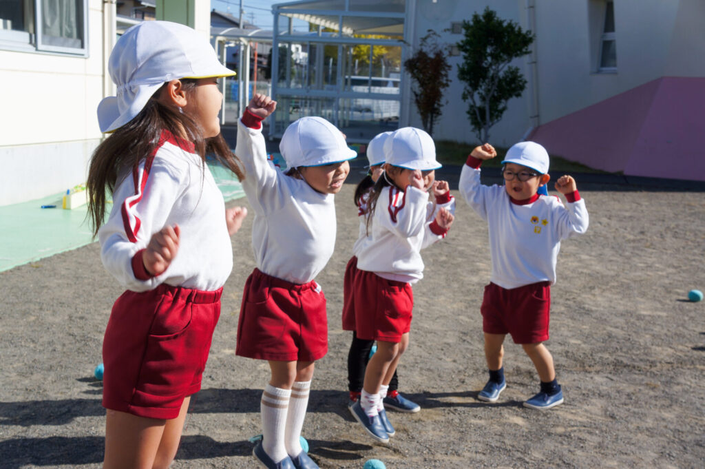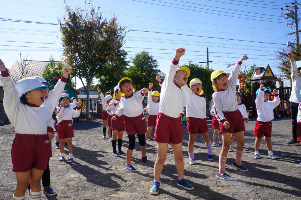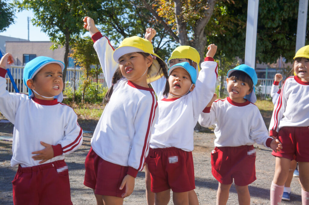 秋晴れのいい天気になり、すみれっこでミニ運動会の開催です!体操着と体操ズボンに着替えて、準備万端です!園全体を「緑チーム」と「赤チーム」に分け対決です。年長児の「はじめの言葉」から始まり、代表者の「エイエイオー!」のかけ声、子どもたちも気合十分です。優勝トロフィーをかけてミニ運動会スタート!