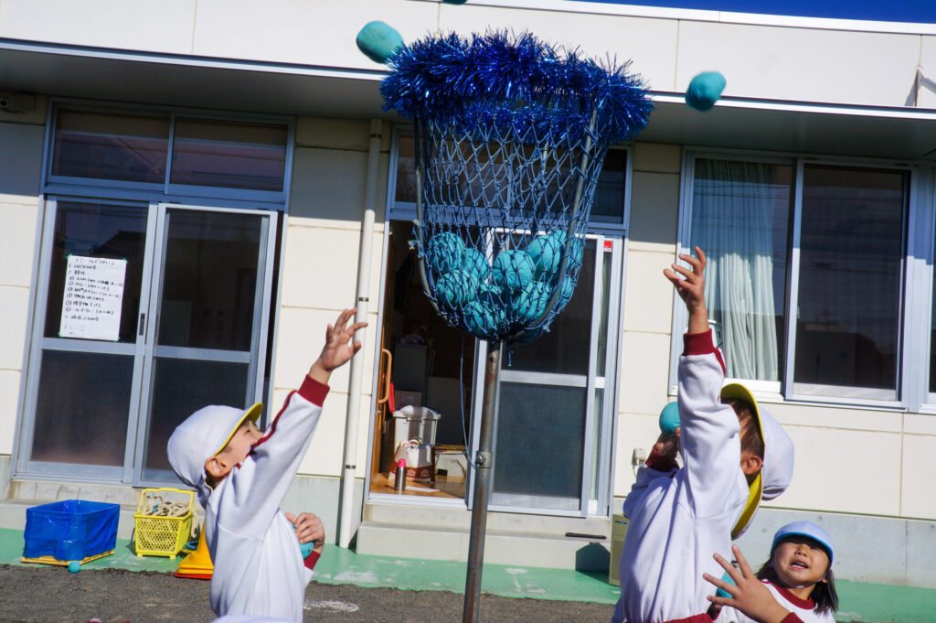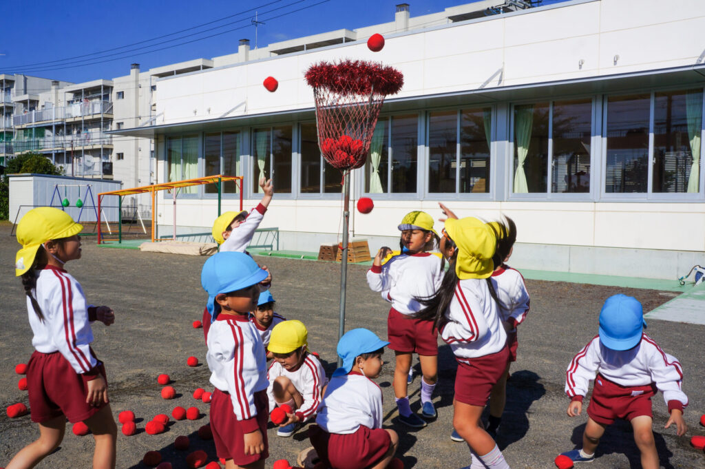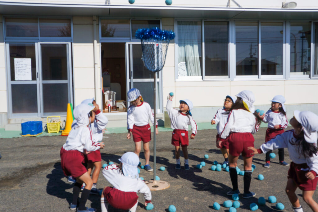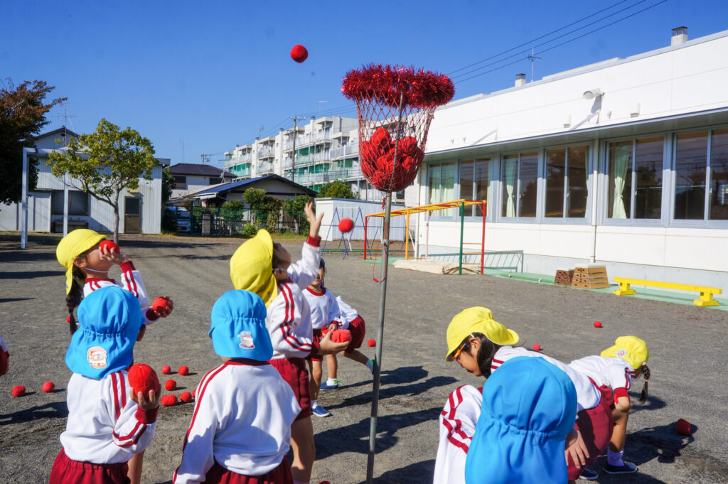 みんなで玉入れ勝負をしました。上から投げる子あり、かごの傍から下から投げる子あり試行錯誤して頑張りました。投げてすぐ次の玉を探すのも上手になりました!