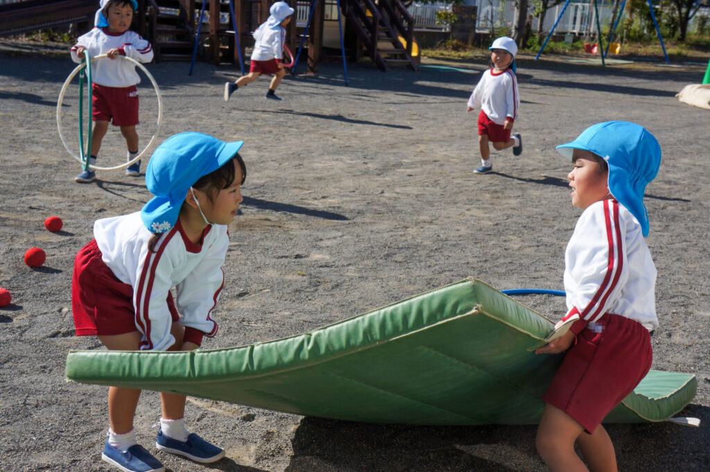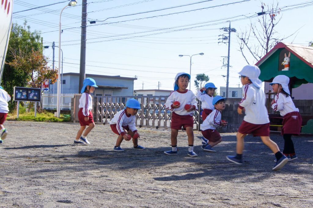 園庭に広がるたくさんの器具(マット、玉、フープ等)を自分の陣地に集めるゲームです。大きいものほど得点は高いですが、1人で運ぶのは大変です。友だちと力をあわせて頑張りました。