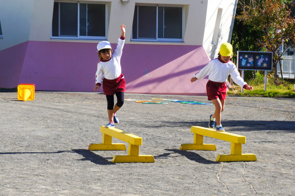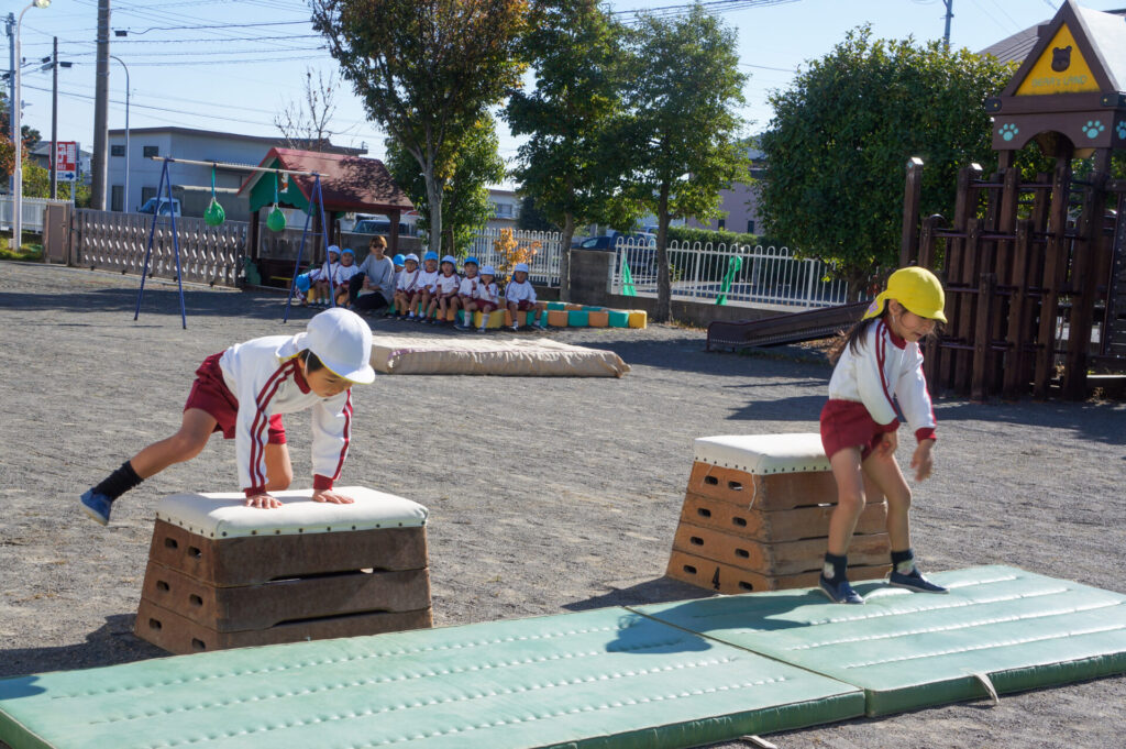 前転、パンチング、両足跳び、ケンケン跳び、平均台、跳び箱、逆上がりと園庭にたくさんの器具を置き挑戦しました。できるようになったものもたくさんあり、素早く障害物に挑戦することができました。