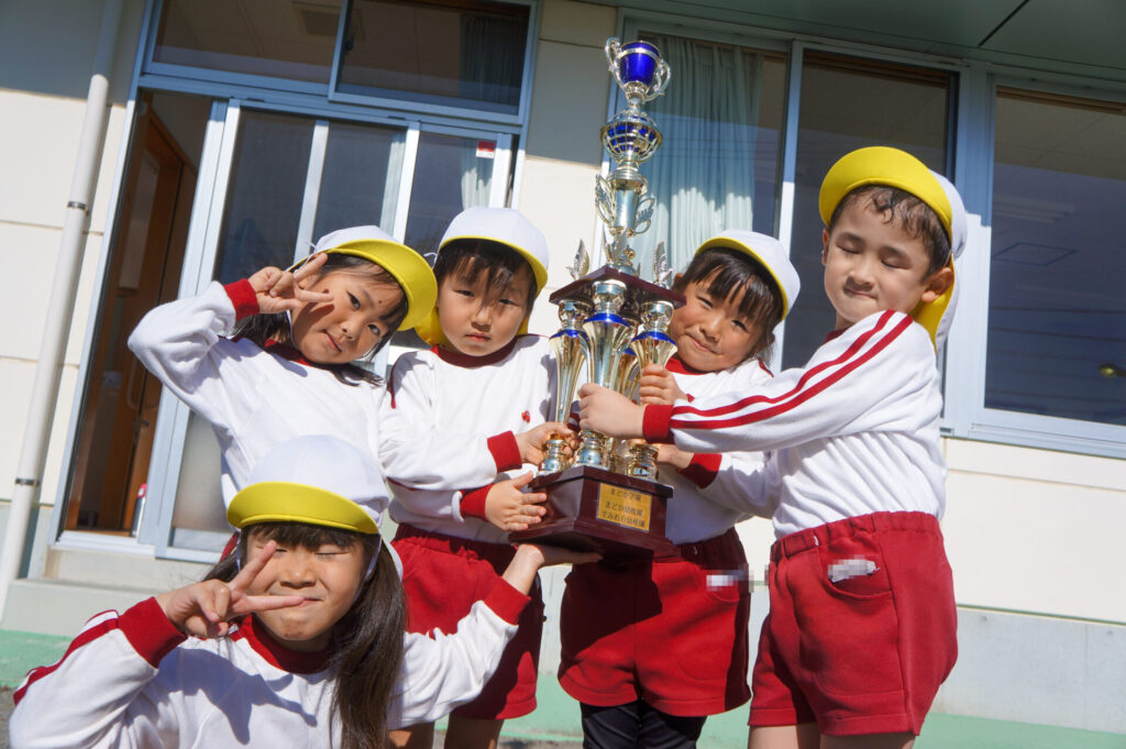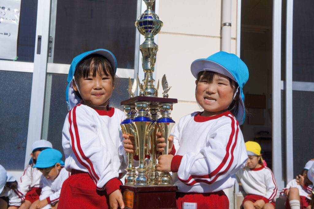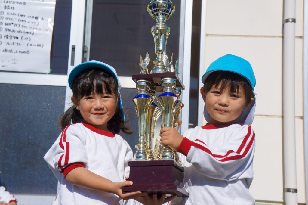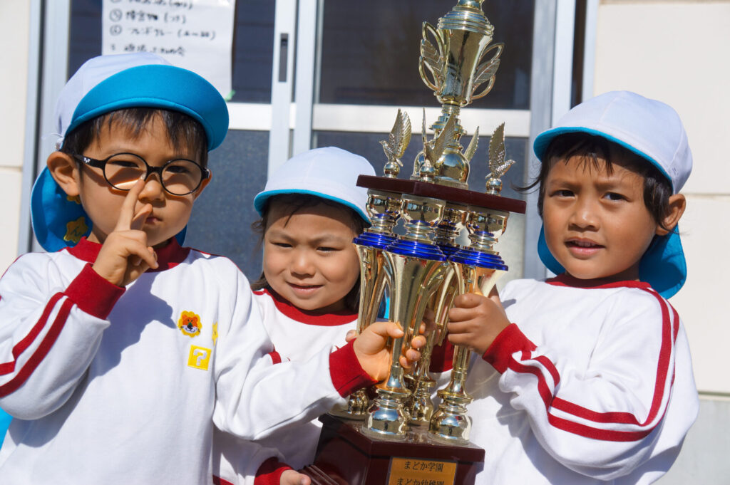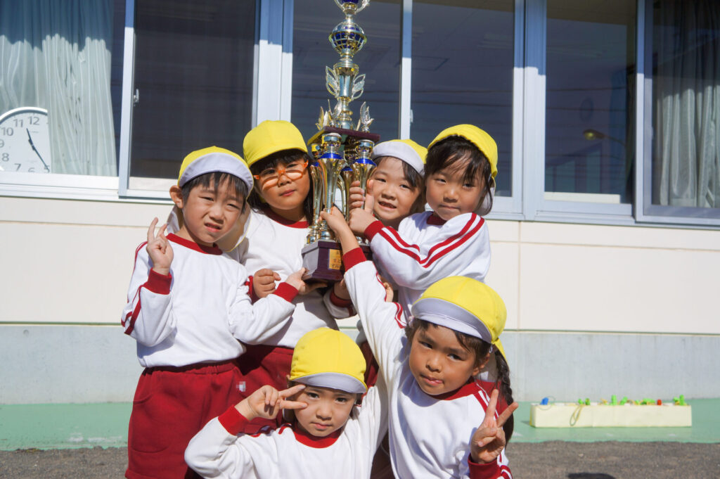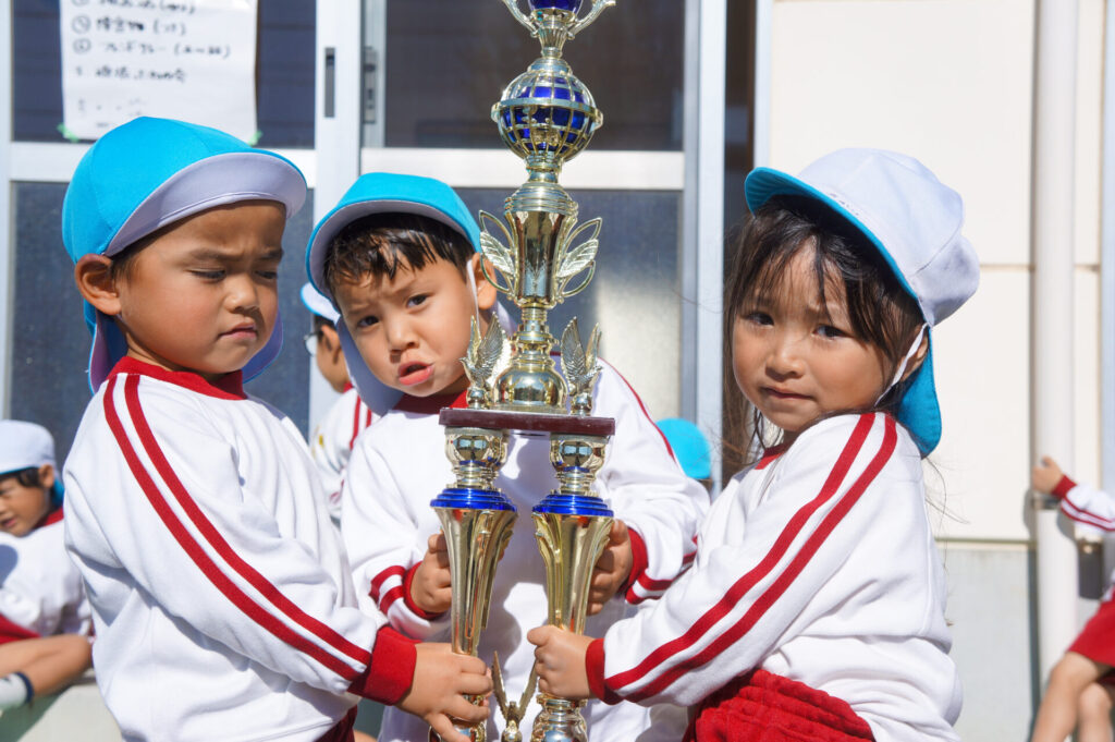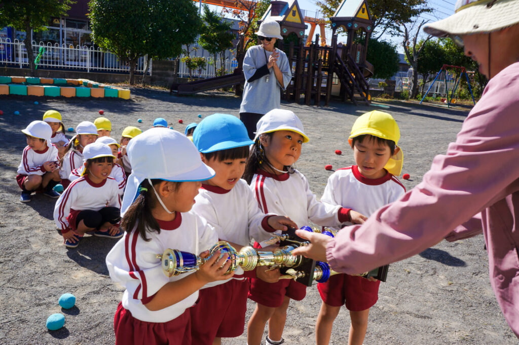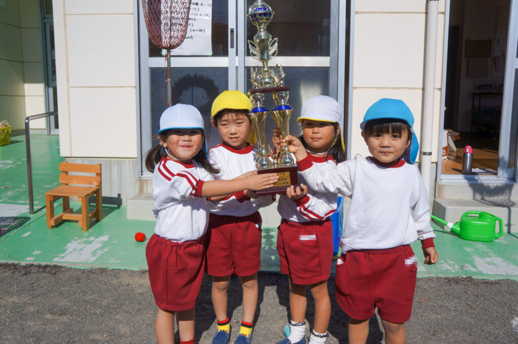 最後は結果発表です。今日の結果は…「緑チーム:48点」「赤チーム:48点」で、まさかの同点でした。どこまでも仲良しのすみれっこです。同点なので緑チームも赤チームも勝ち!!と言うとみんな大喜びでした。1つしかない優勝トロフィーを誰が取りに行くのか…と子どもたちの中で協議が行われ、それぞれのクラスから代表者を出し無事優勝トロフィーがすみれっこの手元に届きました。
