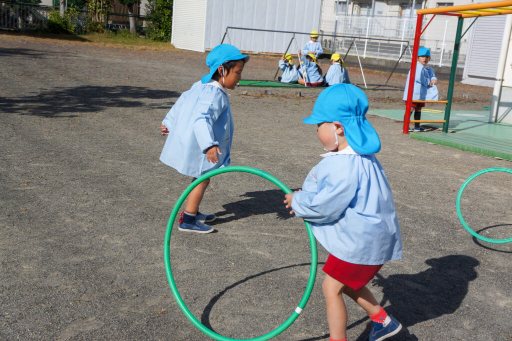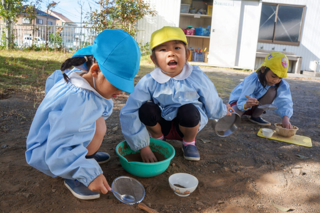 園庭では「氷鬼する人??」とつき組が声をかけ園庭を駆け回ったり、ボウルいっぱいにサラ粉を集めて遊んだり、器具や遊具で目いっぱい遊んでいます。最後の片付けも上手になり「お片付けよ~」とゆり組さんも大きな声で言って、マットや砂場の片付けも一緒になり頑張っています。