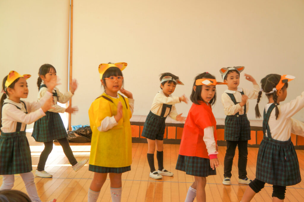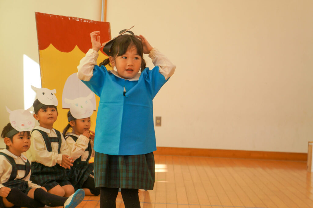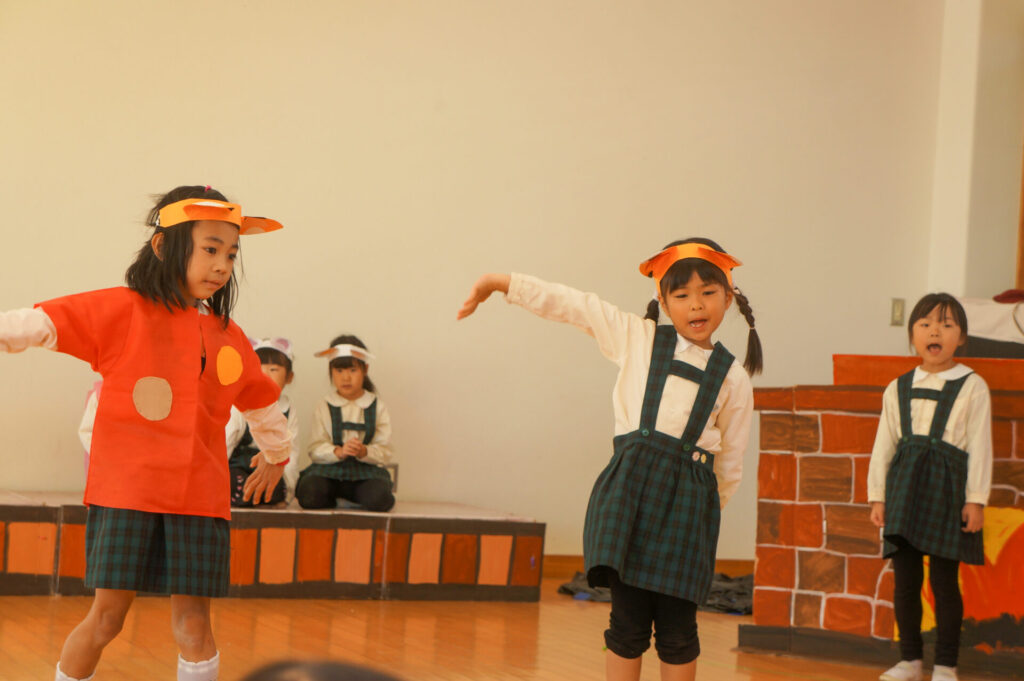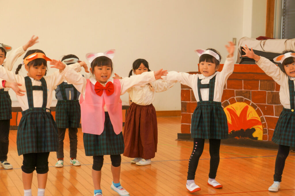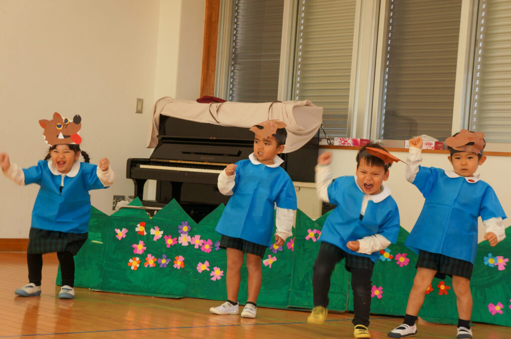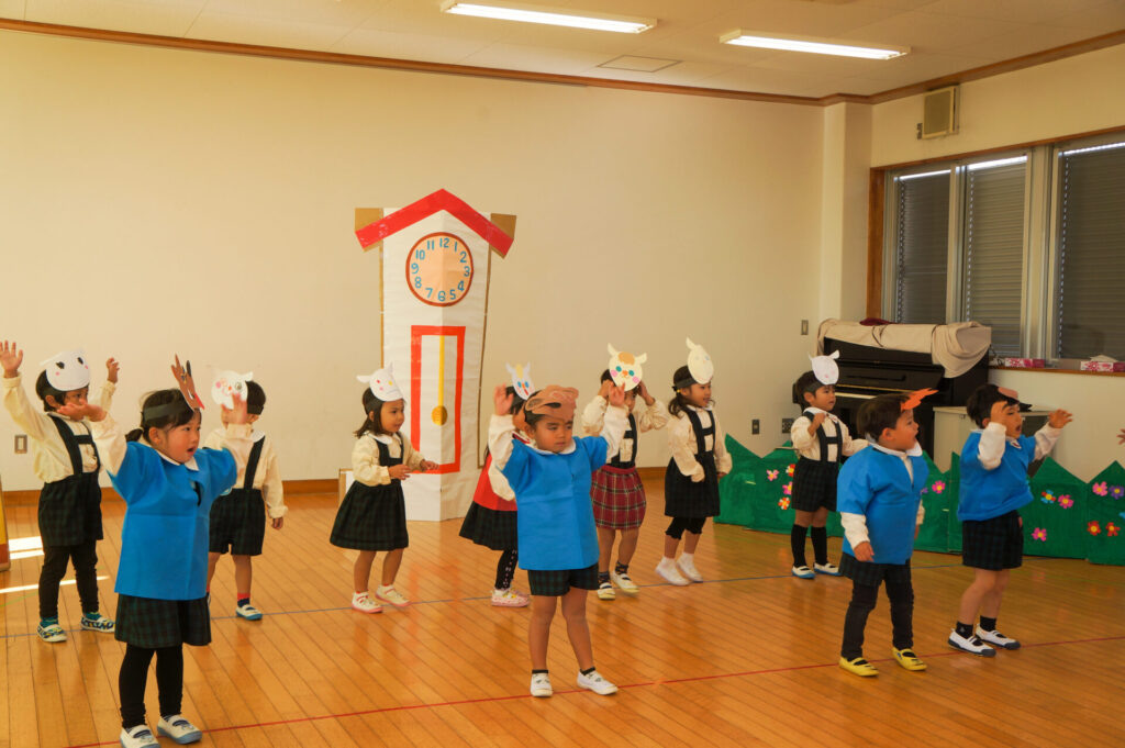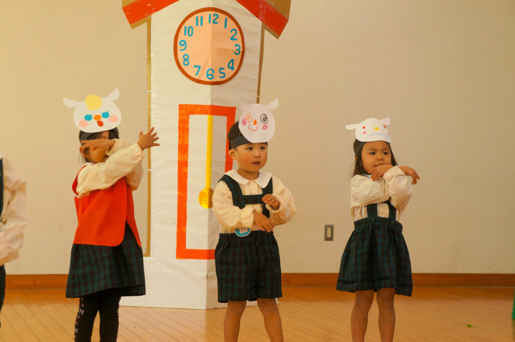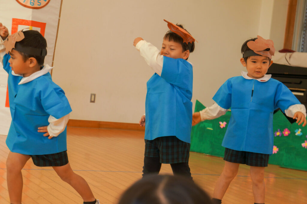 今日は、お互いの舞踊劇を見せ合い、音楽発表会ごっこをして楽しみました。当日を意識して少しずつ練習し、音楽発表会のイメージを膨らませていきたいと思っています。おうちでも「なんの役になったの?」「どんなお話の舞踊劇やるの?」など子どもたちと話をしてみてください。
