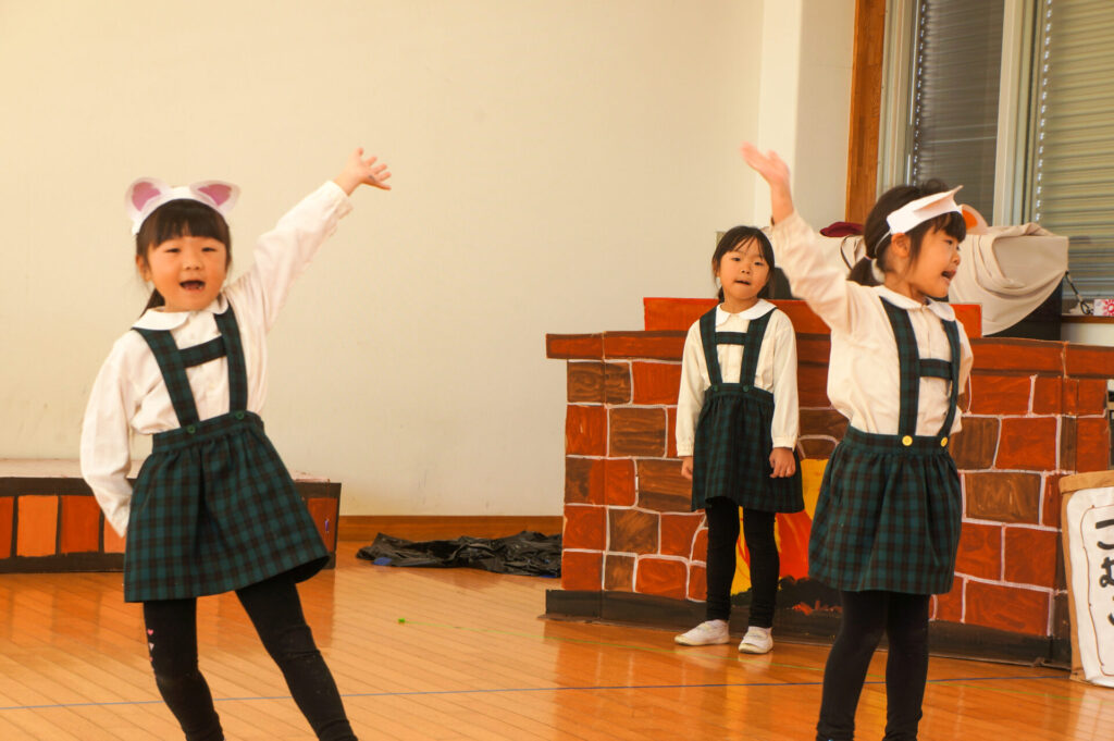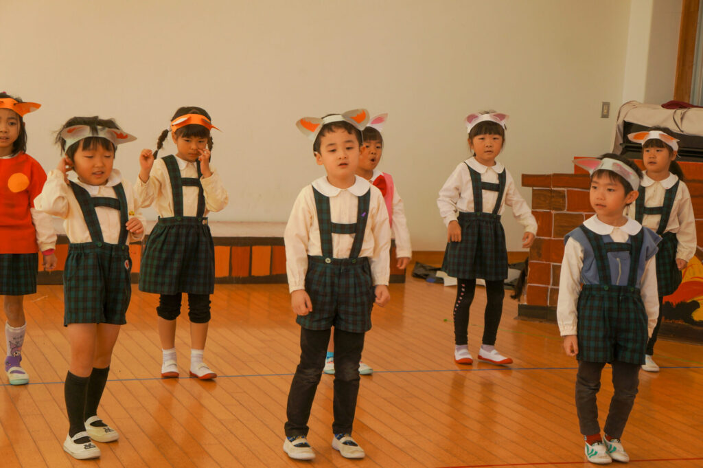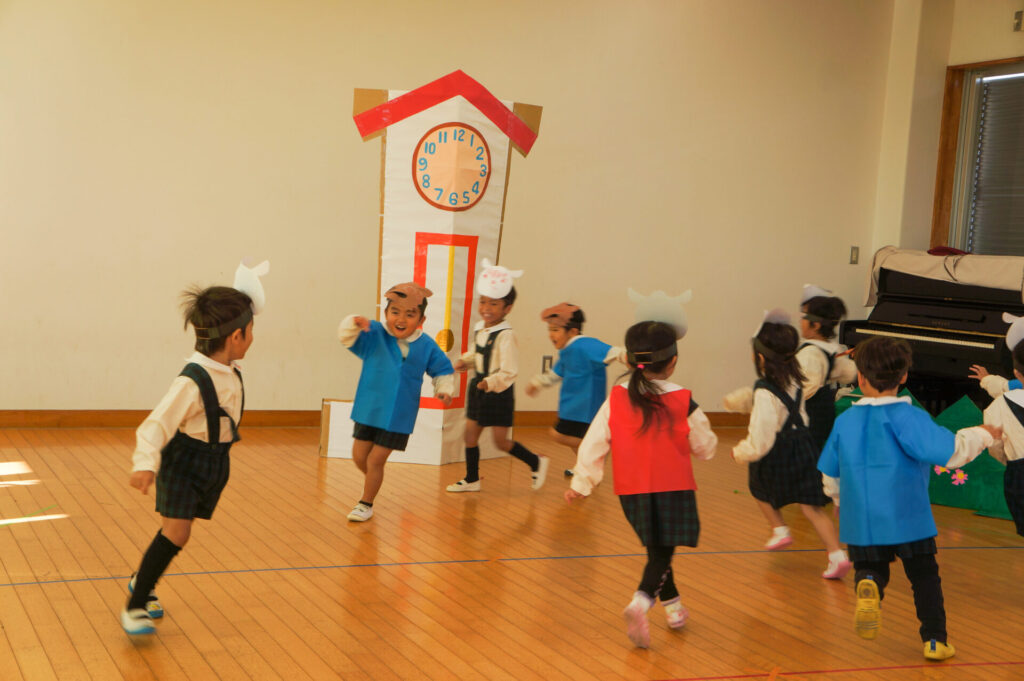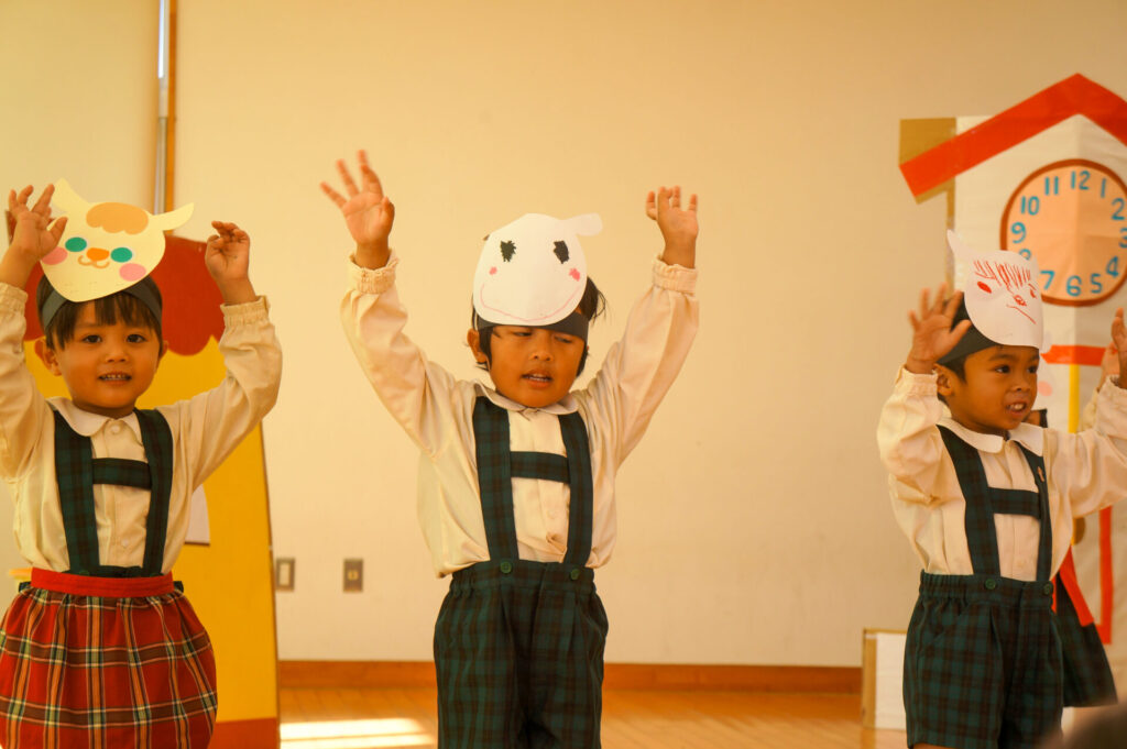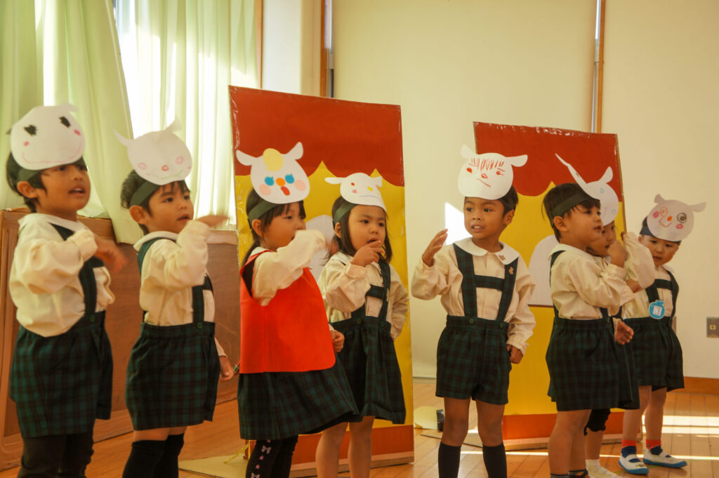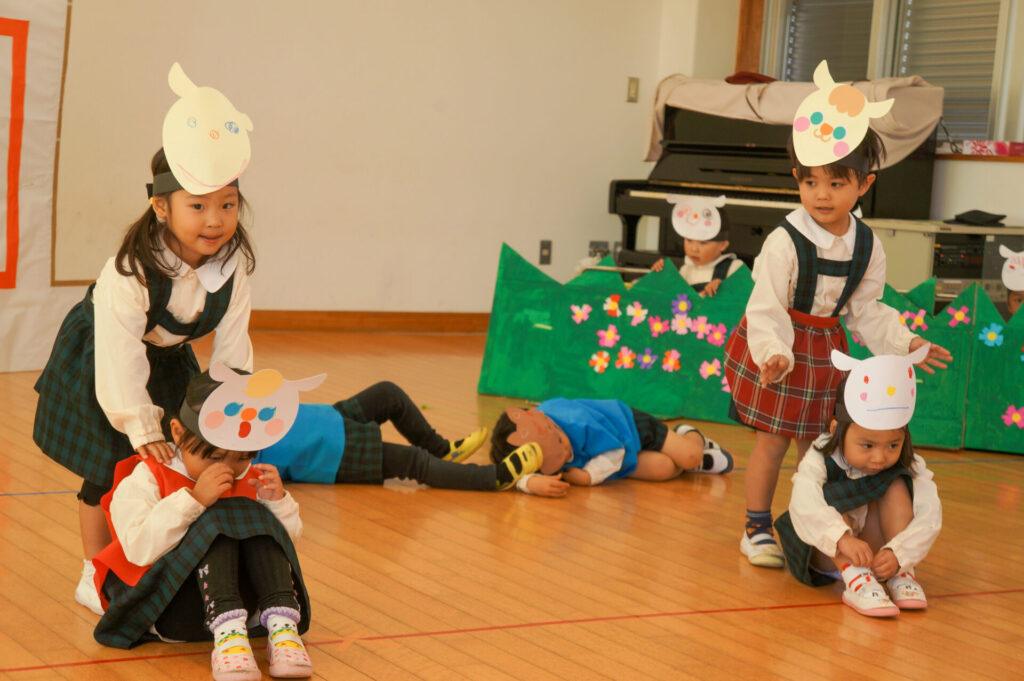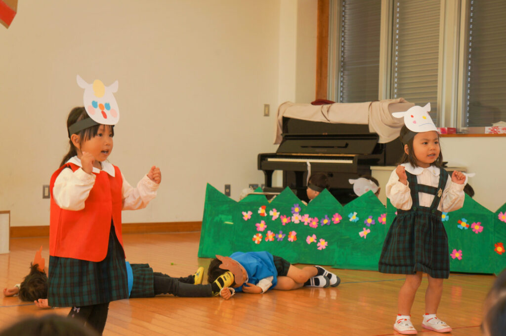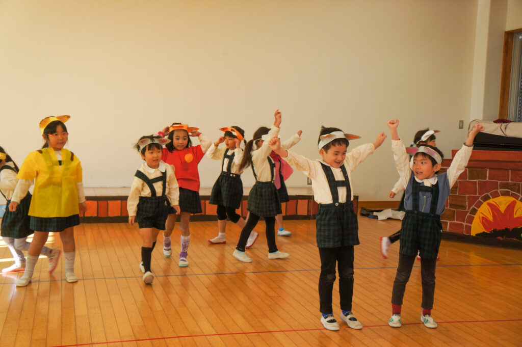 今日は、お互いの舞踊劇を見せ合い、音楽発表会ごっこをして楽しみました。当日を意識して少しずつ練習し、音楽発表会のイメージを膨らませていきたいと思っています。おうちでも「なんの役になったの?」「どんなお話の舞踊劇やるの?」など子どもたちと話をしてみてください。