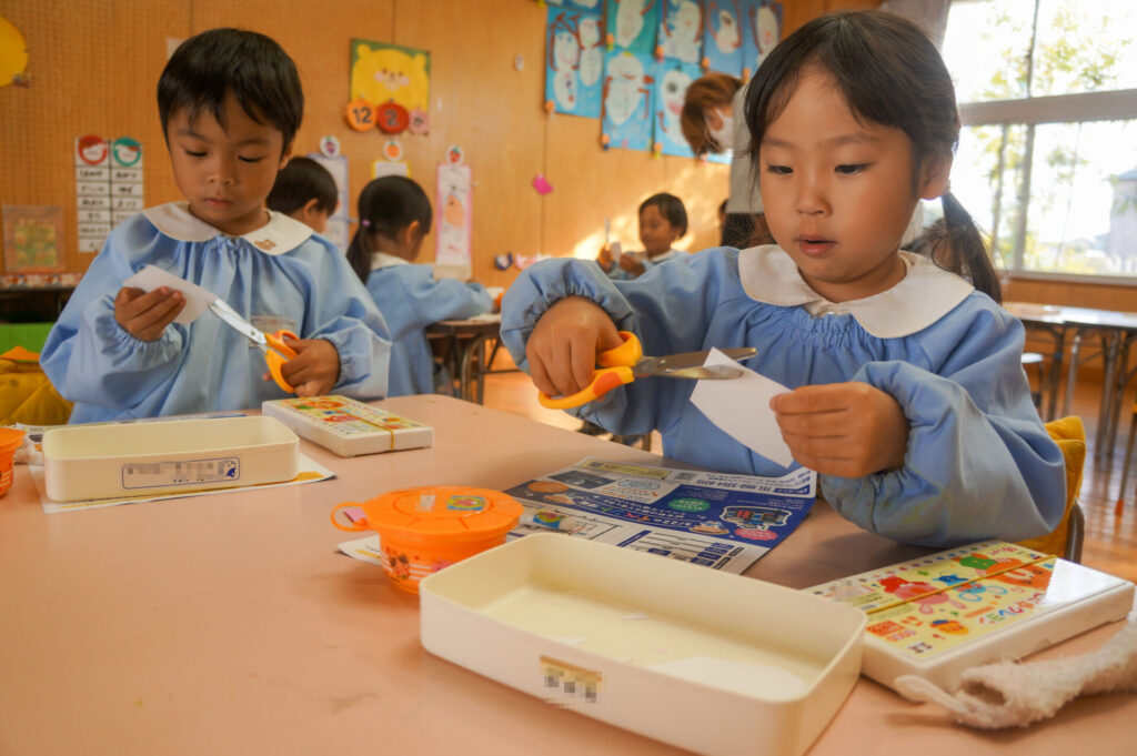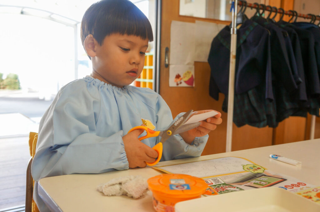 今日は、クリスマス会の時にかぶる「クリスマス帽子」を作りました。今年は、雪だるまが付いた帽子を作ります。四角い画用紙の角を切り落とし丸に近い形にしていきます。