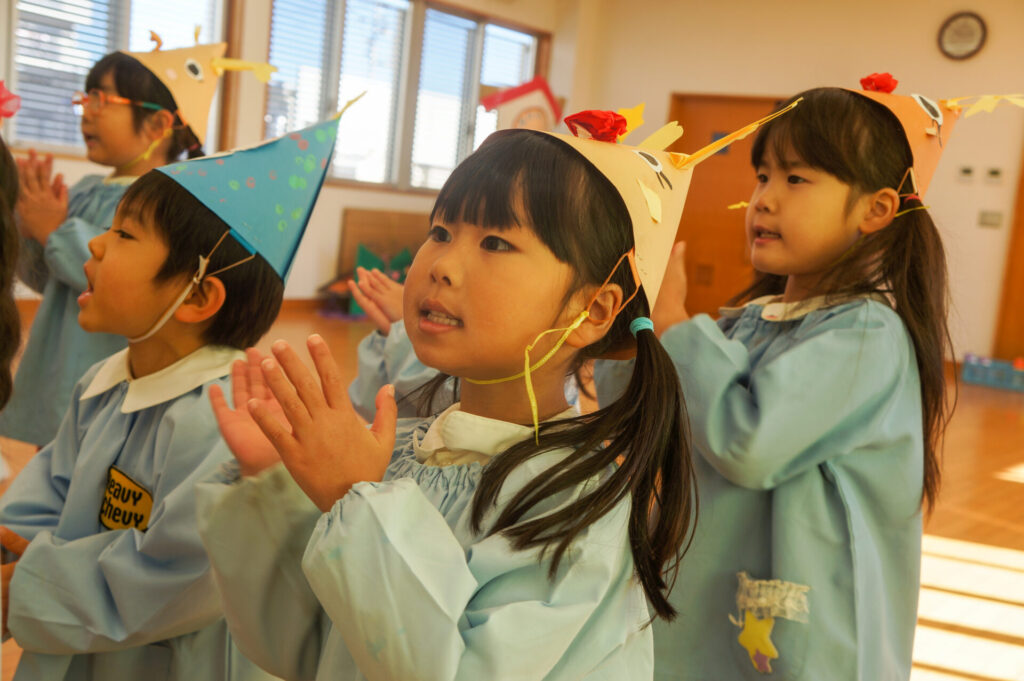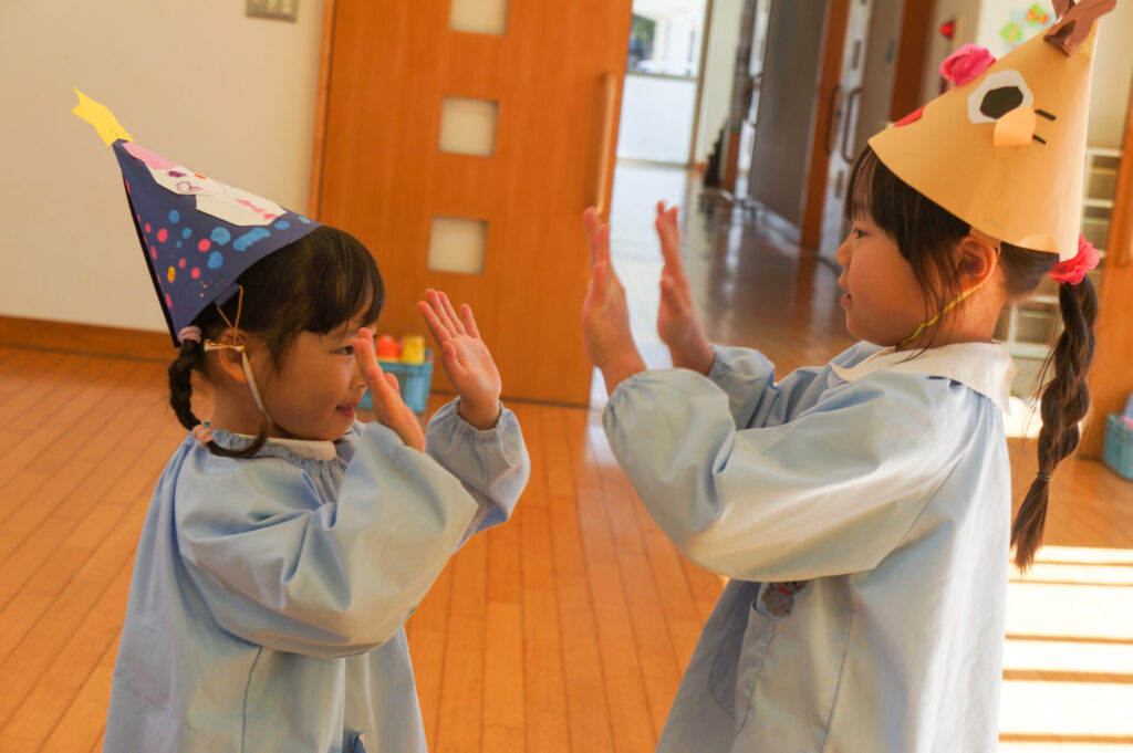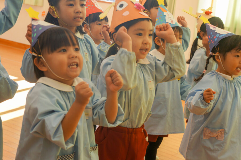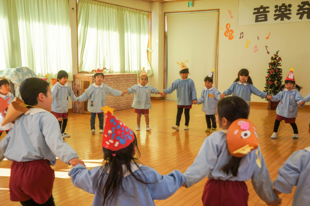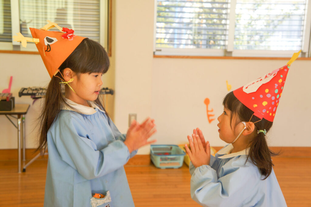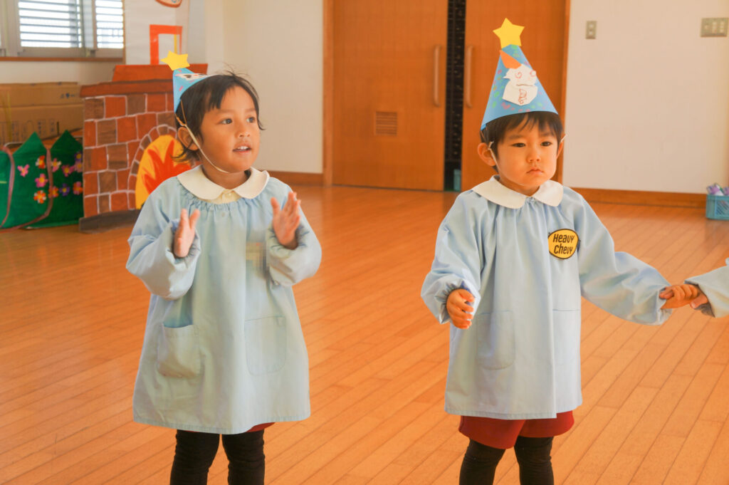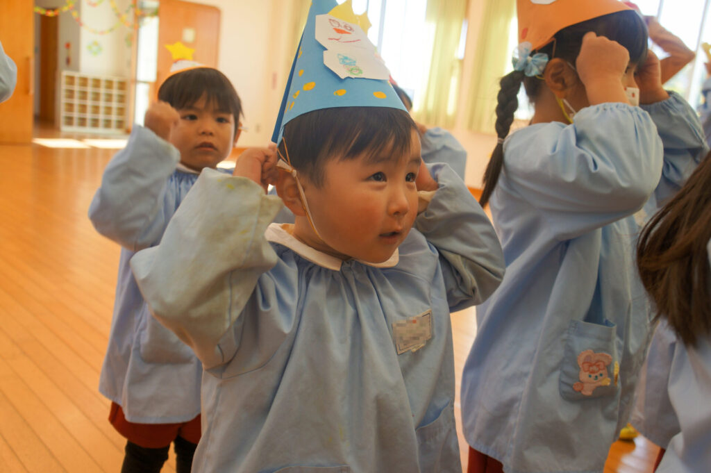 手作りの三角帽子を被りクリスマス会に参加です。クリスマスの由来を聞いたり「あわてんぼうのサンタクロース」を歌ったり、「ジングルベル」の触れ合いダンスをしたり笑い声がホールに響きました。
