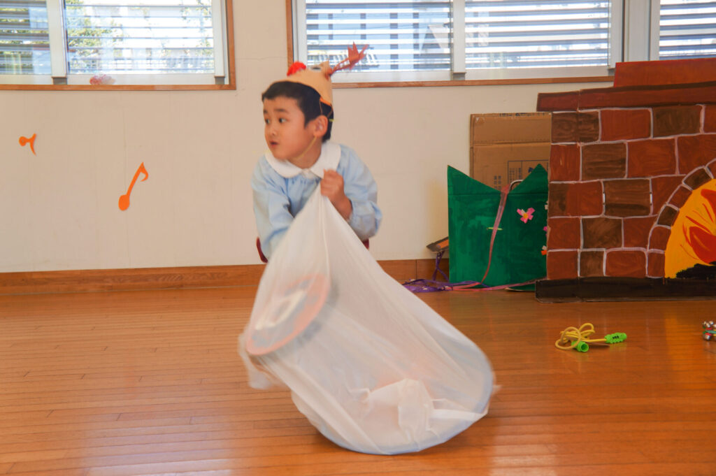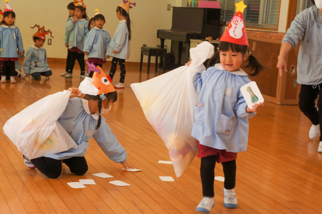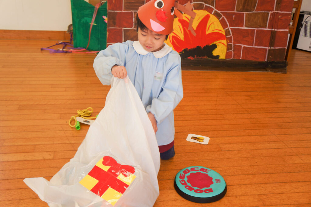 そして「サンタクロースのお手伝い」のミニゲームもして盛り上がりました。白い袋を持って、絵カード1枚引き絵カードに描かれているものと同じものを袋に入れるゲームです。絵カードには「人形」「鈴」「絵本」いろいろな種類があり、同じものをみつけるのもとても楽しそうにしていました。