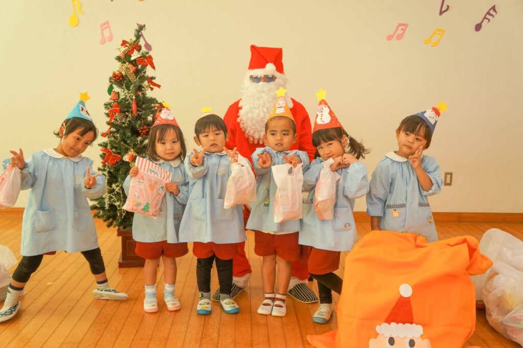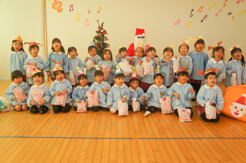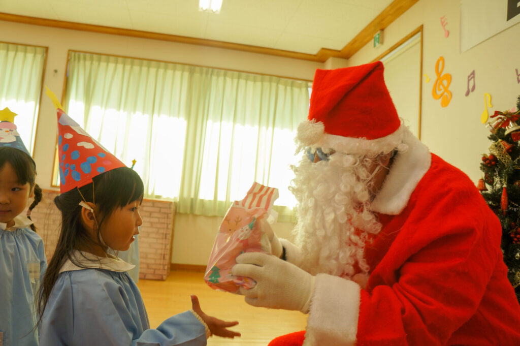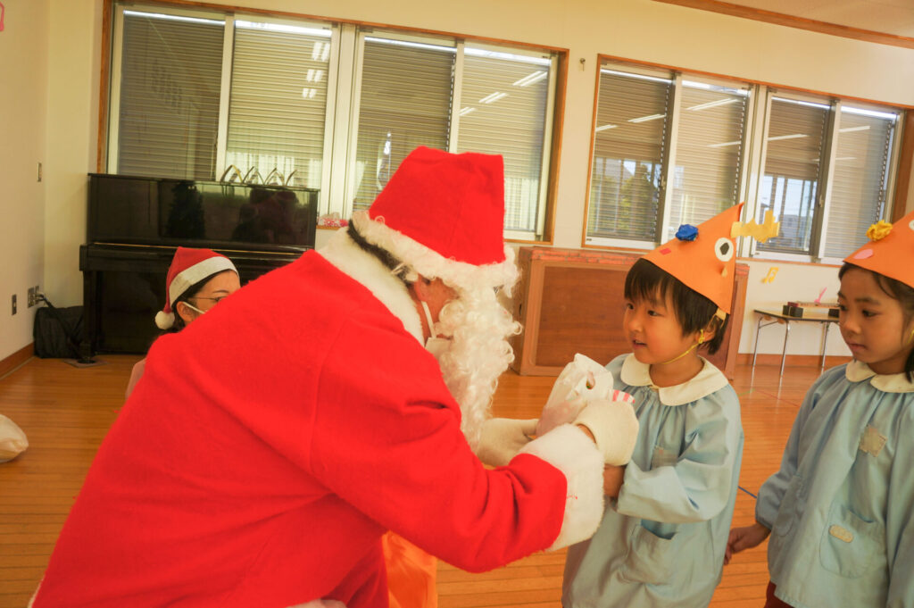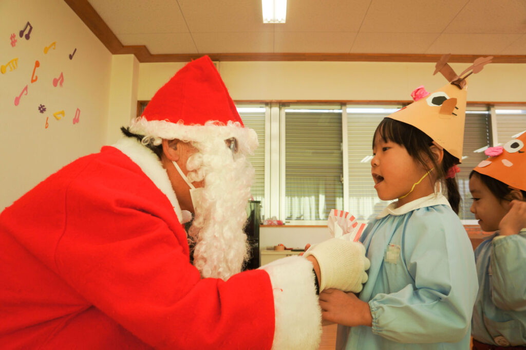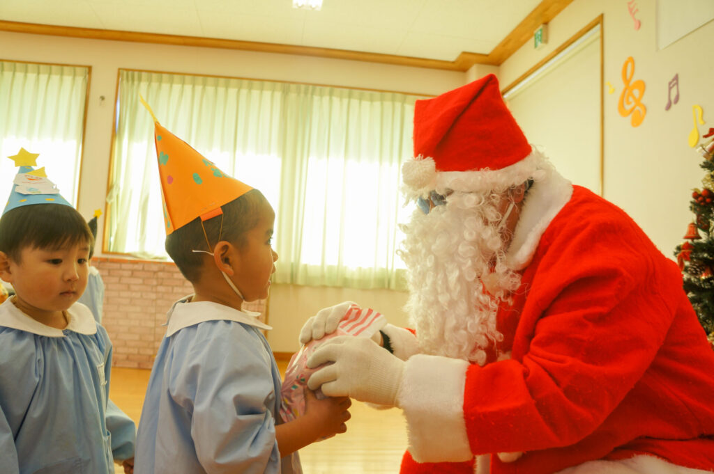 そんなクリスマス会の最中に、真っ赤な服のサンタクロースが登場!今年もすみれっこのもとへ会いに来てくれました!「メリークリスマス!」のかけ声が園内に響きました。サンタさんから一人ずつ素敵なプレゼントをもらい「ありがとう」とお礼も言うことができました。サンタさんからもらったプレゼントを大事に握りしめていた姿がとてもかわいかったです。