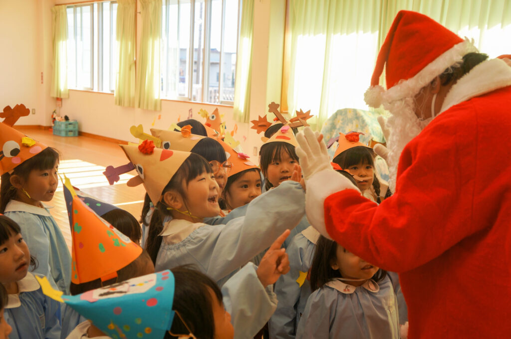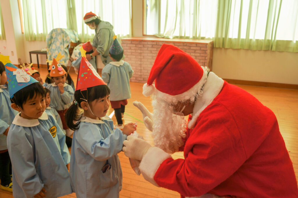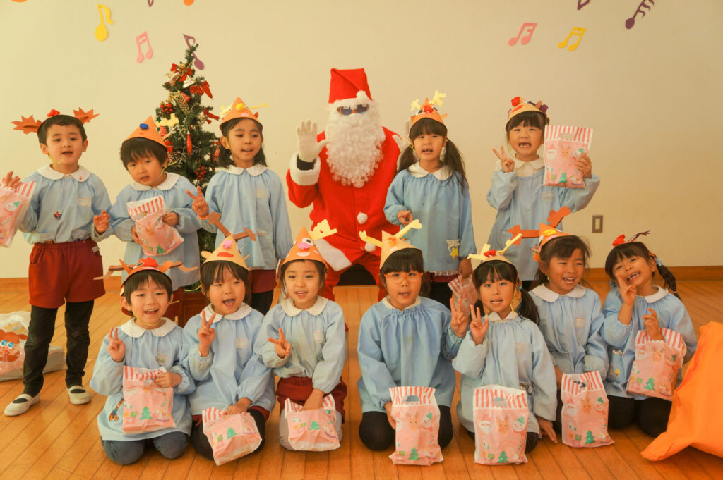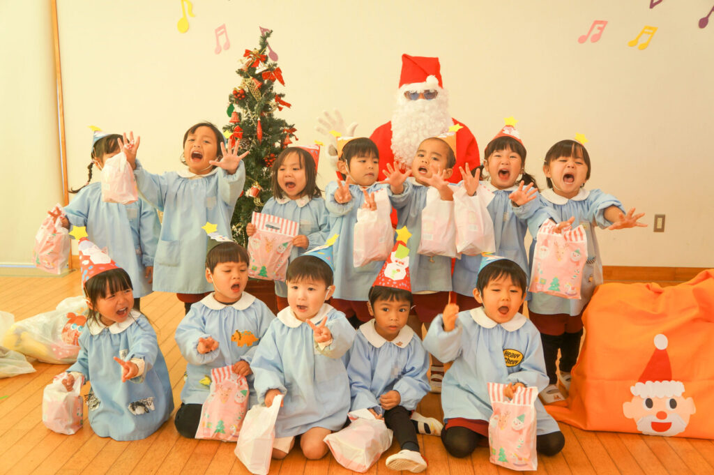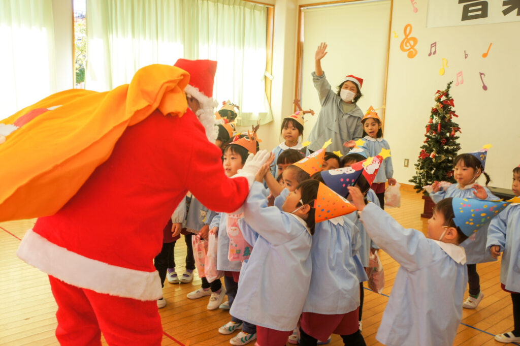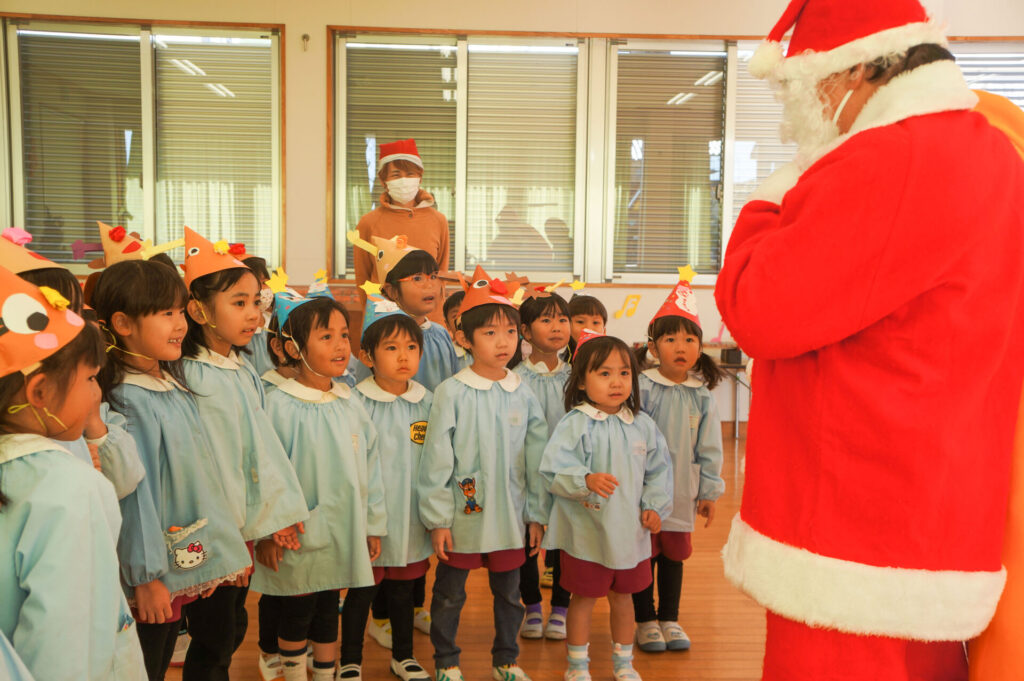 そんなクリスマス会の最中に、真っ赤な服のサンタクロースが登場!今年もすみれっこのもとへ会いに来てくれました!「メリークリスマス!」のかけ声が園内に響きました。サンタさんから一人ずつ素敵なプレゼントをもらい「ありがとう」とお礼も言うことができました。サンタさんからもらったプレゼントを大事に握りしめていた姿がとてもかわいかったです。