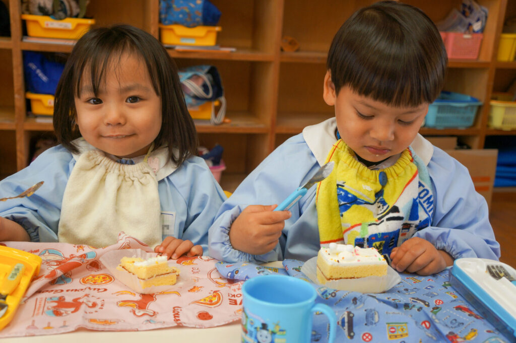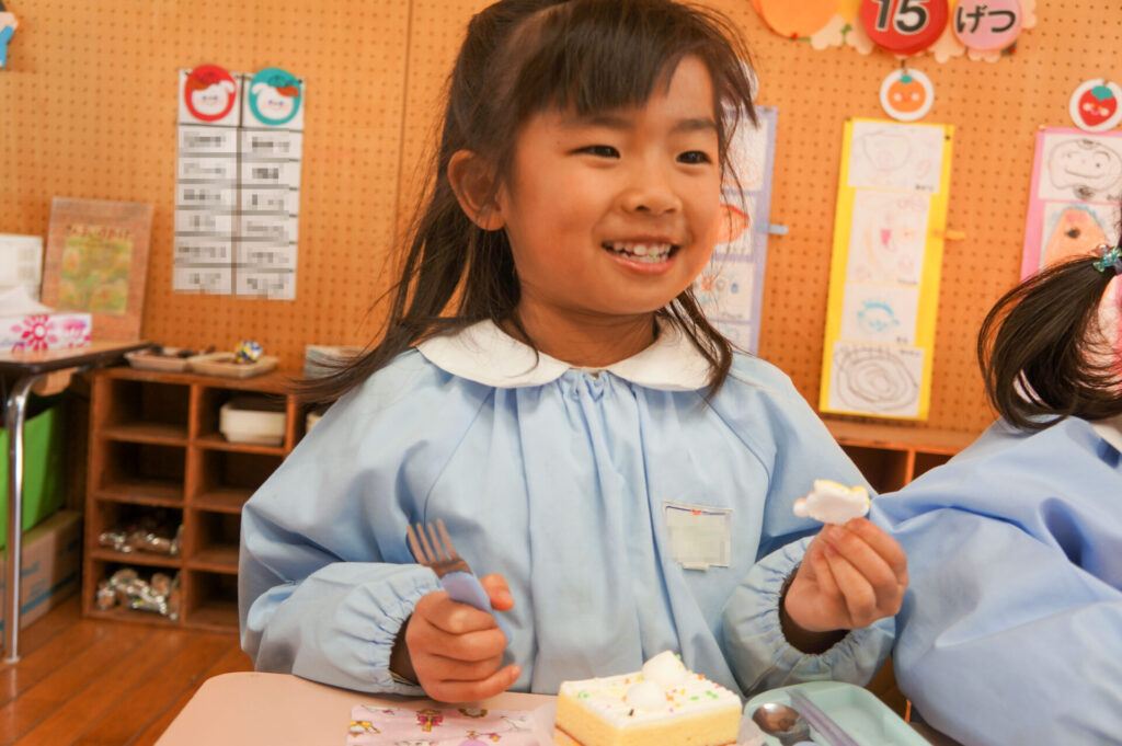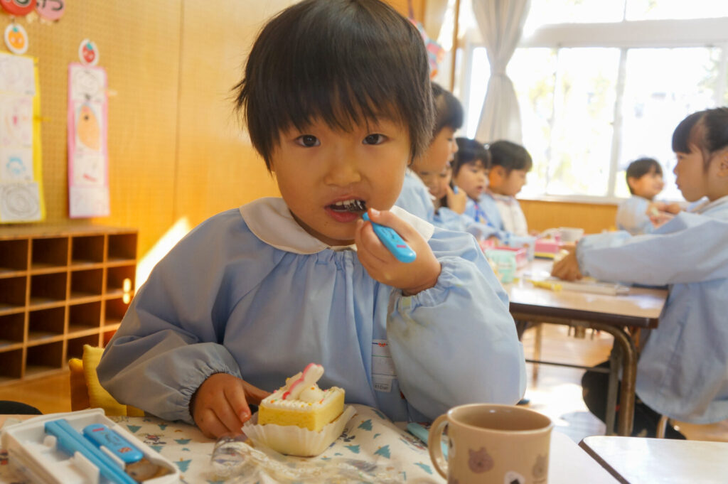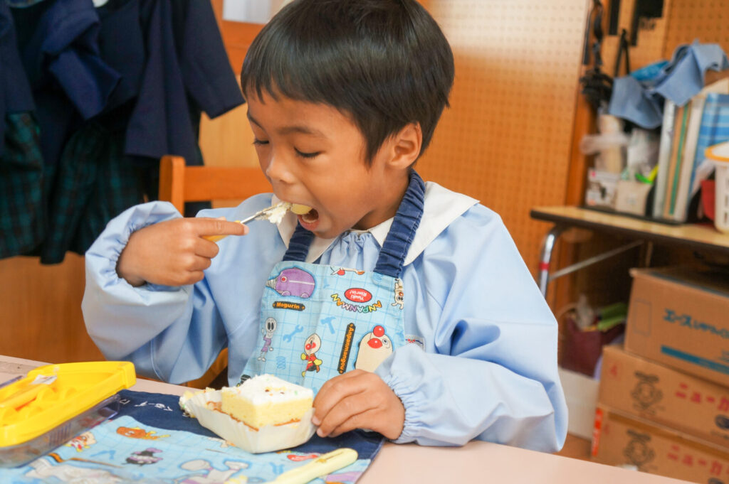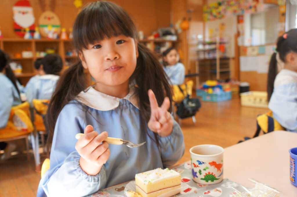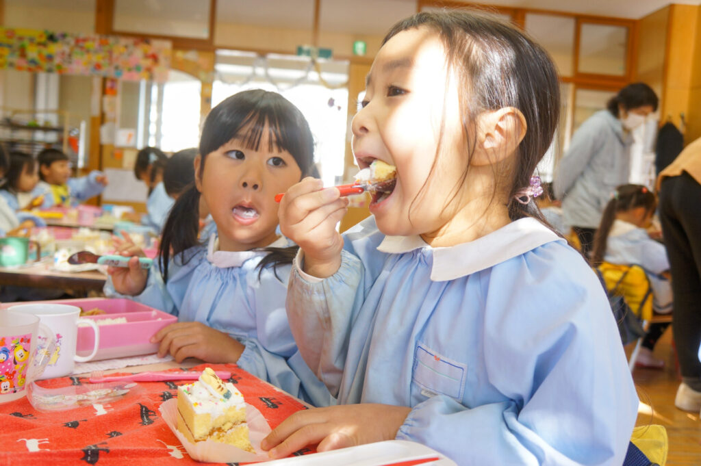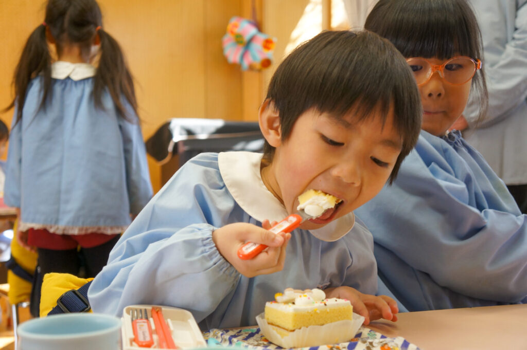 食後は楽しみにしていたクリスマスケーキです。給食をモリモリ食べ、ケーキもおいしくいただき、お腹いっぱいです。楽しいクリスマス会になりました。おうちでもお話聞いてみてくださいね。