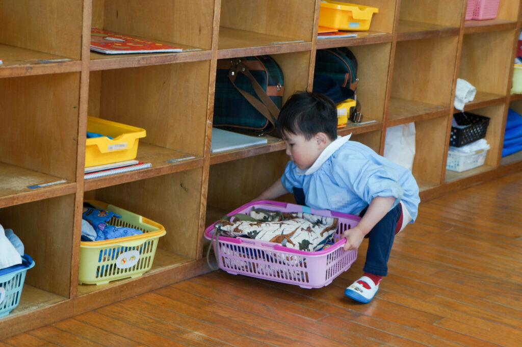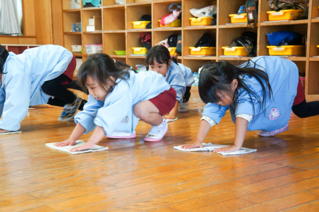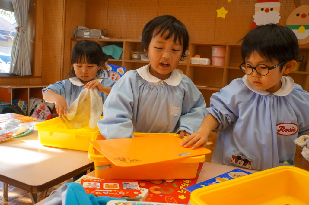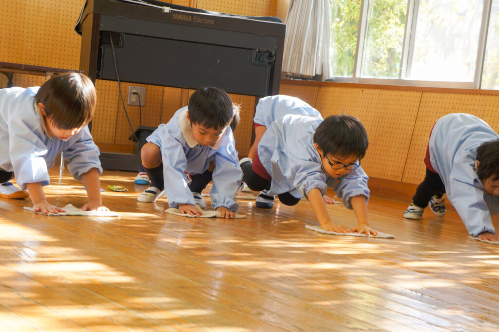 12月も終わりに近付き、園内でも大掃除をしています。今日は、ゆり組の子どもたちが毎日使っているお道具箱の掃除や保育室の雑巾がけをしました。