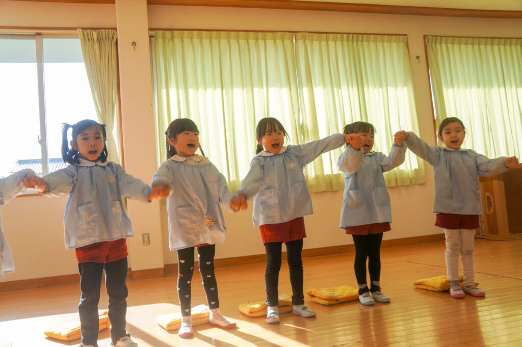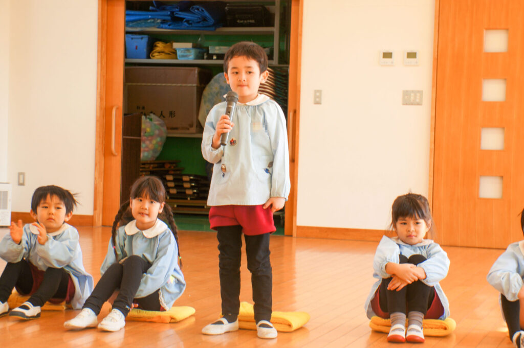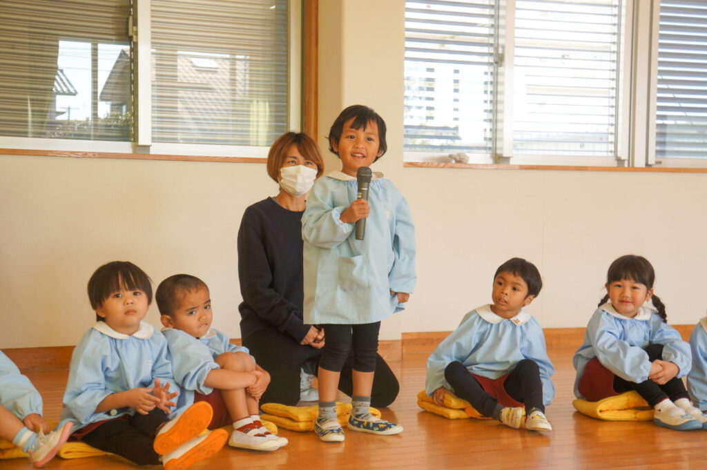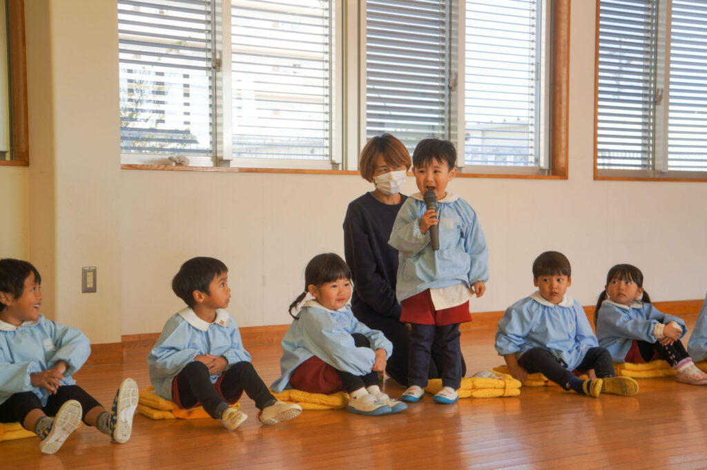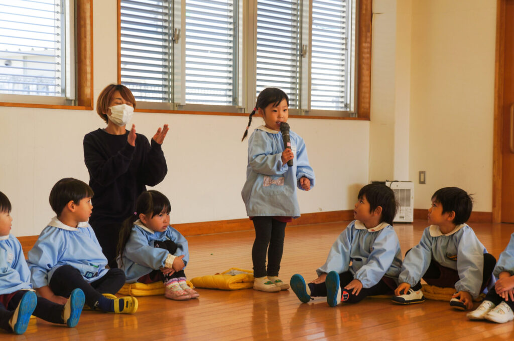 今日で楽しかった2学期も終わりです。すみれっ子がホールに集まり、楽しかった思い出を話したり、頑張りや成長を互いに褒め合いました。