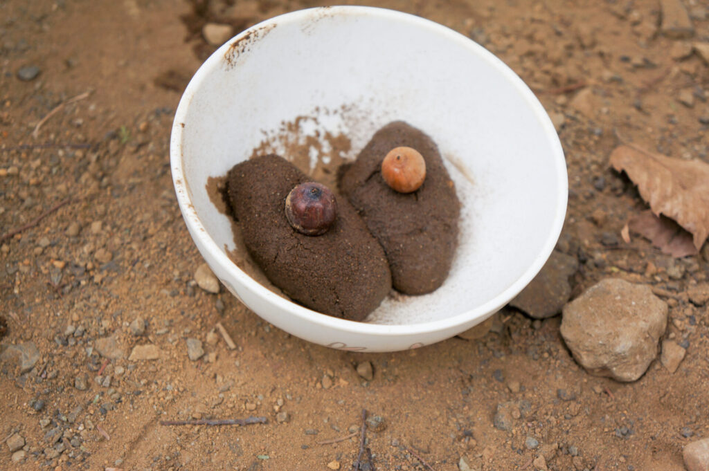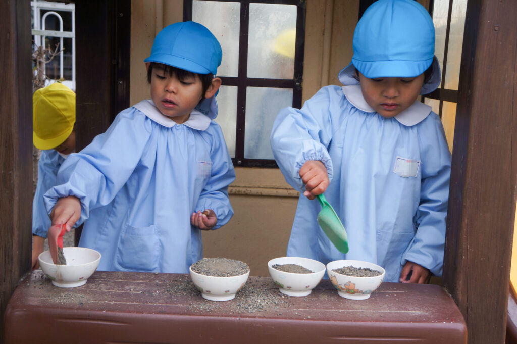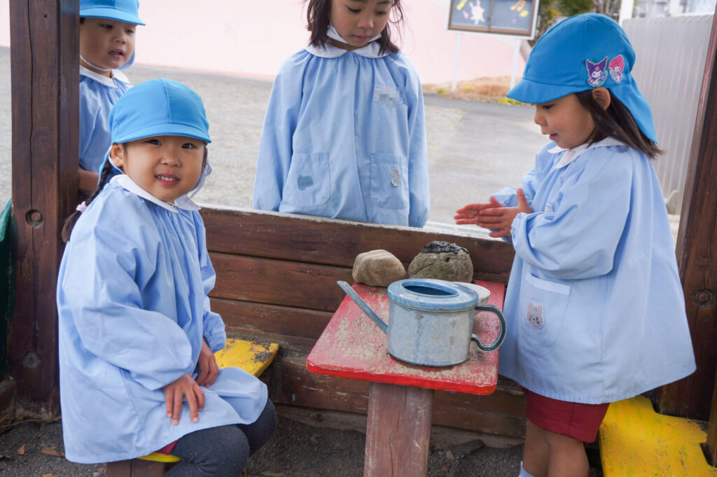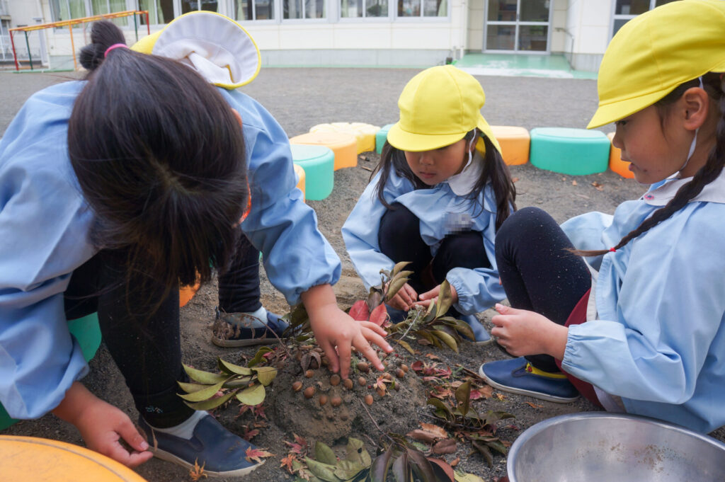 朝の戸外遊びでは、遊具で遊んだりどんぐりを使ってケーキやお餅を作ったり、寒さも忘れて楽しく遊んでいます。毎朝、戸外に出るとみんなで縄跳びにも挑戦しています。年長つき組は、前回し跳びや後ろ回し跳び、ケンケン跳びに挑戦していて回数を決めて毎日頑張っています。年少ゆり組は「まわしてピョン」で縄を回し跳ぶ練習をしています。