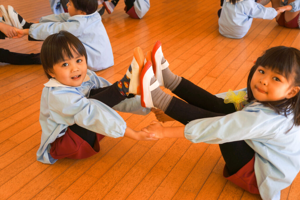 お誕生日さんの自己紹介や歌の発表もとても立派にできました。たくさんの拍手にとても嬉しそうにしていました。そして、今回のお楽しみは「組体操」です。つき組が手本となり、一緒に組体操をして遊びました。