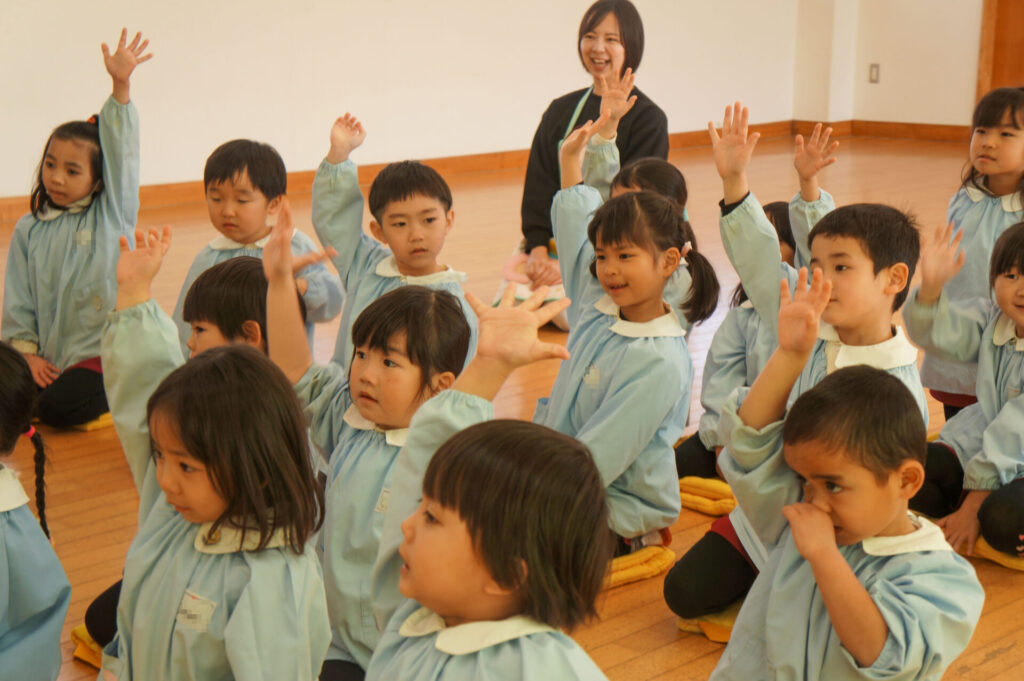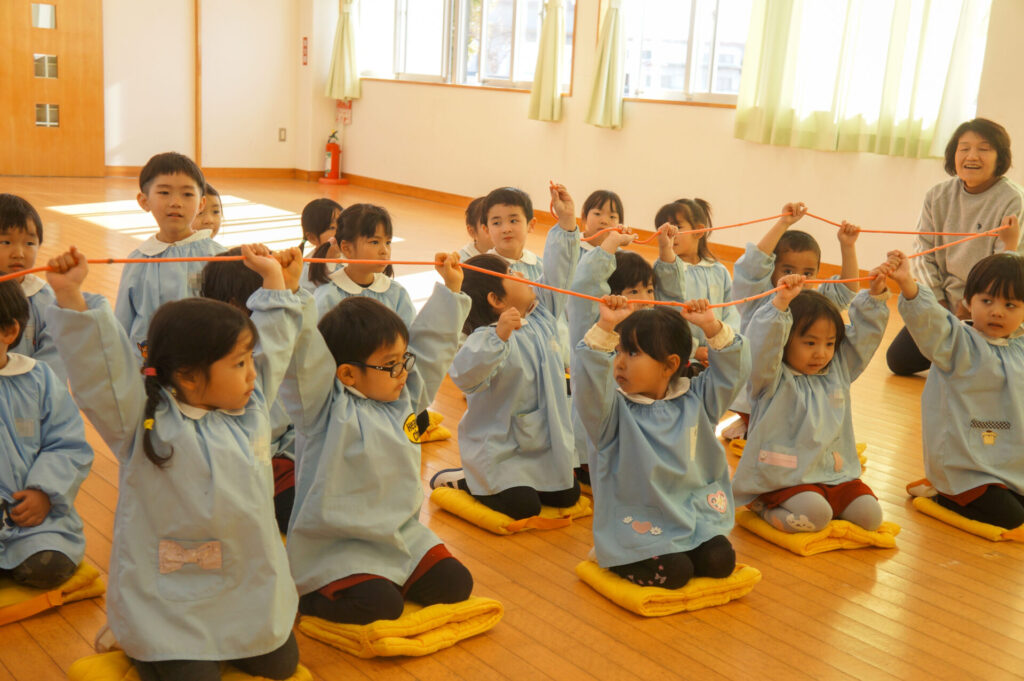 エプロンシアターでは、体の中の仕組みも教えてもらいました。みんなが食べたものは胃を通って、小腸、大腸を通って「うんち」になることも見て学ぶことができました。小腸の長さを知るために、小腸と同じ長さの紐を持つと「長い!!」と、驚きと発見がたくさんありました。