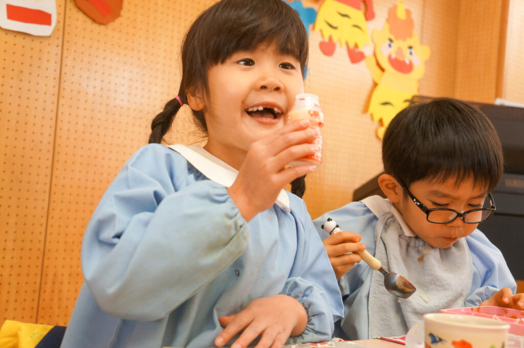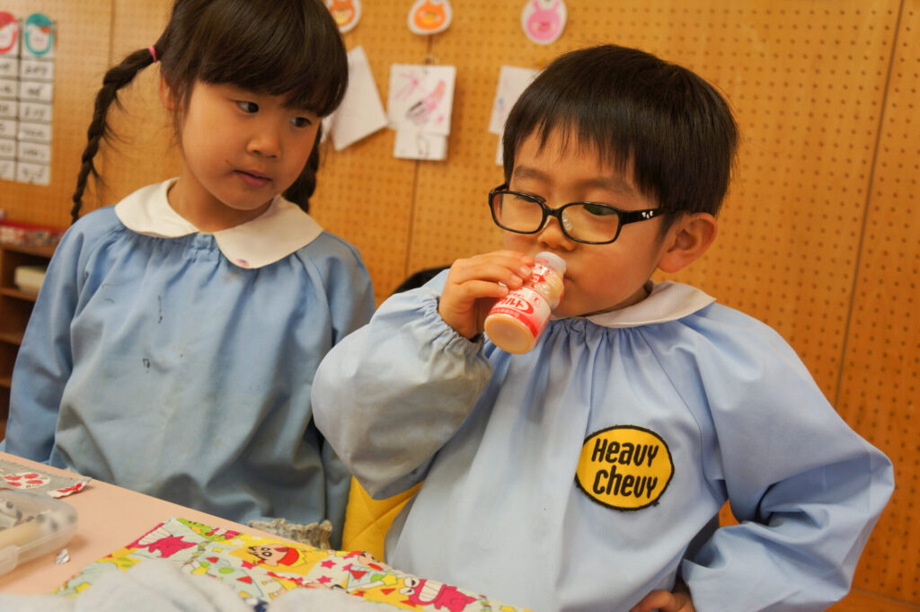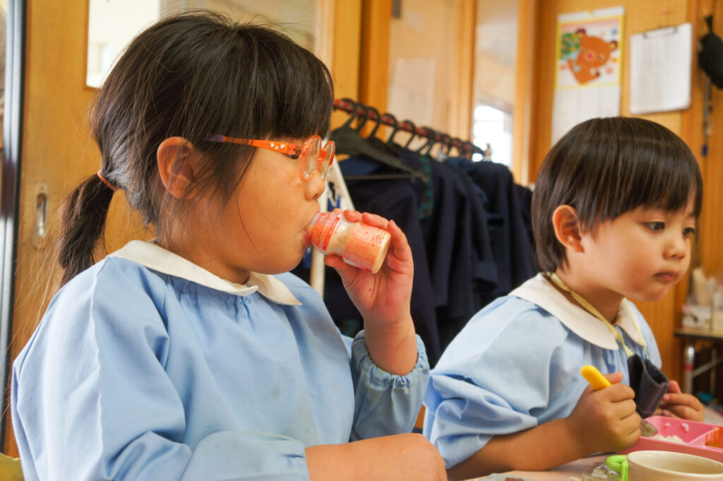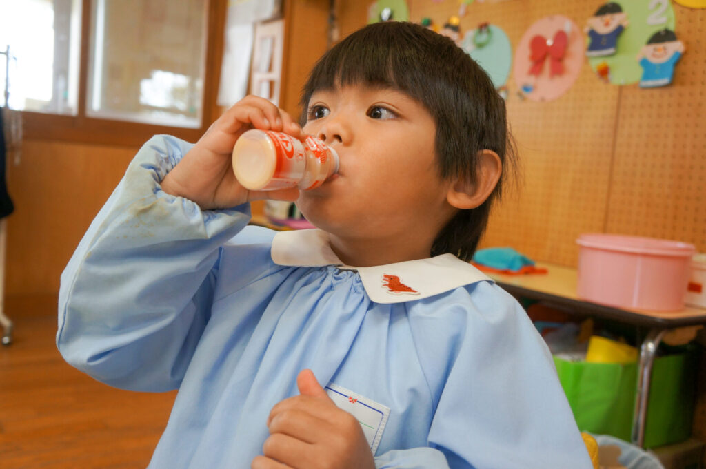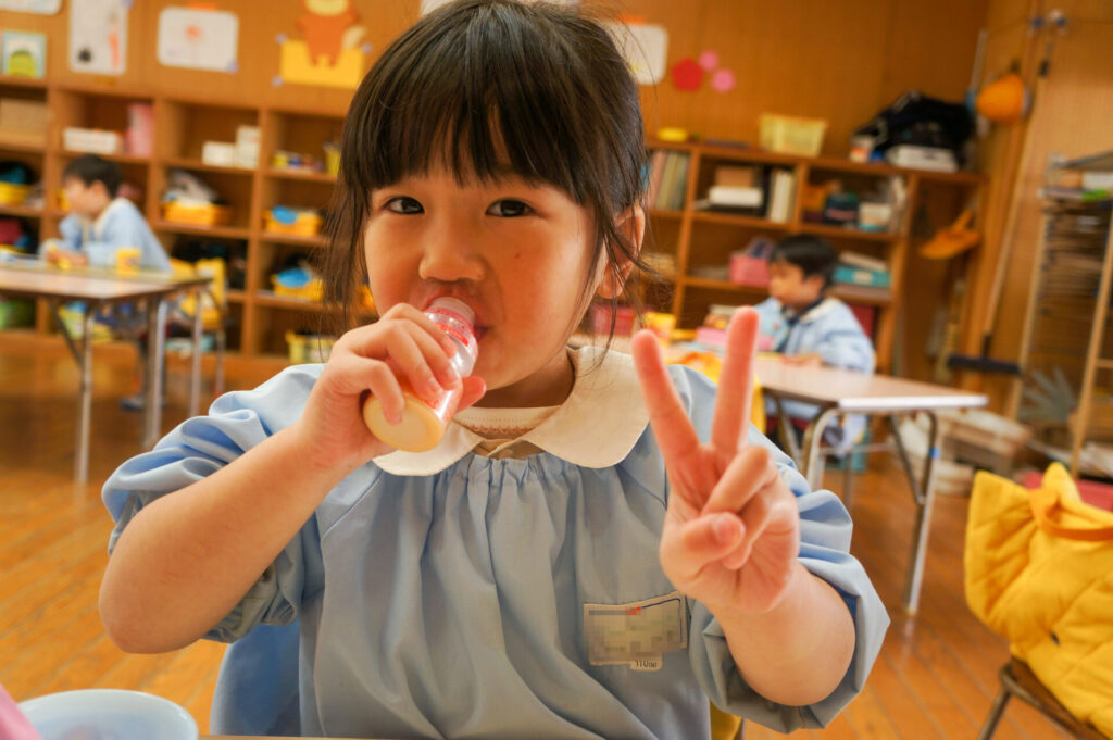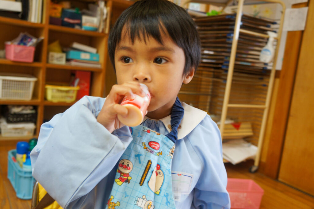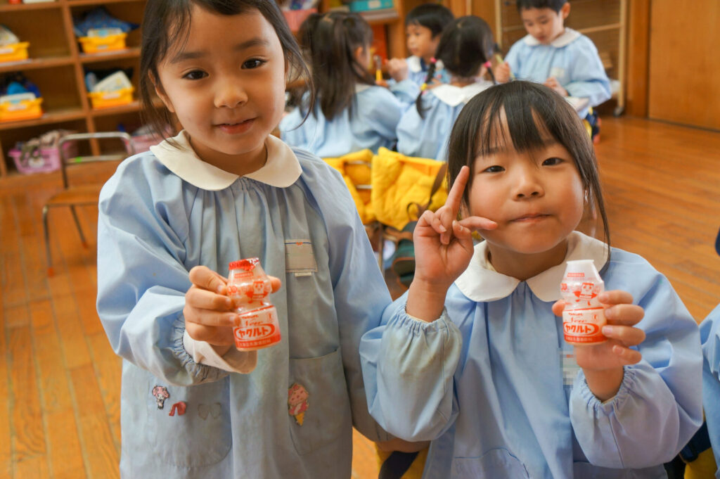 そして、今日の給食!!なんと、ほとんどの子が完食です!苦手な野菜も頑張って「お野菜モグモグ」達成しました。本当にえらかったです!そして、今日は特別にいただいた「ヤクルト」をみんなで飲みました。「美味しいね」と言って喜んで飲んでいて、笑顔いっぱいの子どもたちでした。