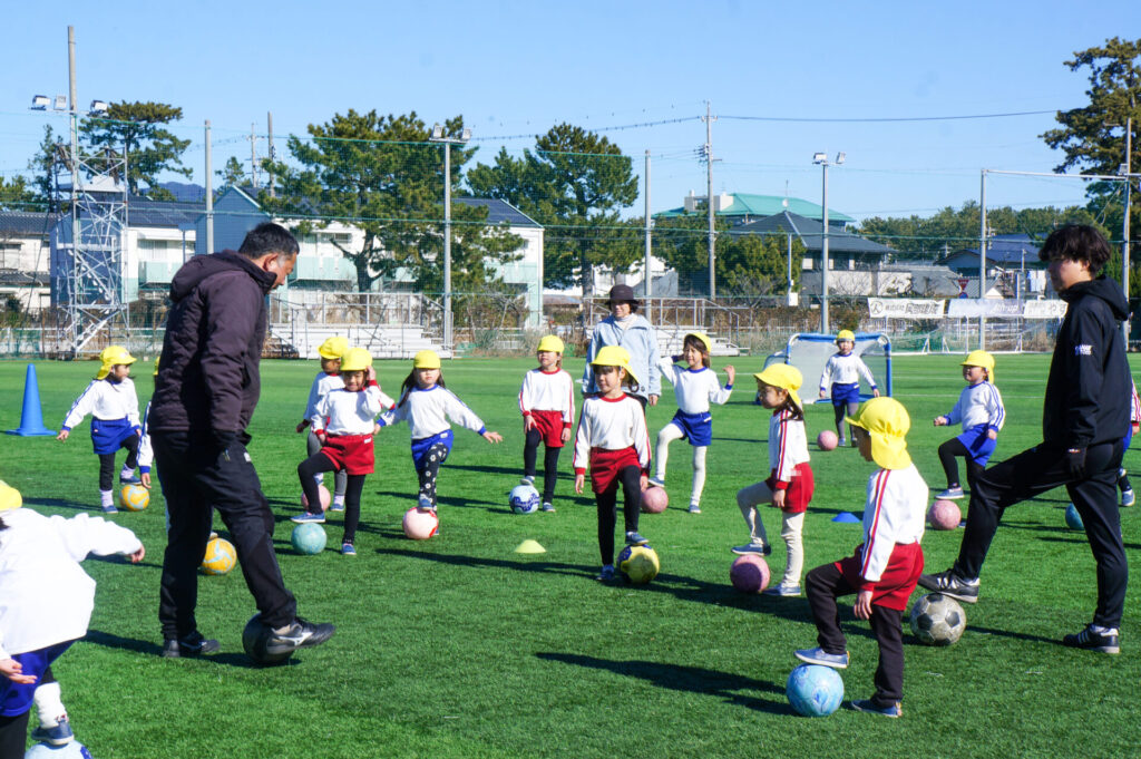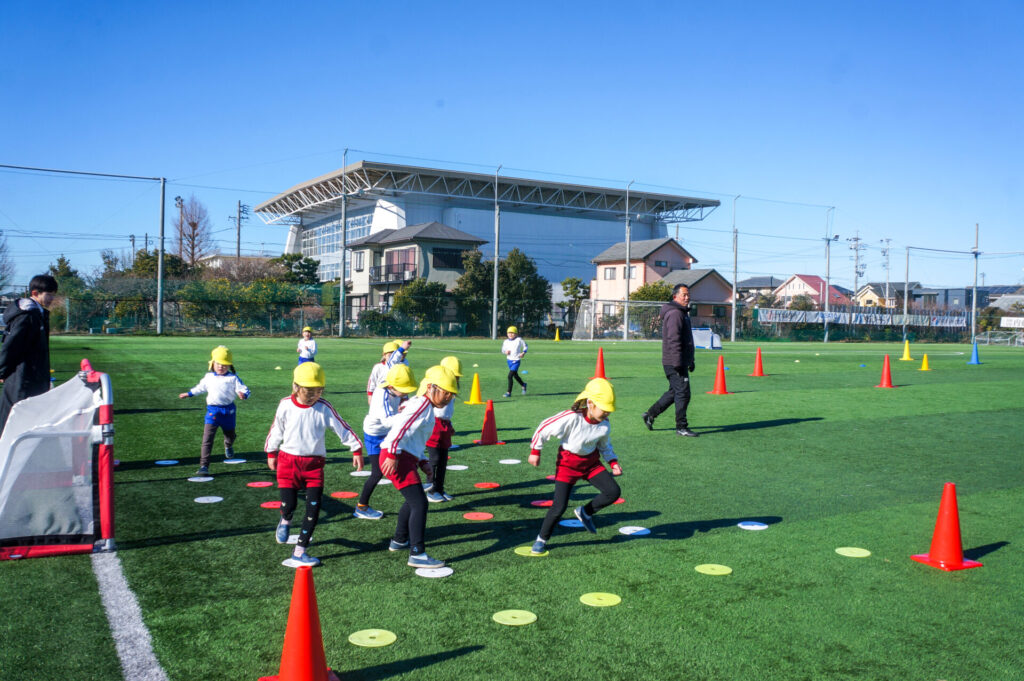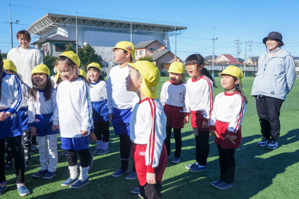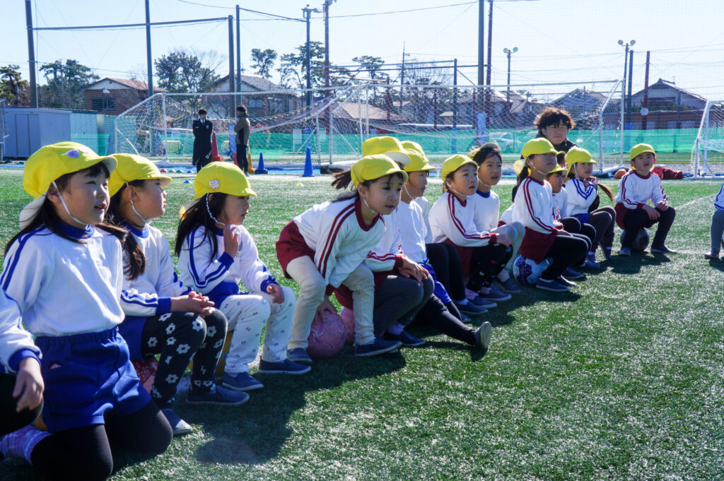 広い広いグランドを見て「すごーい!」と大歓声です!まずはたくさん走って走って、走り回りました。新しくしたばかりの素晴らしい芝生です。転んでも痛くありません。コーチからは「話を最後まで聞くこと」の大切さについて、話がありました。